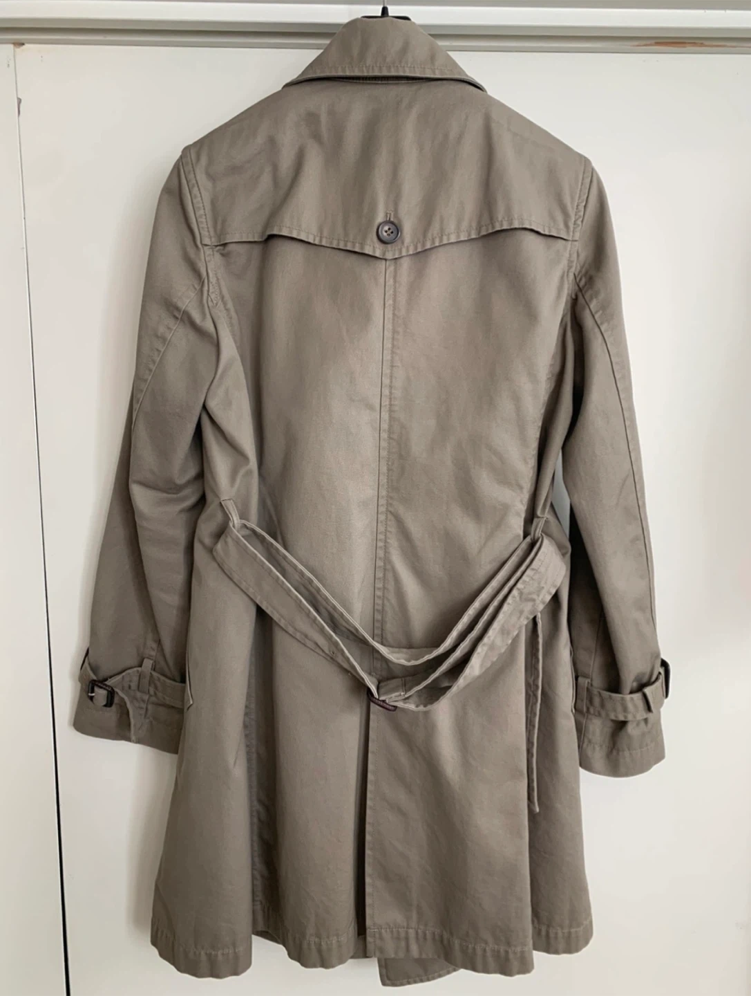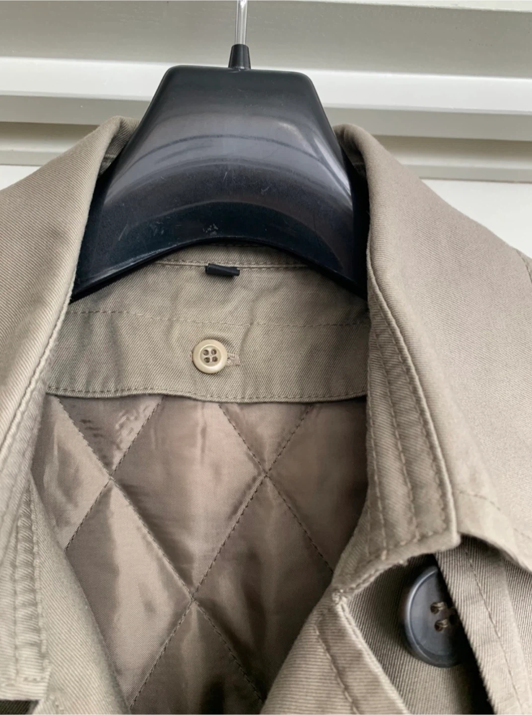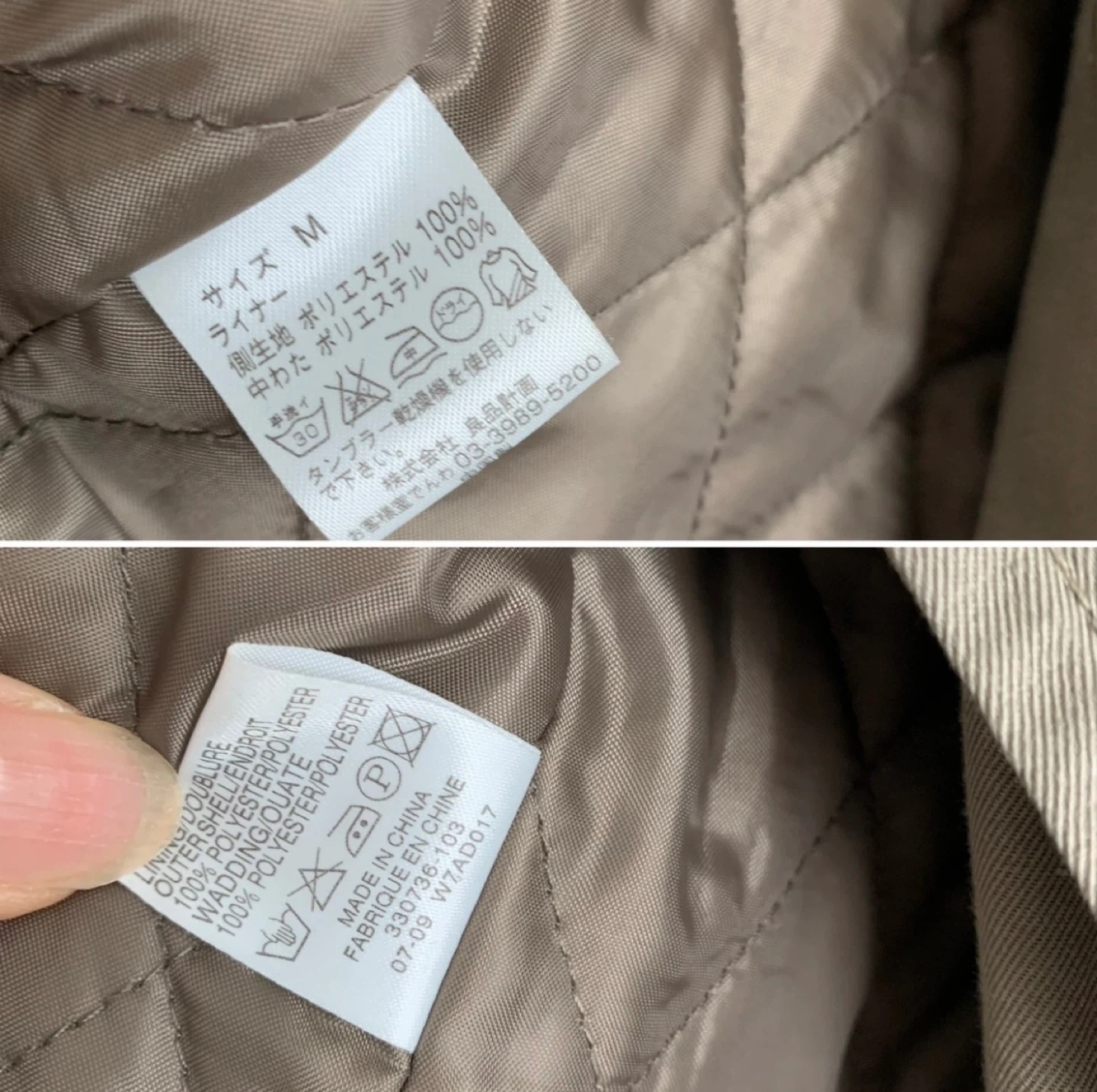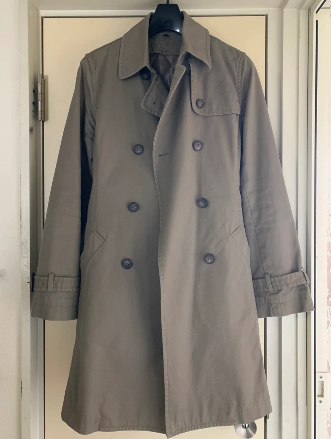 無印良品 MUJI トレンチコート  取外し可能なキルティングのライナー付きです。 【サイズ】 表記 M 肩幅 約36cm 身幅 約46cm 着丈 約90cm 素人採寸ですので、誤差はご容赦ください。 【素材】 本体:コットン100% ライナー:ポリエステル100% 【カラー】 くすみカーキ 写真だと色味がわかりづらいですが、落ち着いたカラーで、コーディネートしやすいと思います。