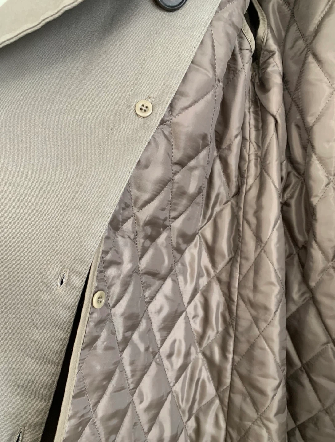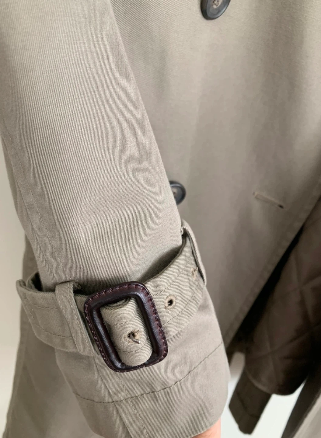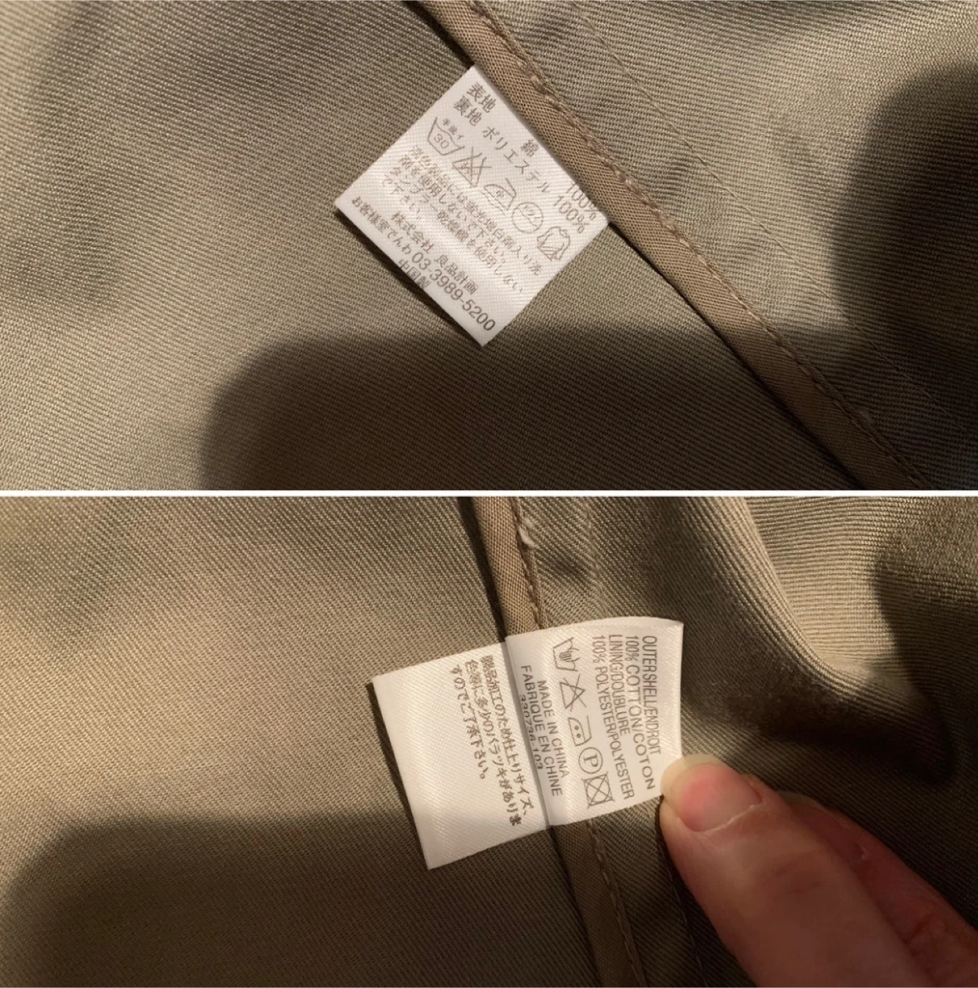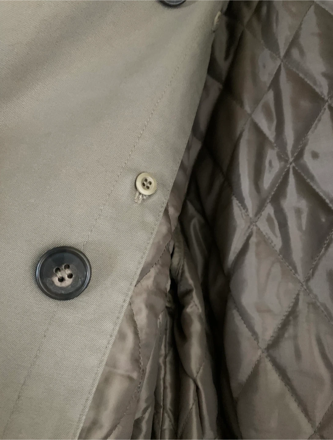 無印良品 MUJI トレンチコート  取外し可能なキルティングのライナー付きです。 【サイズ】 表記 M 肩幅 約36cm 身幅 約46cm 着丈 約90cm 素人採寸ですので、誤差はご容赦ください。 【素材】 本体:コットン100% ライナー:ポリエステル100% 【カラー】 くすみカーキ 写真だと色味がわかりづらいですが、落ち着いたカラーで、コーディネートしやすいと思います。