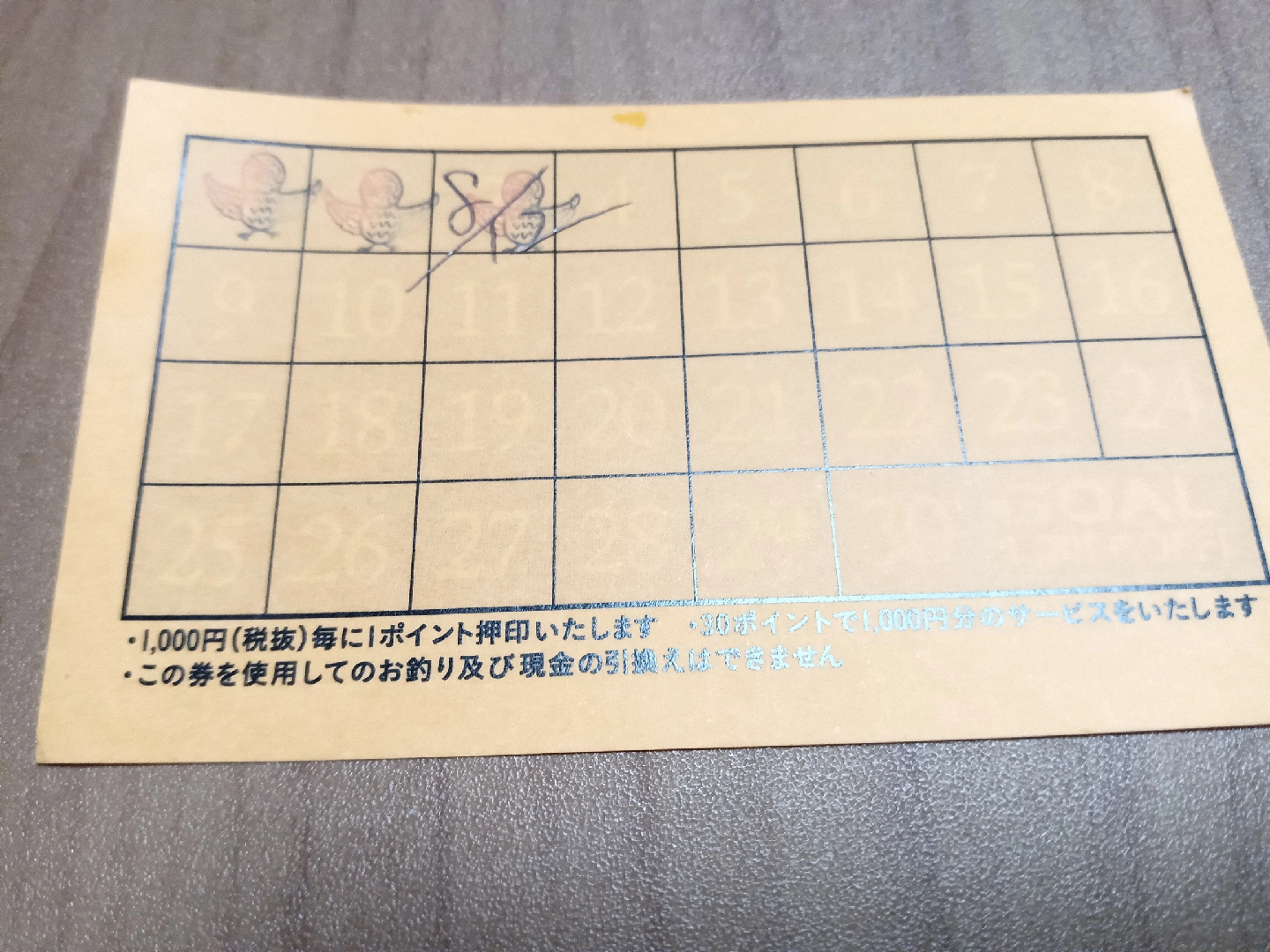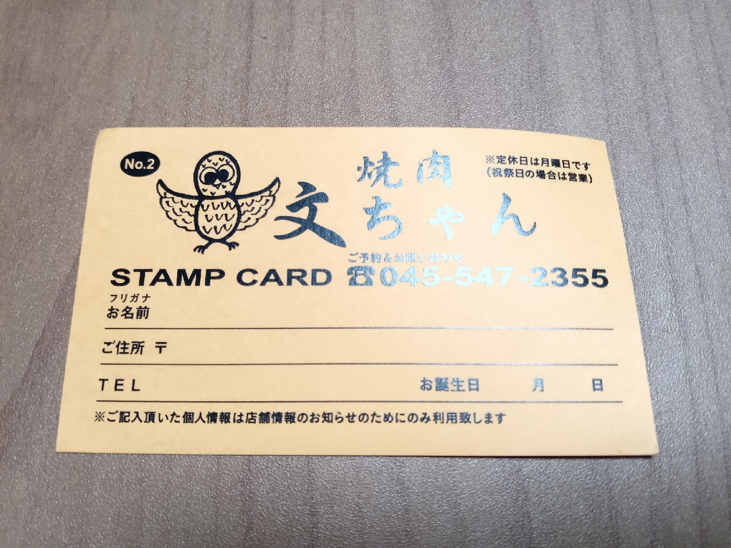 焼肉 文ちゃんのスタンプカードです。 ・スタンプ3個押印済み ・1,000円(税抜)毎に1ポイント押印 ・30ポイントで1,000円分のサービス