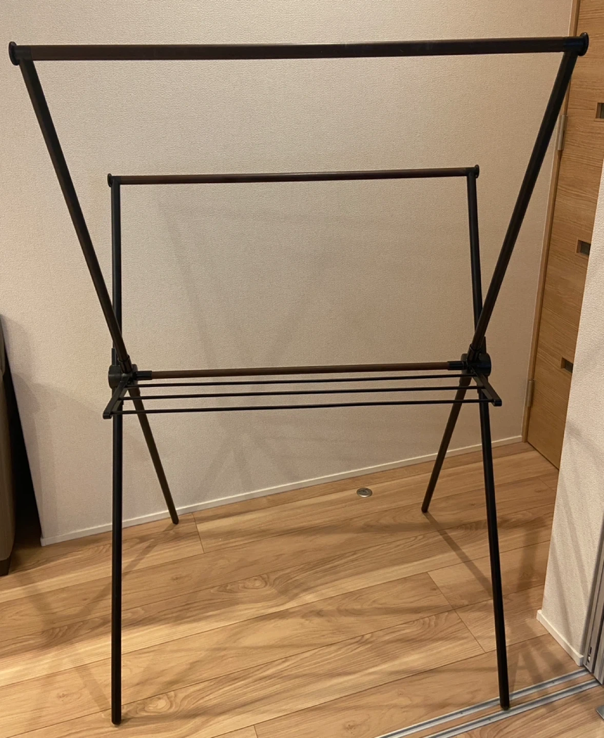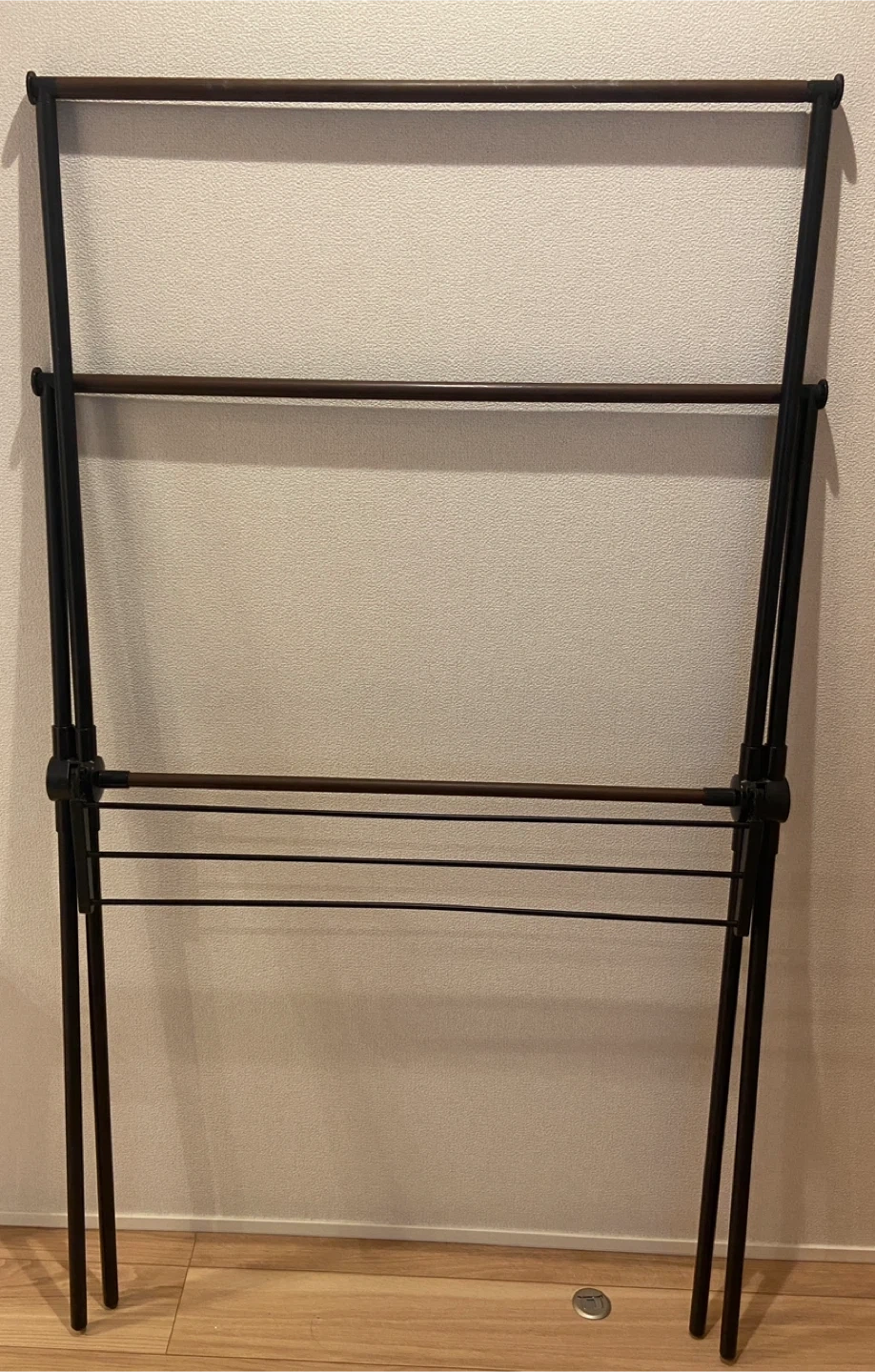 物干しスタンドです。 使用できるスペースがなくなったため出品いたしました。 【カラー】ブラウン&ブラック 【サイズ】 折りたたみ時:高さ約160cm、横幅約93cm、奥行き最大約8cm 展開時:高さ上段約143cm、高さ下段約116cm、横幅約93cm、奥行き足元約75cm、奥行き上部約60cm 【状態】よく見ると少し傷がありますが、全体的にキレイでまたまだ使えます。 ※返品は受け付けておりません。中古品であることご了承の上お買い上げください。 #物干し竿 #部屋干し #洗濯 #折りたたみ