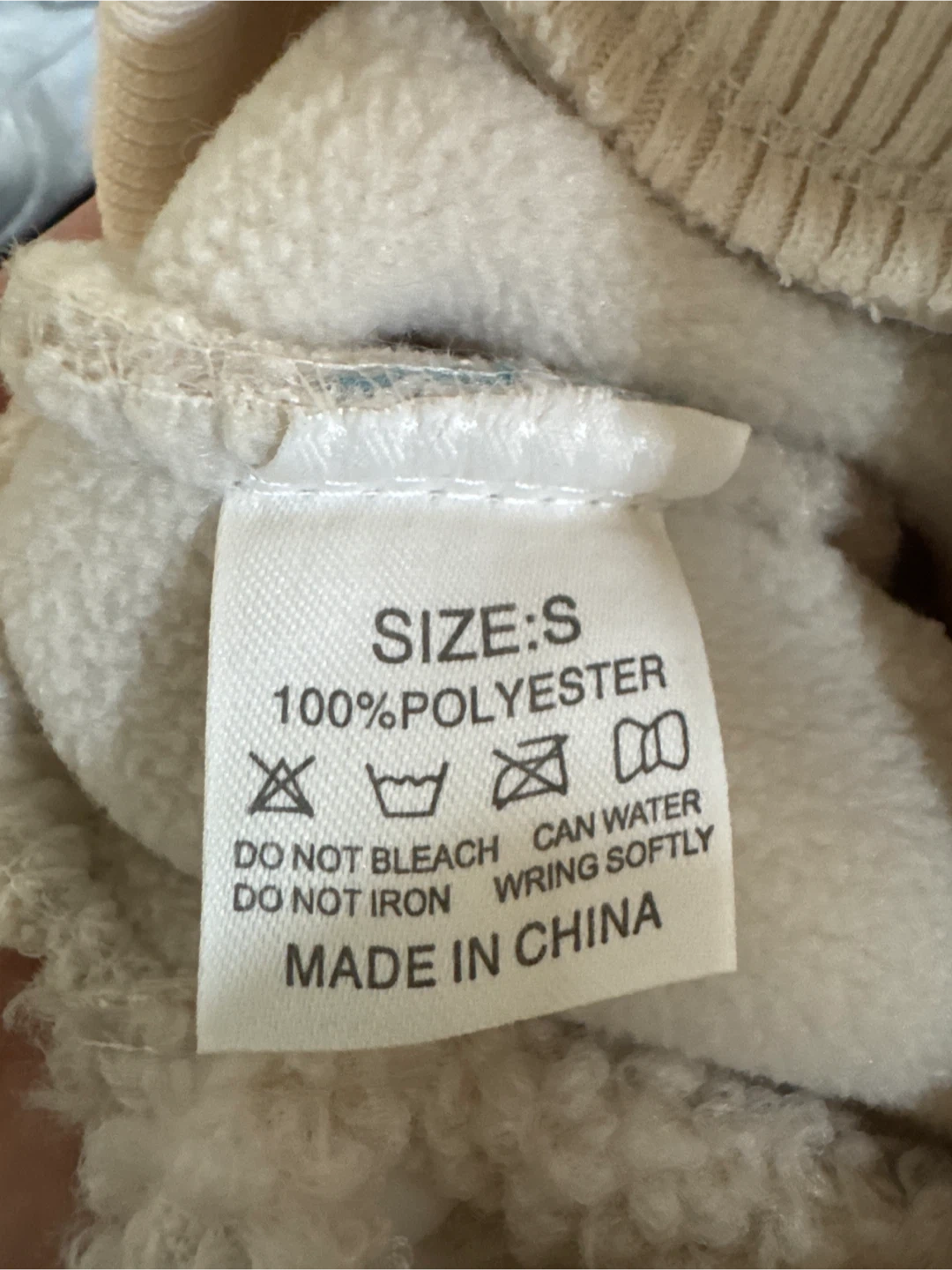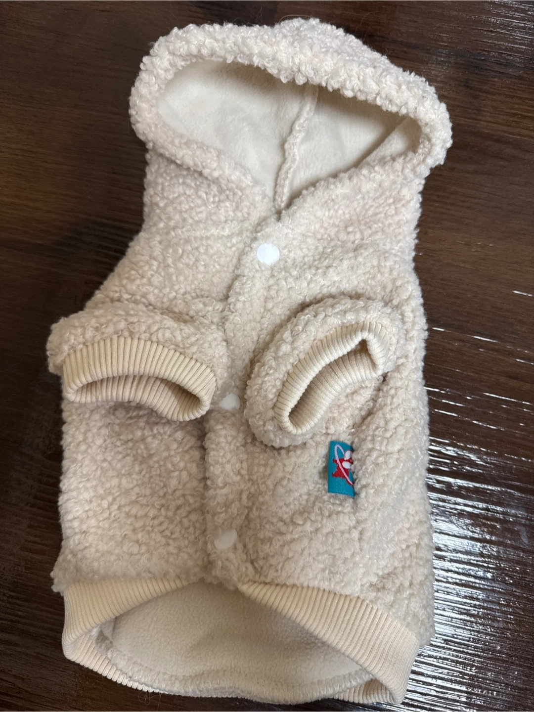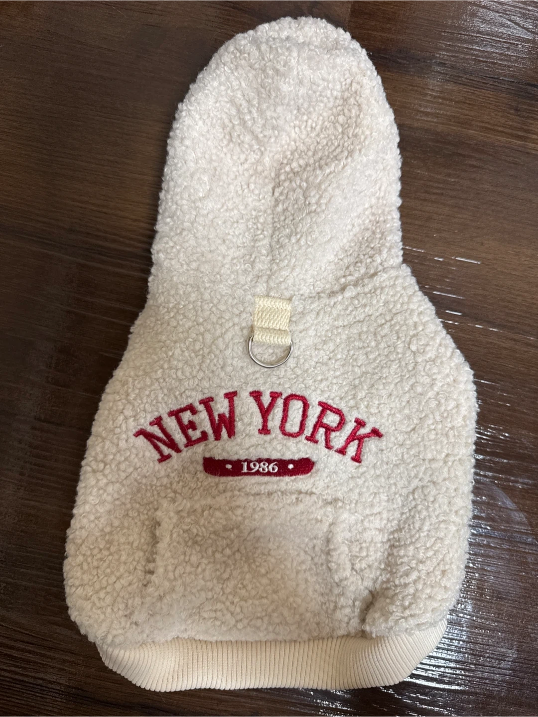 犬用のボアパーカーです ・カラー:ベージュ ・サイズ:S ・素材:ポリエステル100% ・胸に「NEW YORK 1986」の刺繍があります ・中国製 可愛くて購入しましたが サイズが合わなかった為 出品しました。