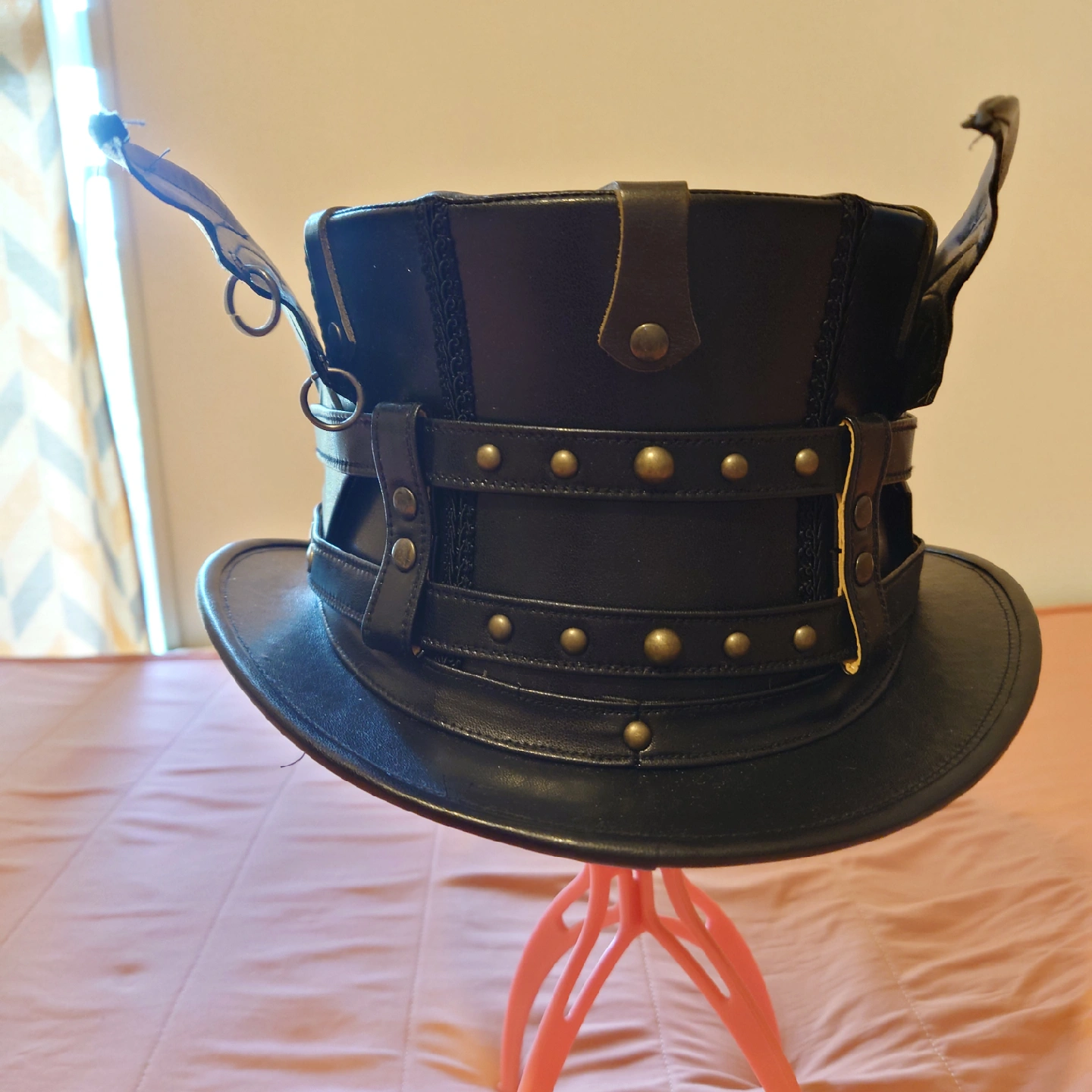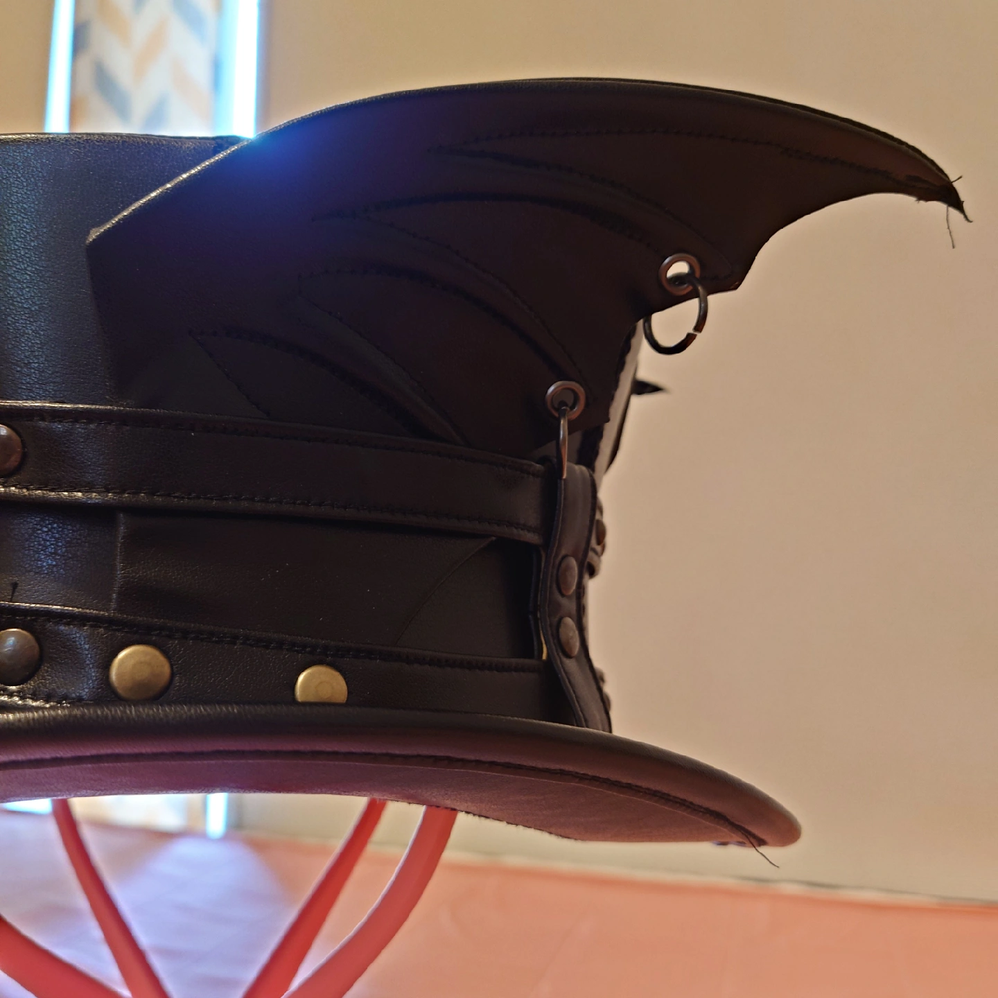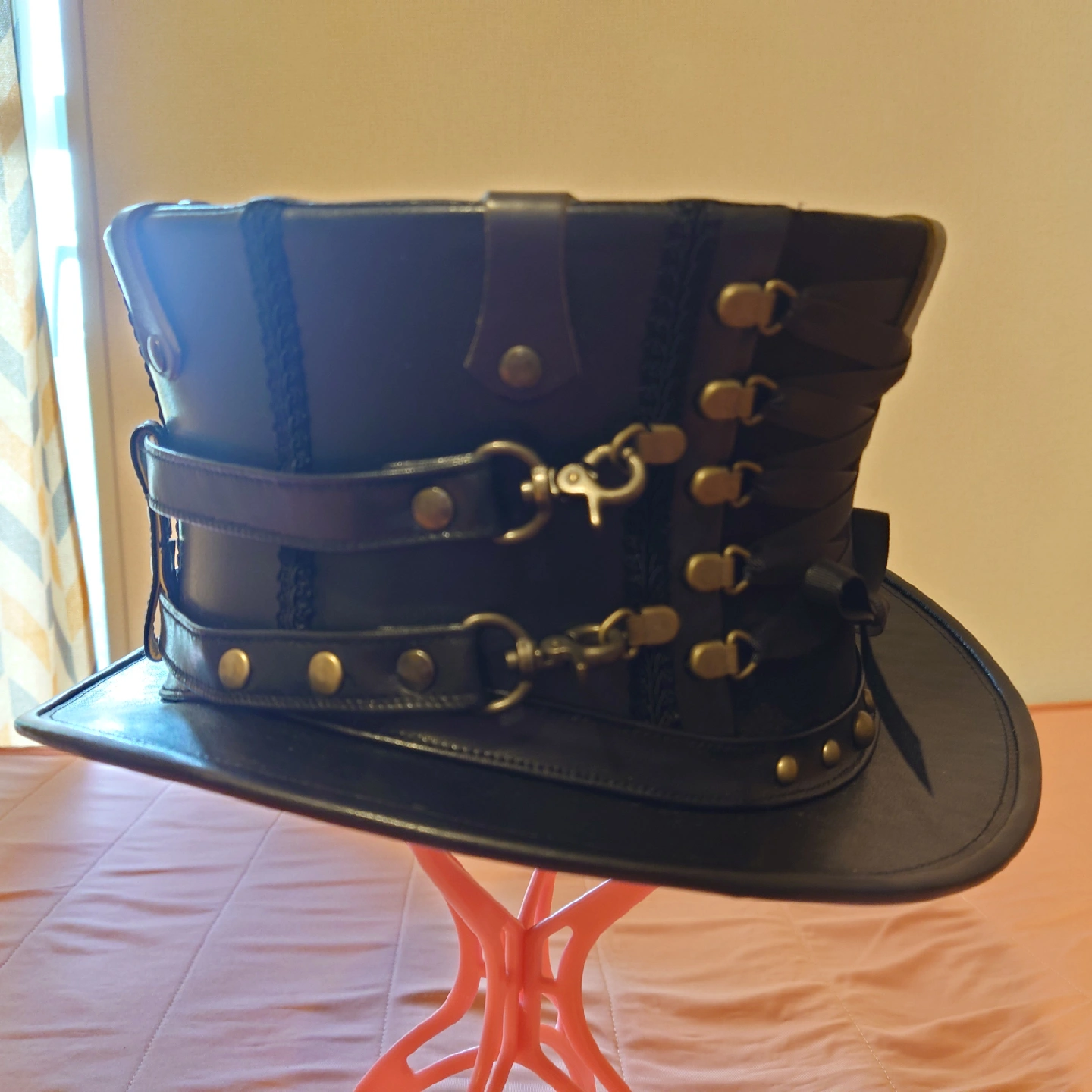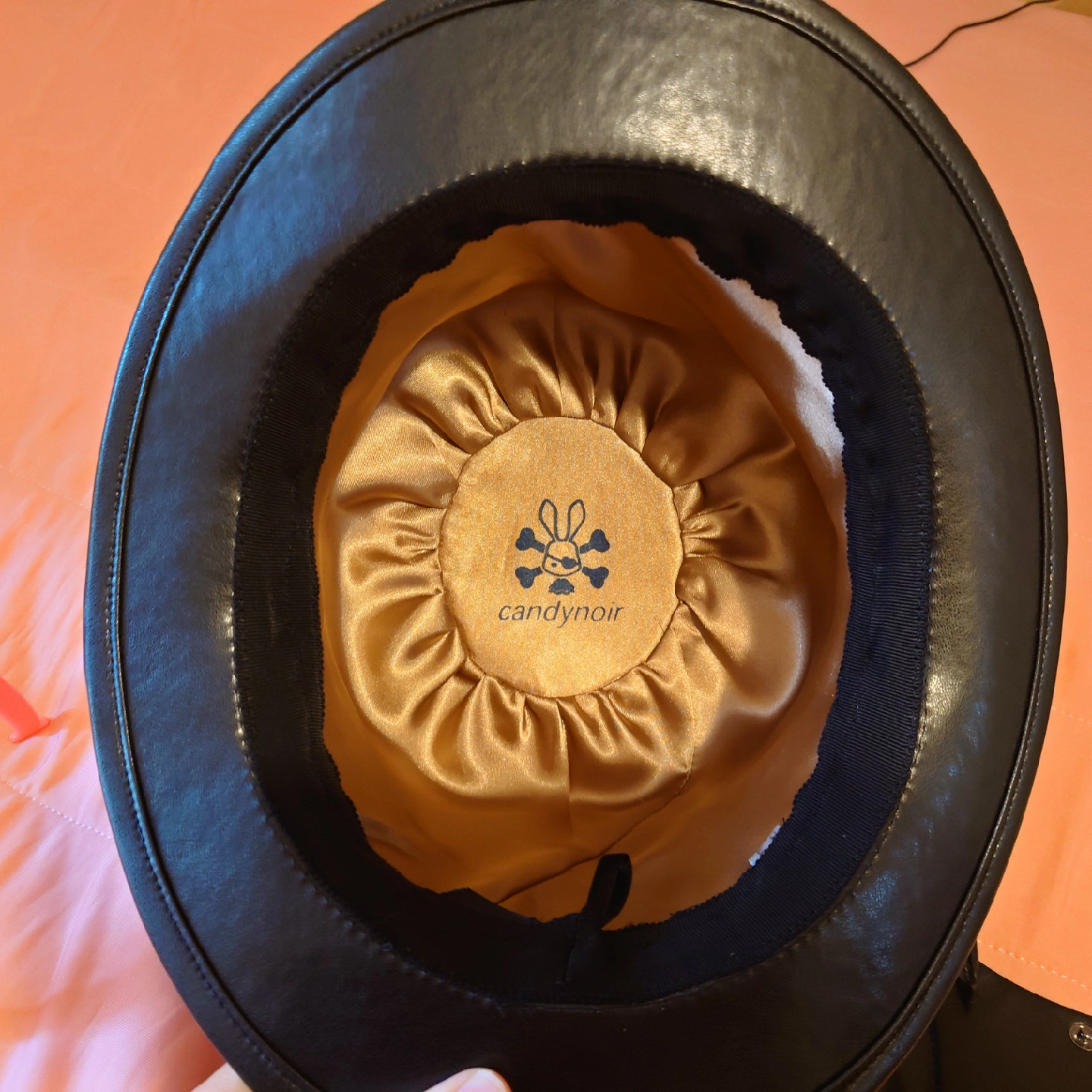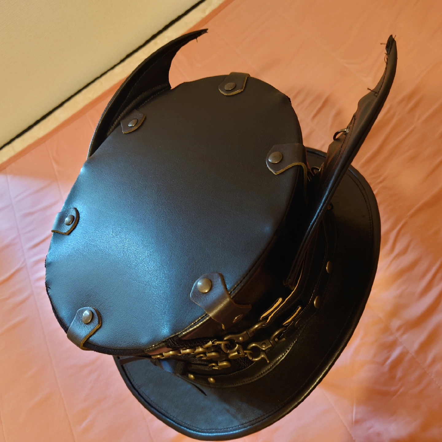 コウモリ翼・Wベルト・コルセットハット サイズ58 ブランド【candvnoir】 男女兼用トップハット。 素材は黒のフェイクレザー、若干光沢があります。 コウモリ翼はスナップボタンで片方づつ取り外し出来ます。 ベルトも取り外し可能。 ①コウモリ翼付き ②コウモリ翼なしのWベルト付き ③ベルト無し の3ウェイでお楽しみいただけます。 素人採寸ですが クラウンの高さは 前後部分13.5cm、サイド部分11.5cm。 ブリム幅は横3.5cm、縦4cm。 表生地 フェイクレザー製 裏地 ポリエステル 100%、 6個あるコーナーガード黒の天然皮革製。 サイズ/58cm 数年前にデザフェスで一目惚れして購入。 室内試着のみで保管してありましたが 装う機会のある方へお譲りしたく出品します。 試着のみですが一応中古品としてご了承の上でお取引お願いします。 ハロウィンやゴシック系イベントにいかがでしょうか。 ご希望の方はお気軽にご連絡ください。 メルカリでも送料込みオークション形式で出品中ですが キャロットはお安くだしています。