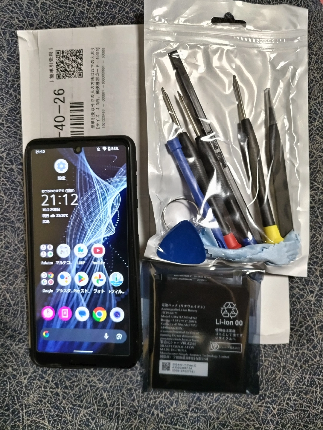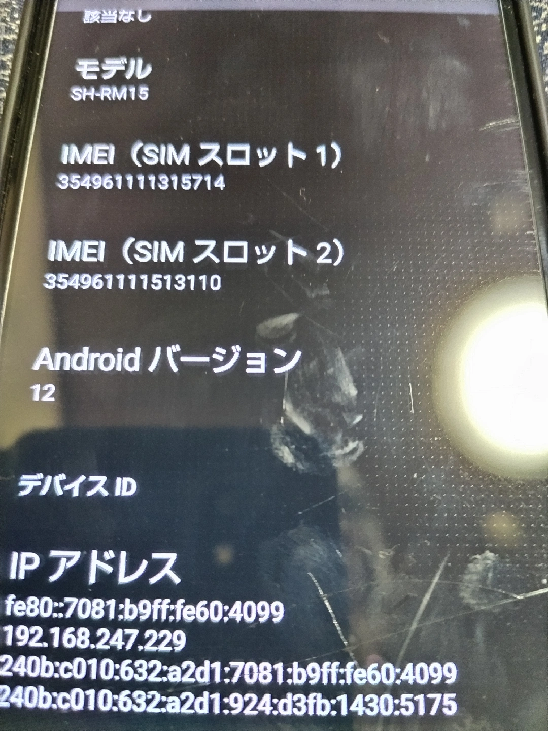 シャープのAQUOS SH-RM15です 【情報】 ブランド:シャープ モデル:SH-RM15 Androidバージョン:12 9/25に中古ショップで購入したものです。黒色です。楽天モバイルで使用していました。 Androidバージョン12 IMEIは写真3 裏に購入したお店のシールが貼ってあります。 本体にキズや下部に画面が割れがありますが、気にならない方に。タッチや動作などは問題ありません。 画面とカメラにELECOM製のガラスフィルムを貼り付けました。ソフトカバーもそのままお付けします。 バッテリー持ちが悪い気がしますので、購入したばかりのバッテリー(純正同等品、工具つき)をオマケでお付け致します。 値下げ、返品、苦情はご容赦下さい。 よろしくお願いいたします。
