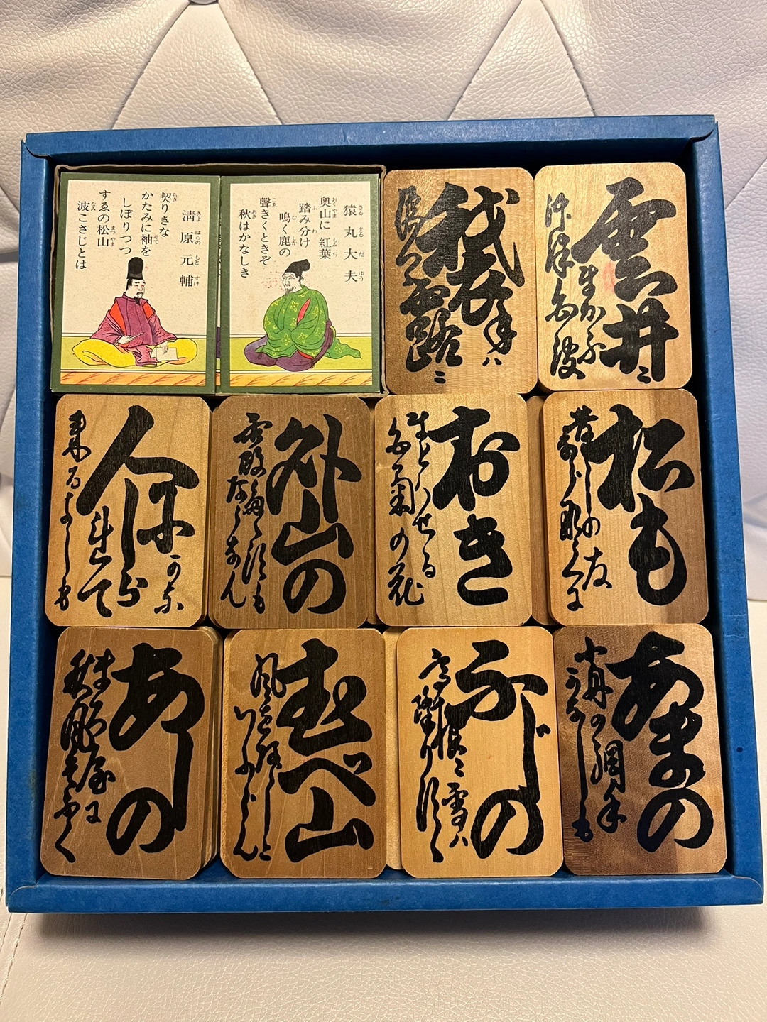 実家にあった物です。箱に記名あり。板の裏、一枚一枚に名前のハンコが押してあります。