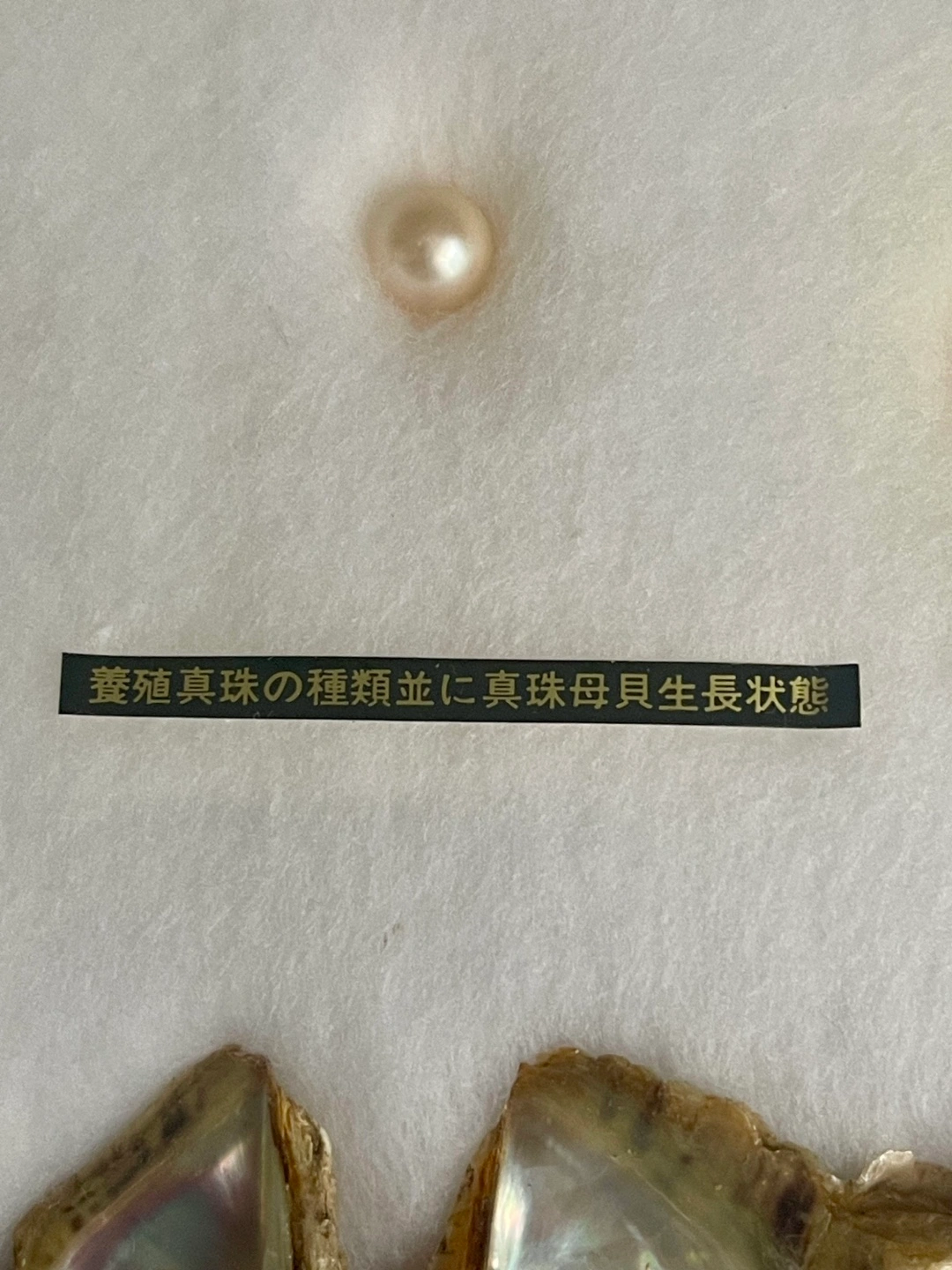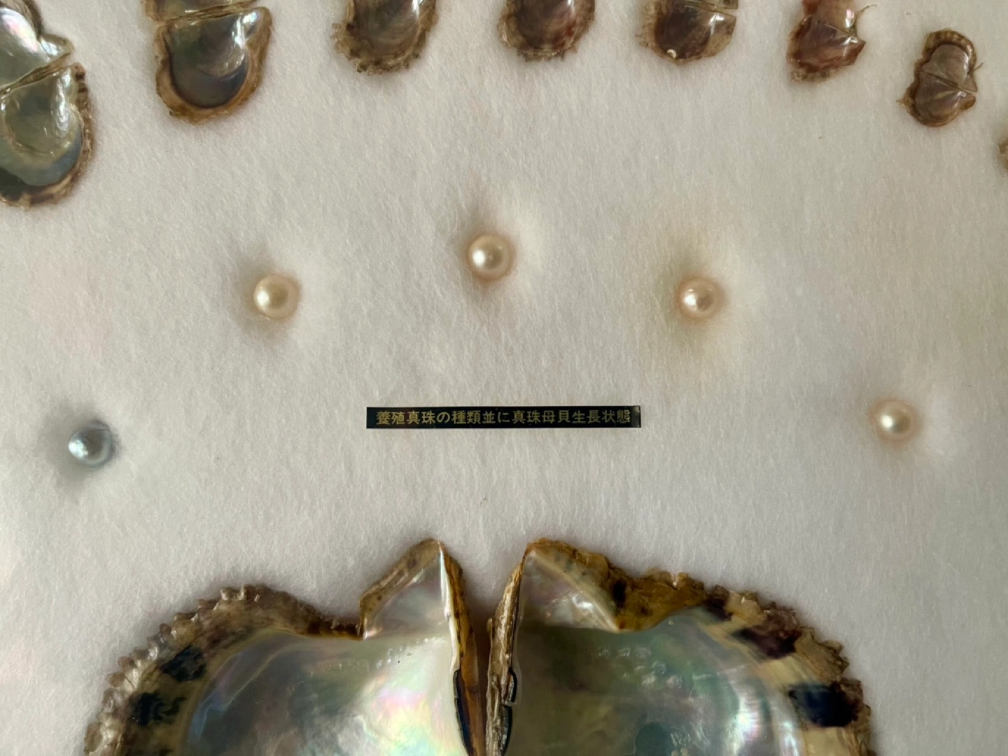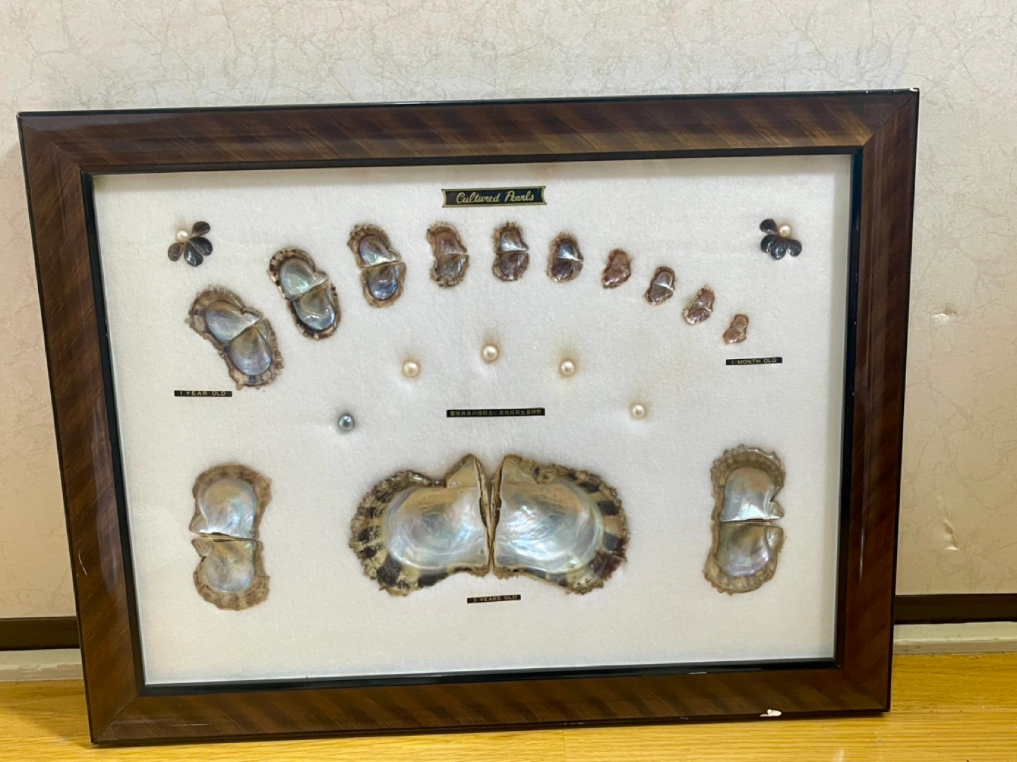 養殖真珠の母貝の成長過程が真珠と共に飾られた額です。 1ケ月目の貝殻から3年目迄の貝殻と 中央に大きめの真珠が5個と両端に小さめの物が2個飾られています。 額縁に欠け有り #本真珠 #真珠