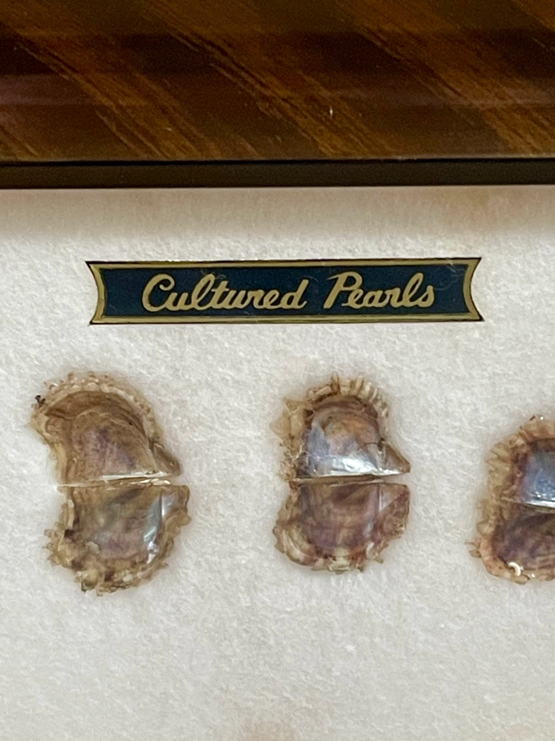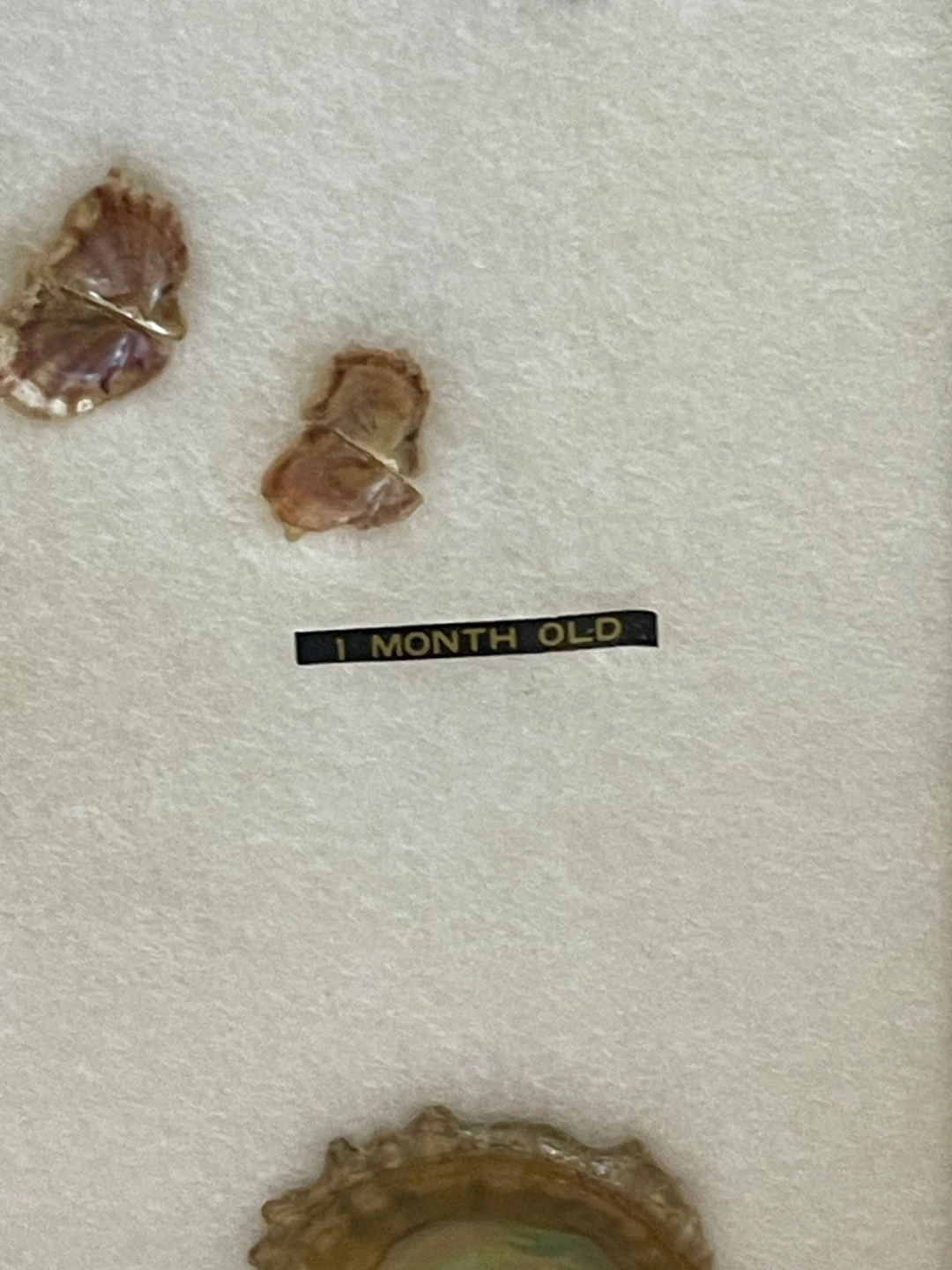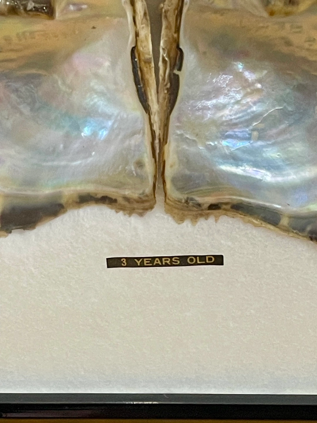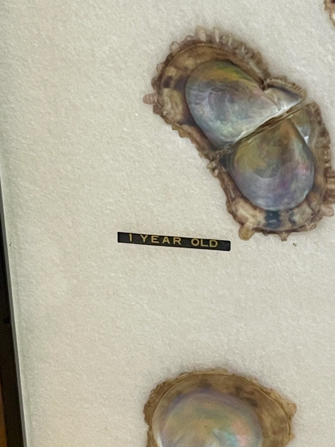 養殖真珠の母貝の成長過程が真珠と共に飾られた額です。 1ケ月目の貝殻から3年目迄の貝殻と 中央に大きめの真珠が5個と両端に小さめの物が2個飾られています。 額縁に欠け有り #本真珠 #真珠