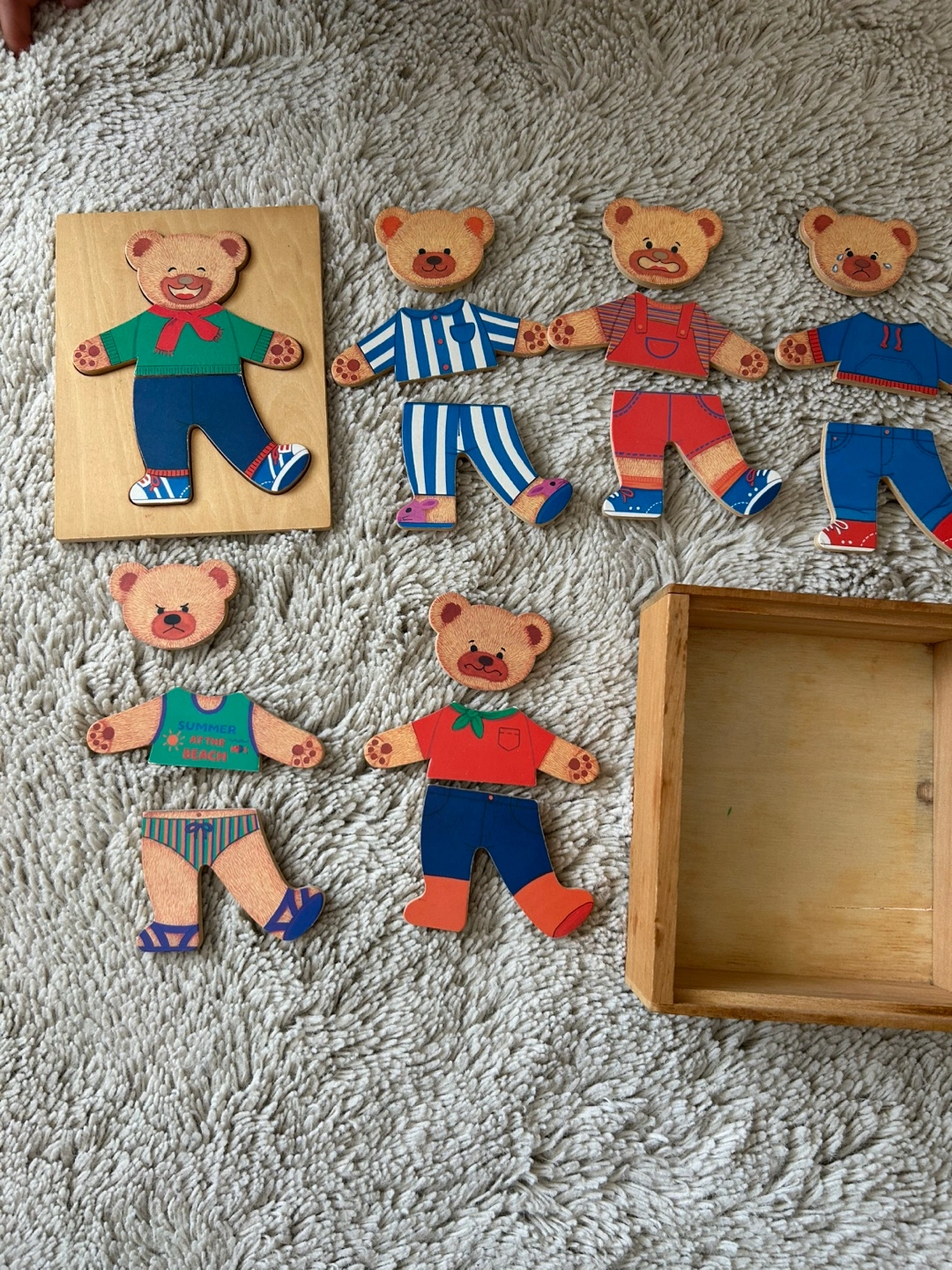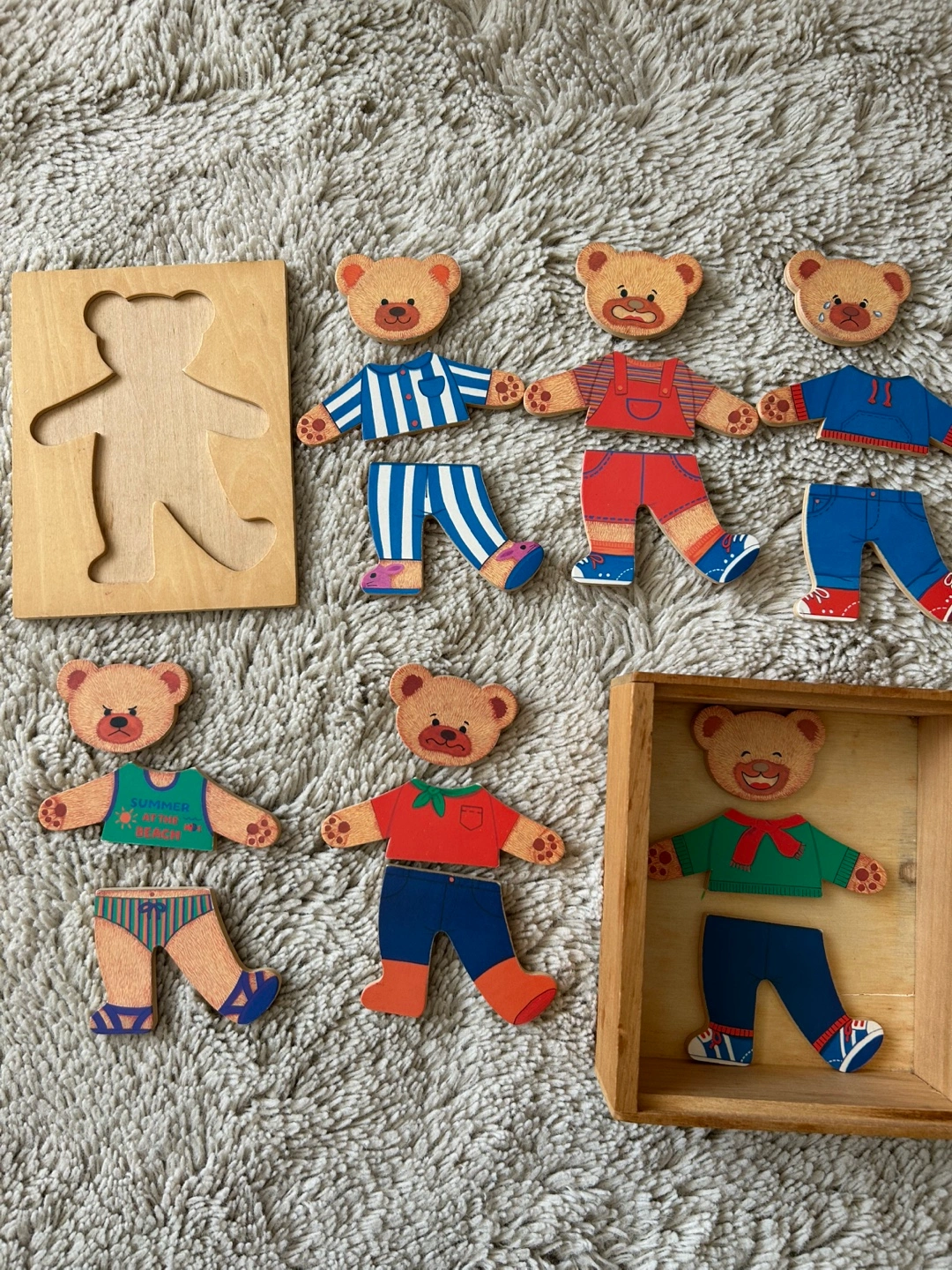 木製の可愛らしい 型はめパズル くまさんの表情違いのお顔と トップスとズボンを色々組み合わせて とっても楽しく遊んでました。