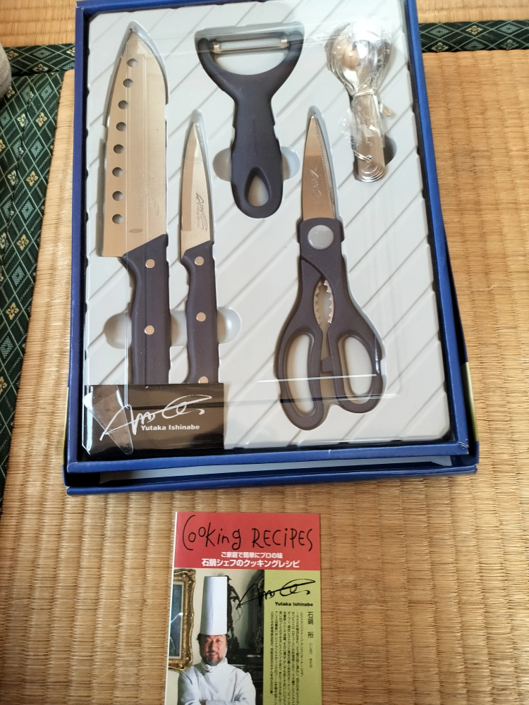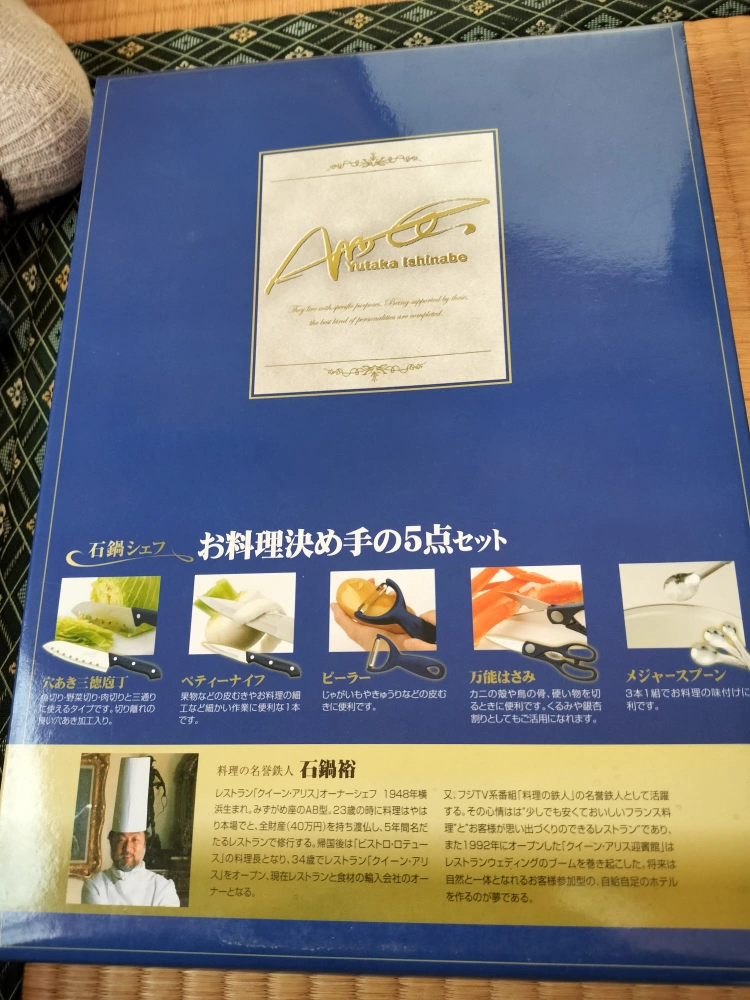 石鍋シェフの調理器具5点セットです。 【情報】 ブランド:石鍋シェフ (Yutaka Ishinabe) 内容:包丁、ペティナイフ、ピーラー、万能はさみ、メジャースプーン 【状態】 未使用品 【付属品】 箱、レシピブック 中古品であることご了承ください