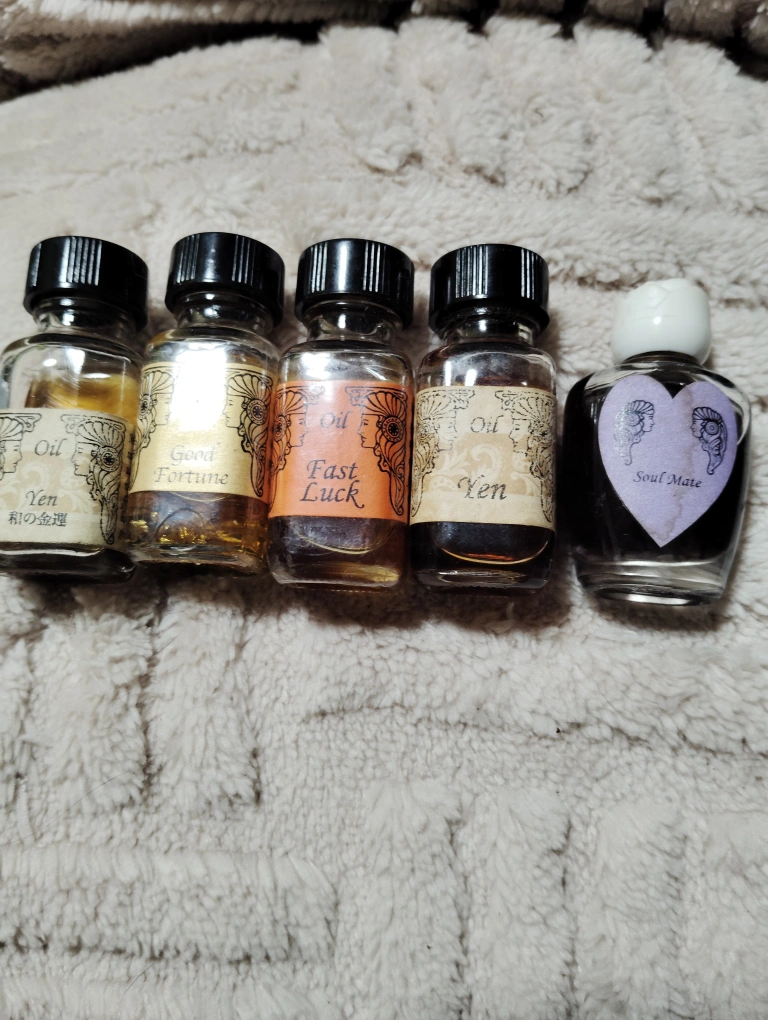 アンシェントメモリーオイル5点セットです✨ 大体半分以上入っています。 開封使用品ですので、ご理解頂けます方に。 💞和の金運 💞Yen 💞Good fortune 💞Fast Luck 💞Soul mate 1本1800円から3500円の品です✨ プロフィールお読みください😊