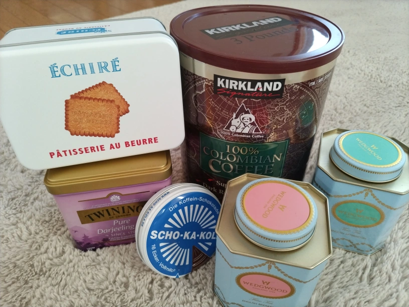 あたたかさ空き缶 ウェッジウッド紅茶缶2個 ECHIREエシレクッキー缶 トワイニング紅茶缶 ショカコーラチョコ缶 コストコKARKLAND コーヒー缶 空ですが空き缶サビが出るので水洗いしていません