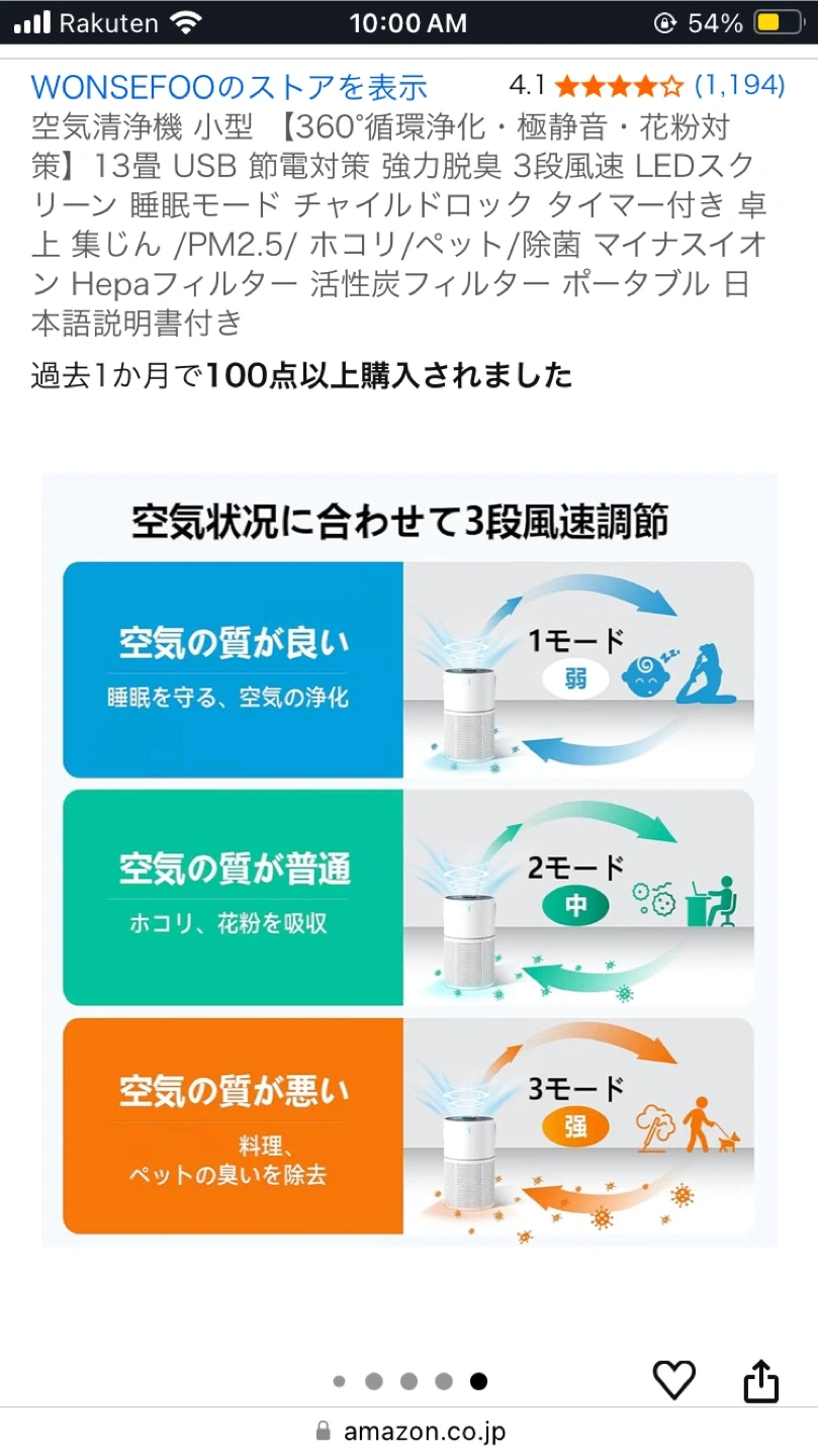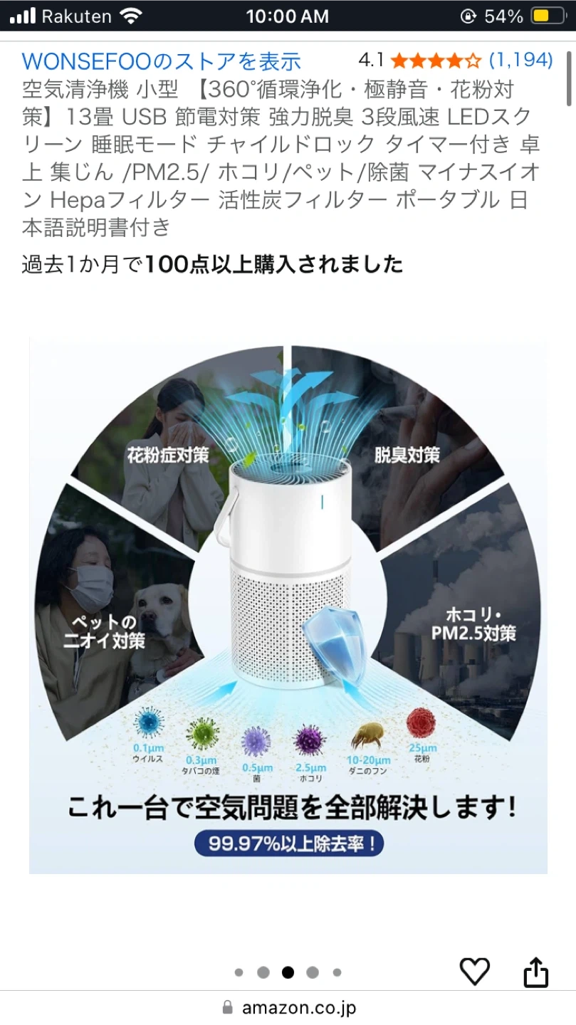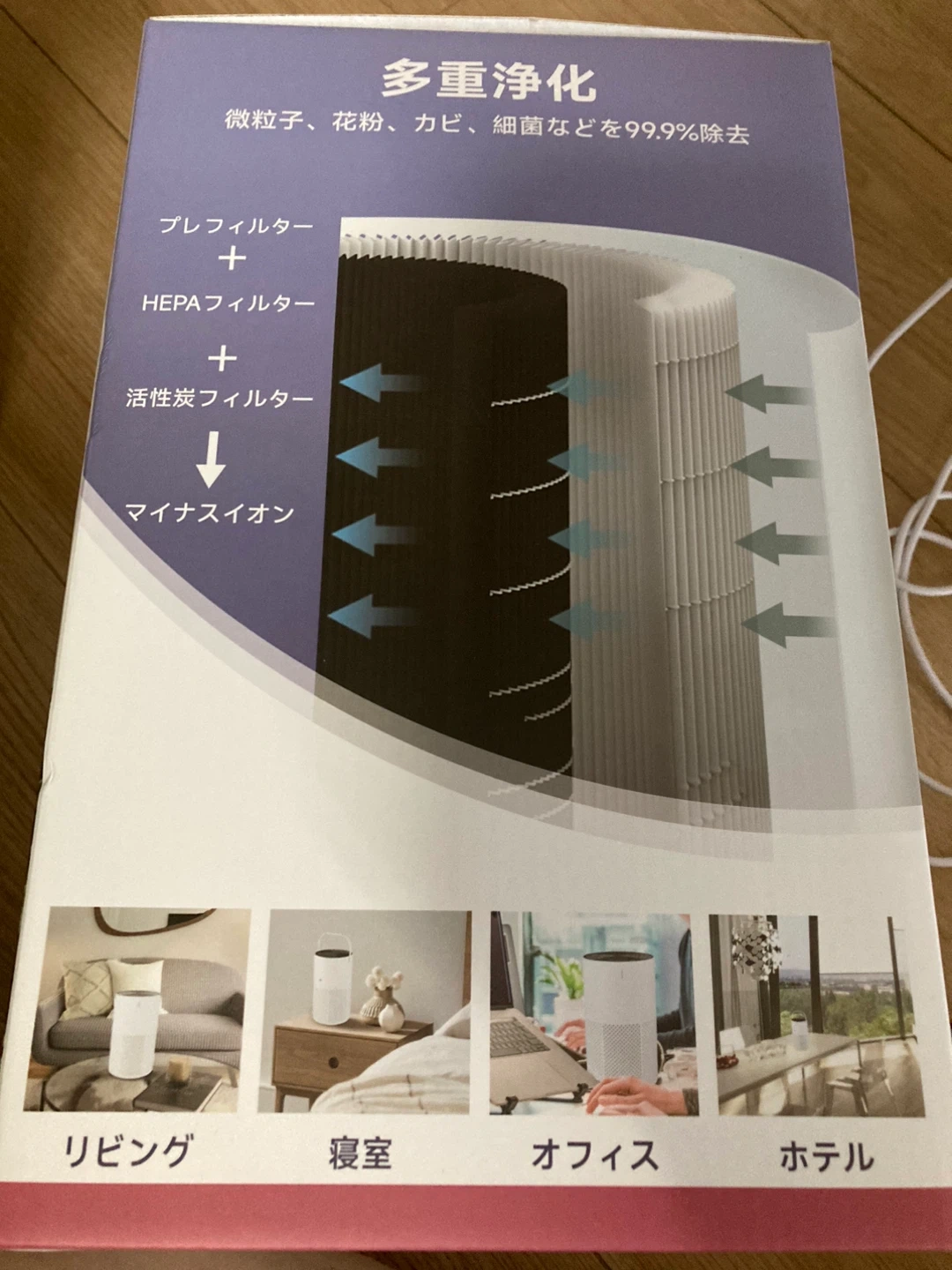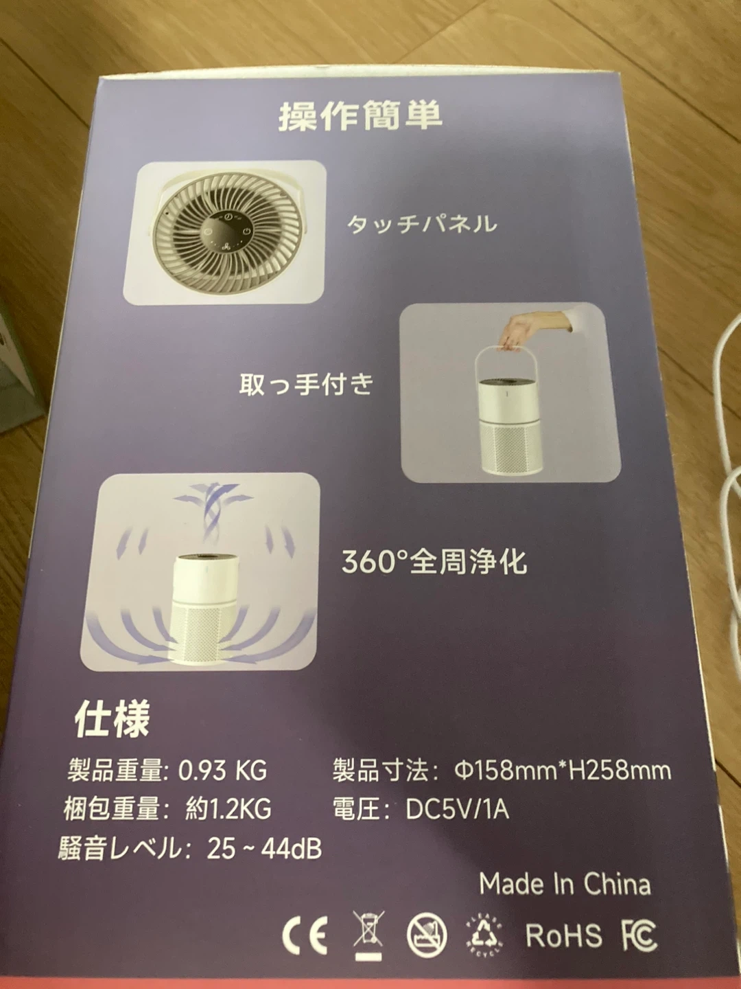 8千円くらいで購入して、2-3回使いました。 下記、購入したアマゾンでの説明です。 ブランド WONSEFOO 商品の寸法 19奥行き x 19幅 x 30高さ cm 電源 USB給電(アダプターは付きませ ん。5V1AのACアダプターを使用し てください。) 商品の重量 1 キログラム 制御方法 タッチ 🌿【プロ仕様空気清浄機・360°全方位で強力な浄化】花粉、ウイルス、菌、ホコリ、カビ、アレルゲン、PM2.5、抜け毛、ペット臭、生乾き臭など空気問題を重視し部屋用 空気清浄機として空気をキレイにします。集塵量を従来型空気清浄機より2倍増の静電hepaフィルターは、花粉・ホコリ・アレルゲン・カビ・ハウスダスト・PM2.5など、0.1μmまでの微細粒子を99.97%除去できます。0.1μmの微粒子の除去率は99.97%まで、除菌率はさらに99.99%になるです。特に花粉・ハウスダスト・ウイルスなどの除去に効果が良い、部屋を漂う花粉をキャッチして飛散量を減らせるため、快適な空間作りに役立ちます。鼻のかゆみの緩和などに役立ちます。 🌸【ペット専用・強力脱臭フィルターで生活臭を徹底除去】弊社の空気清浄機はニオイに特化したものです。消臭 脱臭 高品質一体化多層ハイグレードフィルダーを採用して、プレフィルダー、静電hepaフィルター、特化した活性炭フィルターの組み合わせで、しっかりと空気を強力に浄化できます。脱臭専用の高吸着性活性炭フィルターにより、空気清浄機はやペットの臭い、生活臭、料理臭、玄関のニオイなどのニオイを解消まで幅広く活躍します。特に、ペットの尿臭や体臭などに向け特化した脱臭 空気清浄機です。また、空気中の浮遊するウイルス・細菌・有害物質も高性能フィルダーで捕らえ、ご家族全員の健康を守ります。※なお、本品は加湿 空気清浄機ではありません。加湿型の空気清浄機に湿気が多くてかびの温床となり、フィルダーなどにカビが発生しやすいです。空気清浄機 に加湿器 がない、本製品には加湿機能はございません。除湿加湿器 一体型ではありません。 💰【超省エネ設計・1日たった2円】夏の雨季に、空気清浄機が大活躍します!連日雨が続くの場合、雑菌が繫殖しやく、湿気やカビ、部屋干しの臭いとニオイなど、ただ一台の空気清浄機で、空気問題から一気解放されましょう!最新型省エネ 空気清浄機なので、消費電力は3W以下です。一時間当たり電気代の目安は最大0.078円です(ご契約の電力会社による)。電気代は激安です!24時間付けっぱなしでも2円未満です。電気代高騰の時代に、節約しながらストレスフリー!円筒形空気清浄機は全周から360度空気を吸引して、吸引力がアップされて効率的に浄化でき、風量を最大にすれば6畳の部屋で1時間に4回の空気入れ替えが可能。ジメジメした雨季でモヤモヤする空気をフレッシュに改善しようとする方々は、空気清浄機 おすすめ!ぜひ弊社の空気清浄機をお試しください。 🔇【図書館より静音&自動消灯・光と音のストレスゼロ】独自開発した静音技術と最新のデザインで運転ノイズを最小限にコントロールされました。25dB程度に抑え、図書館よりも静か!おやすみモードで稼働させた場合、3秒間無操作なら、ライトは自動的に消えるので、音や光に非常に敏感な赤ちゃんもペットもぐっすり眠れます。音が静かな空気清浄機なら、日中はもちろん夜間にも安心して運転できます。静音性の高い空気清浄機を求めるのであれば、小型 空気清浄機 おすすめです。また、空気清浄機には、強風量モード・中風量モード・おやすみモードの3段階調節が可能です。空気品質に応じて風速を変更し、省エネにも貢献します。空気清浄機・一人暮らし・1ルームの小スペースはもちろん、職場やリビングのような広い空間でも問題なくご利用いただけます。 ⏰【タイマー機能&チャイルドロック搭載で便利&安心】空気清浄機に分かりやすいタッチパネルを搭載しました。ワンタッチで簡単な操作は人気空気清浄機の秘密です。2h→4h→8hタイマー機能があり、設定した時間が過ぎると空気清浄機が自動的にオフになります。電力の無駄遣いがなく、家事や仕事、外出時も安心です。φ15.8cm*25.8cmのコンパクト設計で、サイズ感がないので、テーブルの上に置いても違和感がありません。空気清浄機の重さが僅か1キロ、持ち運びも簡単です。本体に取っ手付きので、どこに移動してもラクラク。また、誤操作を防ぐチャイルドロック機能も搭載し、お子様やペットがいる家庭でも安心にお使えいただけます。※チャイルドロックをかけると、ロックを解除する以外の操作はできなくなります、ボタンを3秒長押しすると、チャイルドロックが解除され、ロックボタンが消灯になります。 ❤️【パッケージ内容&安心のサポート体制】 商品内容:空気清浄機本体×1、USB充電ケーブル×1、日本語取扱説明書×1。Wonsefooは「お客様満足度No.1」を目指し、安心の1年保証と、24時間以内に対応するカスタマーサポートをご提供しております。万が一商品にご満足いただけない場合は、「アカウント