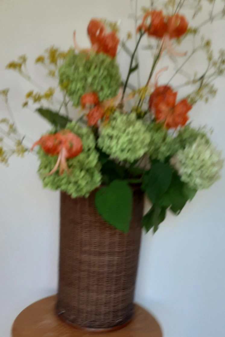 大きな枝もの、梅、ミモザ、桜、紫陽花、女郎花、紅葉、サザンカ、正月の千両等を、無造作に投げ入れても様になります。 陶器やガラスの大きい花瓶は、扱い難いので、私は、これを使いました。しかし、最近は、歳の性で、それも面倒になりまして。 生の枝や花を入れる時、水を入れる大きなビンを付けます。 実物をよくご覧になって納得されたらお願いします。無理強いはしません。バス23系「萱場公園入口」近です。