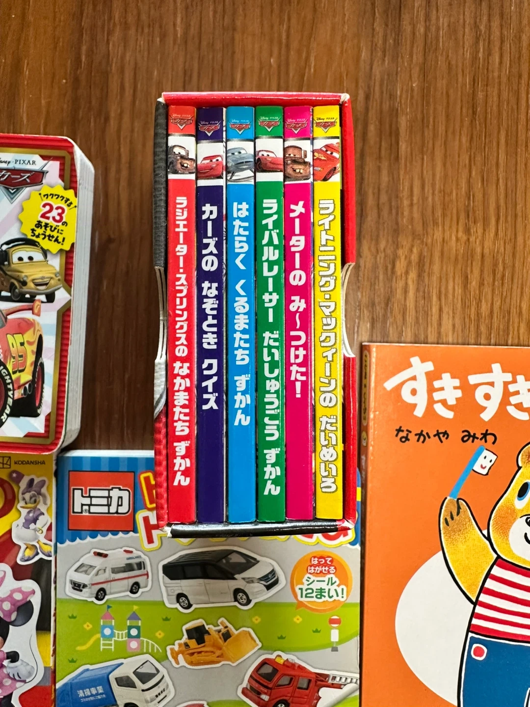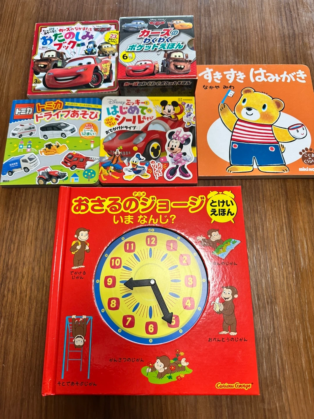 絵本のまとめ売りです。おまけに七田式知力ドリル(8枚使用)お付けします。 お出かけ時に便利な小さな絵本です。 電車や車の移動 時によく使っていました。 シールは検品時に剥がして貼ってみましたが、まだまだしっかり使えそうです。(何枚か折れありましたが、貼り付けには問題ありませんでした) おさるのジョージはほぼ新品です。 ・カーズ、トミカ、ディズニーなどの絵本 ・子供向け ・使用感あり ・おさるのジョージの絵本は時計の学習ができます 素人検品、中古品であることご了承ください