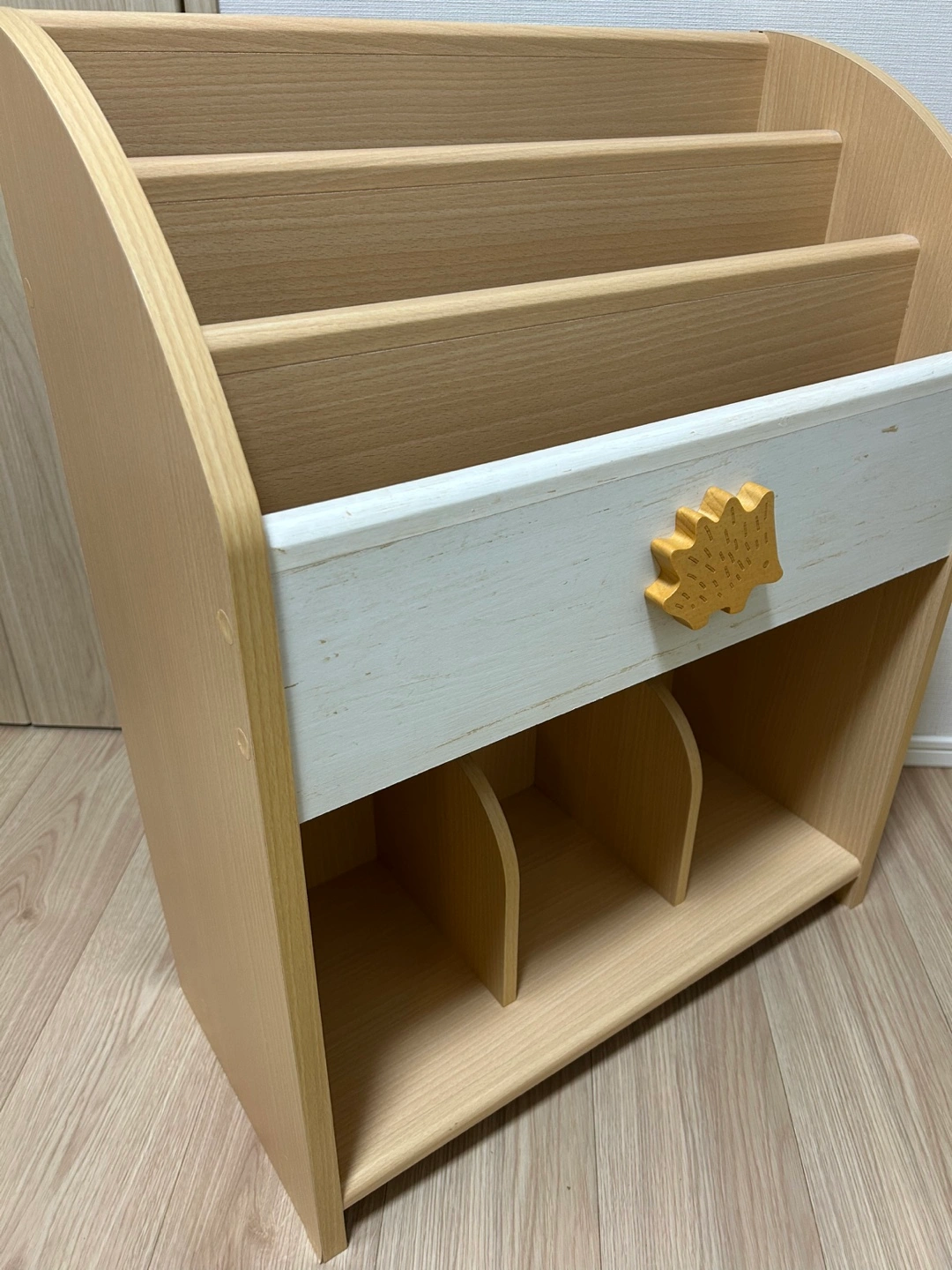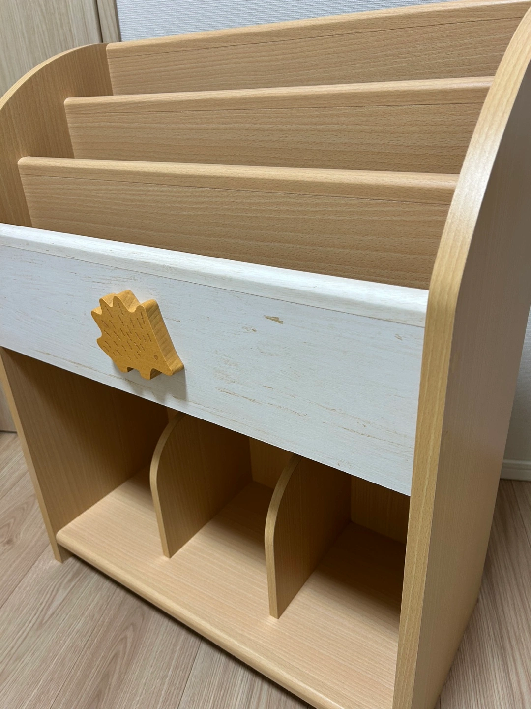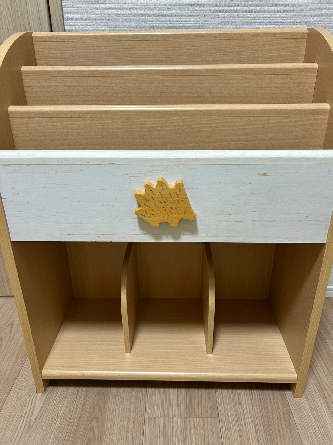 ・木製本棚(絵本棚) ・ハリネズミの飾り付き ・棚板:4段 ・下段は仕切り付き 5年ほど前にニトリで購入し子供部屋で使用していました。現在もニトリで購入できる大人気ロングセラー商品です。(現在の定価は10,790円) ※サイズ感はニトリのWebsite引用↓ 幅56.3×奥行26.5×高さ69.6cm 重量 約9.5kg 細かい使用感や塗装の剥がれなどはありますが全体的に写真の通り目立った傷や汚れがなく非常に綺麗な状態だと思います。 中古品であることは間違いありませんのでご理解いただける方のみお取引お願い致します。 解体せずそのままのお渡しとなりますので恐れ入りますがお車で取りに来れる方優先とさせていただきます。※日によっては当方がご指定の場所まで運ぶこども検討可ですのでご相談下さい