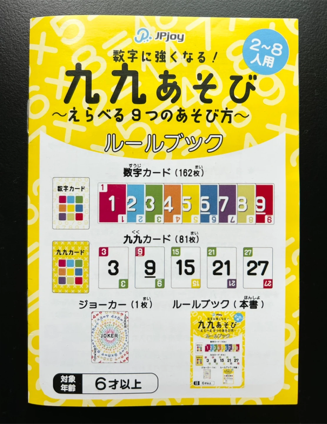 定番のカードゲームに九九の要素を追加した計算を楽しく学べるゲームです。 【ネット販売価格】 1,980円 【情報】 ブランド:JPjoy 対象年齢:6才以上 人数:2〜8人用 【内容】 数字カード:162枚 九九カード:81枚 ジョーカー:1枚 ルールブック(本):1冊