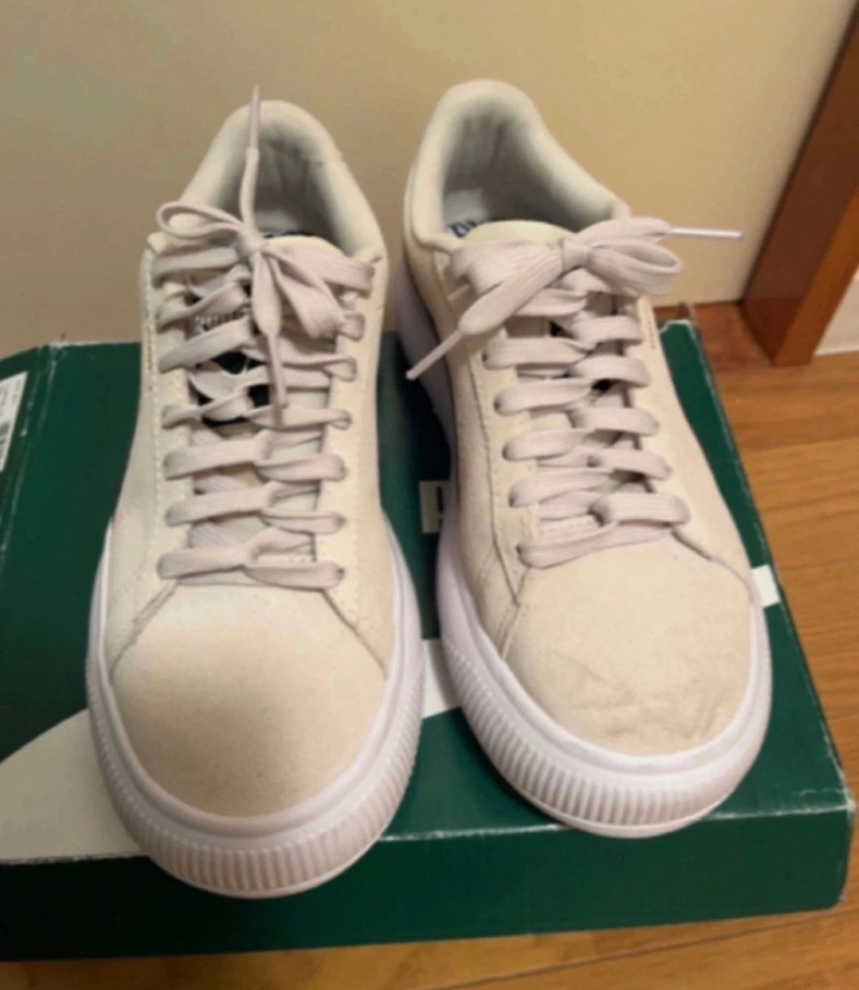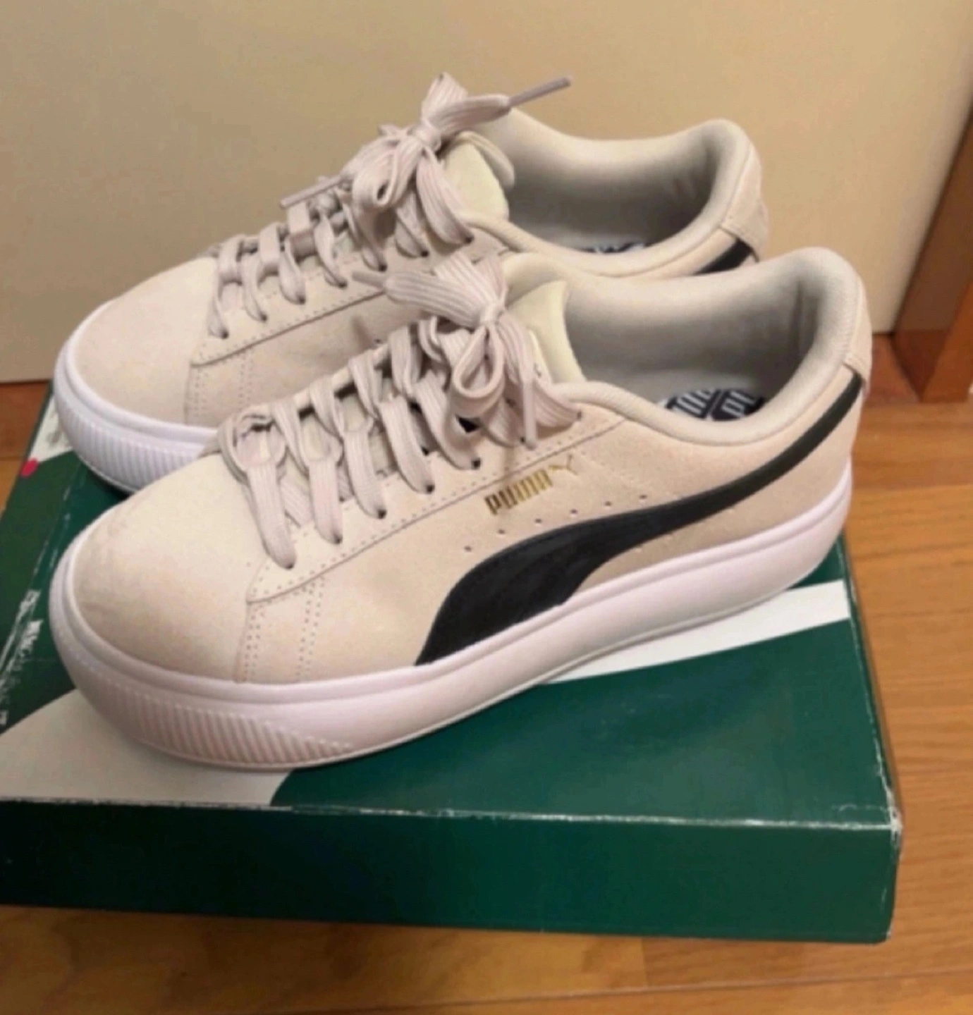 一度だけ外で着用 サイズが合わなかった為出品します 箱は、ありますが箱なしでのお取引です サイズ22.5cm プーマ MAYU マユプラットフォーム 厚底 過去にリアーナ、BTSを起用した人気のプラットフォーム(厚底)モデル。 今年はNiziUを起用し可愛い厚底スニーカーを多数ラインナップしています。 アッパーはアイスブルーのようなアイボリーのスエードになっています。 丸いフォルムが超絶可愛いです。 国内サイズは完売、 もう店舗では手に入らない逸品です。 サイズか合うものを欲しくて、どこを探して も売ってませんでした。 この機会にいかがですか? カラー···ベージュ