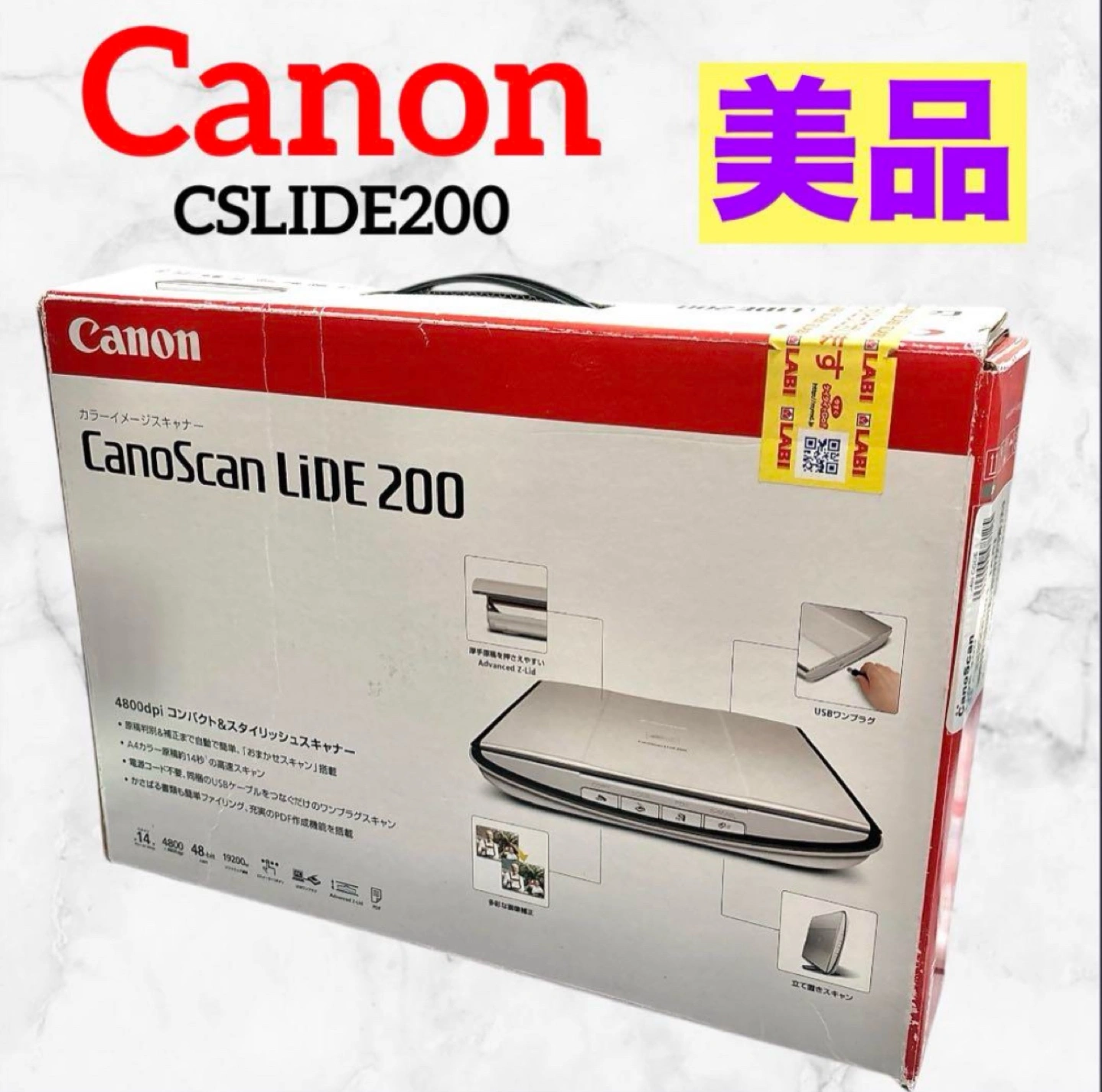 Canon CanoScan カラーイメージスキャナー フラットベッドスキャナー CSLIDE200 ☆美品 Canon 型番:CSLIDE200 セットアップしたか記憶にありませんが、開封し使おうと思ったまま1度も使用しませんでした。 4800dpi コンパクト&スタイリッシュスキャナー ・原稿判別&補正まで自動で簡単、「おまかせスキャン」搭載 ・A4カラー原稿約14秒の高速スキャン ・電源コード不要、同梱のUSBケーブルをつなぐだけのワンプラグスキャン ・かさばる書類も簡単ファイリング、充実のPDF作成機能を搭載 キヤノン独自の「LIDE(ライド)」技術を用いたCISタイプの薄型・コンパクトモデル。4,800dpiの高解像度と48bitの高精細スキャンに対応したほか、A4カラー文書原稿を約14秒の高速で読み取ることも可能です。また、USBバスパワーからの電源供給で電源コードを必要としない「ワンプラグスキャン」 【付属品】 ・USBケーブル ・セットアップCD-ROM ・スキャナー基本ガイド ※スタンドは無くしてしまいました 目立った傷や汚れ等もなく美品です! 購入時の箱に入れて、直接伝票を貼り発送します 本体奥行:364.0 mm 本体横幅:250.0 mm 本体高さ:40.0 mm 本体重量:1600.0 g #Canon #CSLIDE200 #スマホ/家電/カメラ #PC/タブレット 他サイトでも出品中です。 他で売れた場合、急に削除しますので、ご了承ください