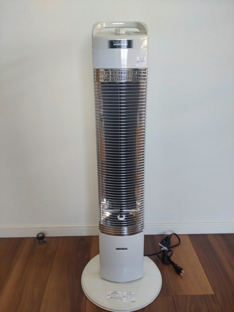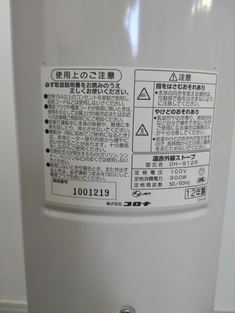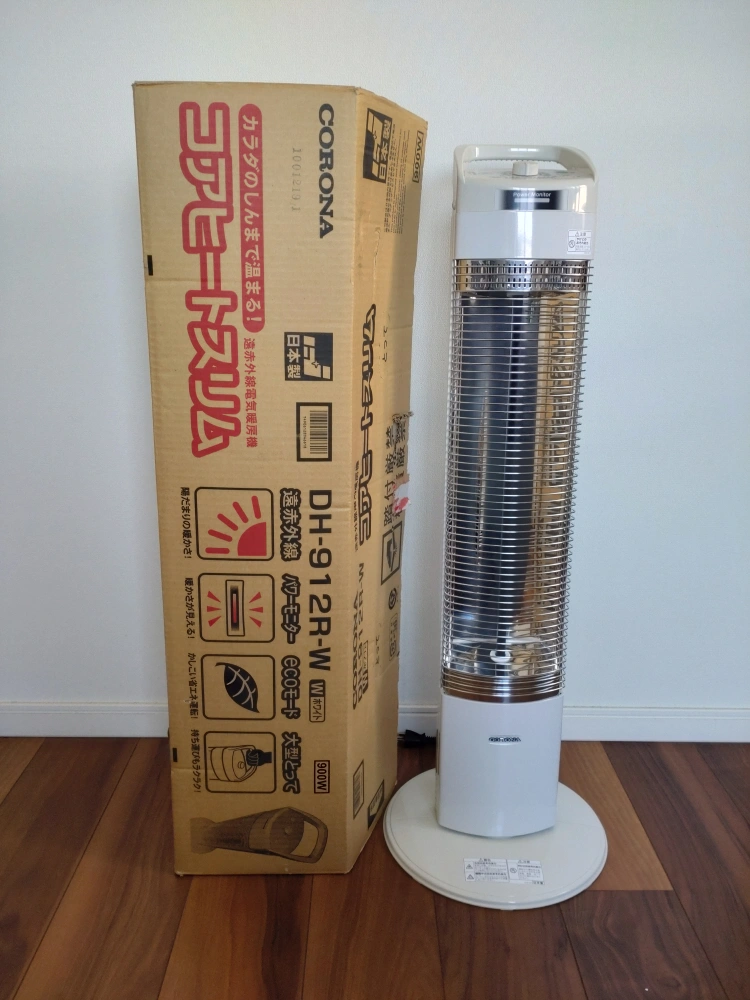 2012年製ですが、購入後程なくして小型犬を飼い始めた為ほとんど使用せず保管しておりました。 動作面も良好で、各機能やボタン反応も正常です。 購入時の箱もありますので入れてお渡しします。 説明書も綺麗な状態であります。 篠崎駅周辺で直接お渡しできる方よろしくお願いします。 商品情報 ◇品番:DH-912R(ホワイト) ◇電源:100V(50/60Hz) ◇消費電力:通常モード:900W-340W/ecoモード:690W-115W ◇運転電流:9A ◇ヒーター:遠赤塗装(セラミック含有)コーティングステンレスシーズヒーター ◇電源コード長さ:1.9m ◇質量:3.7kg ◇本体サイズ:幅306×奥行306×高さ897mm ◇安全装置:転倒OFFスイッチ・自動首振りスイッチ・過熱防止装置 ●身体に吸収されやすい遠赤外線は、身体のしんまで温めます。遠赤外線ヒーターはヒーターそのものが明るく赤熱しない為、どの位温度調節(暖房能力)で運転しているのか解りにくく、消し忘れしやすいという問題点があります。そこで、DH-912Rは、暖かさが見えるパワーモニターランプ(緑・オレンジ・赤)で表示します。 ●自動で無駄な電気代を抑える省エネ機能【ecoモード】 ◇温度センサーがお部屋の温度を検知し、室温に応じた控えめ運転を自動で行います。室温18℃で30%以上節約。 ●マイコン制御だから、つけたら素早く暖める<速暖オート運転> 運転停止から再運転されるまでの時間をカウントし、ヒーターがさめている時は温度調節ツマミの設置位置より、高い能力で立ち上げ、素早く暖めます。その後、自動的に温度調節ツマミの設定位置に応じた運転に戻ります。 中古品であるということをご了承の上、ご購入ください。 ご不明点等ございましたらご連絡ください。