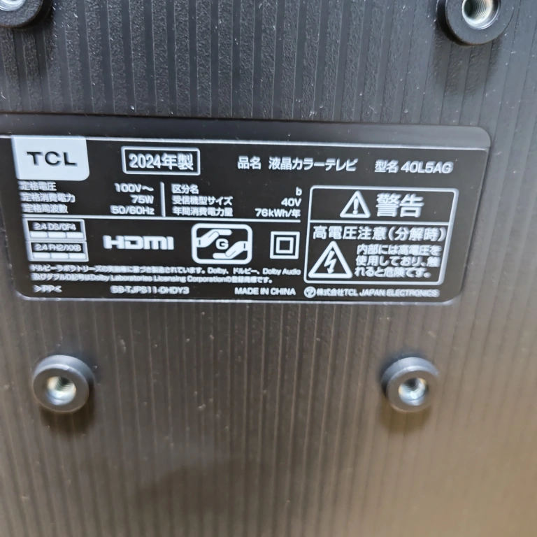 ■TCL 40V型 Google TV「40L5AG」 2024年製のため、比較的新しい年式のスマートTVです。 ---------------------------- 【商品状態】 ・多少の細かい傷や汚れなどはあるかもしれませんが、比較的美品だと思います。 ・動作確認済み、問題なく使用可能です。 ただ、完美品を求める方、神経質な方はご購入をお控えください。 ---------------------------- 【付属品(完備)】 ・電源ケーブル ・リモコン(電池付き) ・B-CASカード(本体に装着済) ・取扱説明書 ・アンテナケーブル ※全部揃っていますので到着後、すぐにご利用頂けます。 ---------------------------- 【製品情報】 ・型番:TCL 40L5AG ・画面サイズ:40インチ ・解像度:フルHD ・Google TV搭載(YouTube, Netflix, Prime Videoなど対応) ・HDMI×2/USBポート×1/Wi-Fi対応 ・軽量&省スペース設計 ---------------------------- ■早い者勝ちです! ご購入後のキャルセルは受け付けておりませんので、よくご確認頂き、お間違えのないようにご購入をお願いします。 また、商品すり替え防止などの為、返品や交換は致しかねますのでご了承下さい。宜しくお願い致します。 ★美品のTCL 40L5AGは人気のため、すぐに売り切れる可能性があります。ぜひこの機会にご検討ください! 【受け渡し場所】 場所を設定させて頂いておりますが、持ち運びが大変な方はご自宅付近までお持ちすることもできる場合もございますので、お気軽にご相談頂ければと思います。