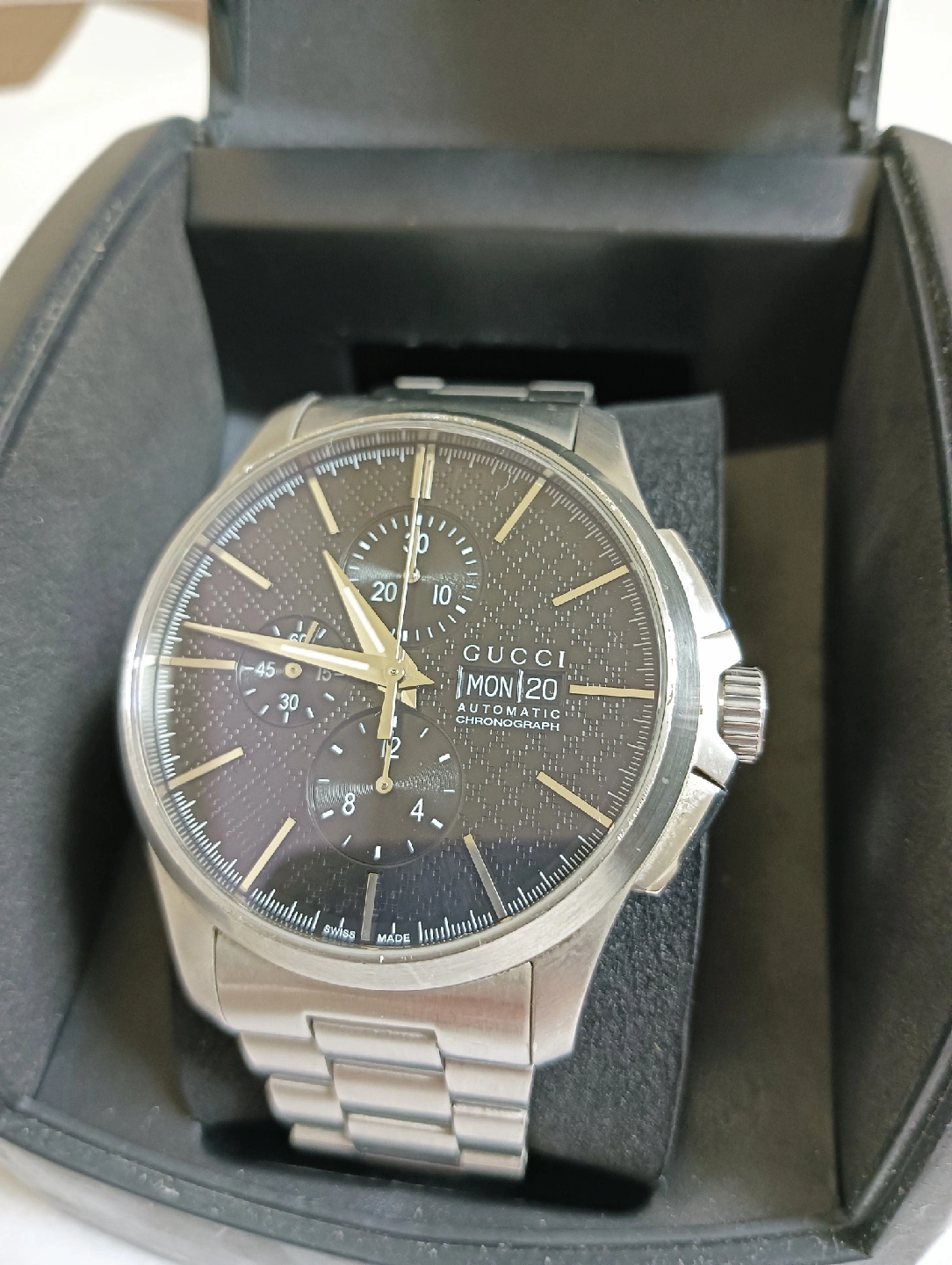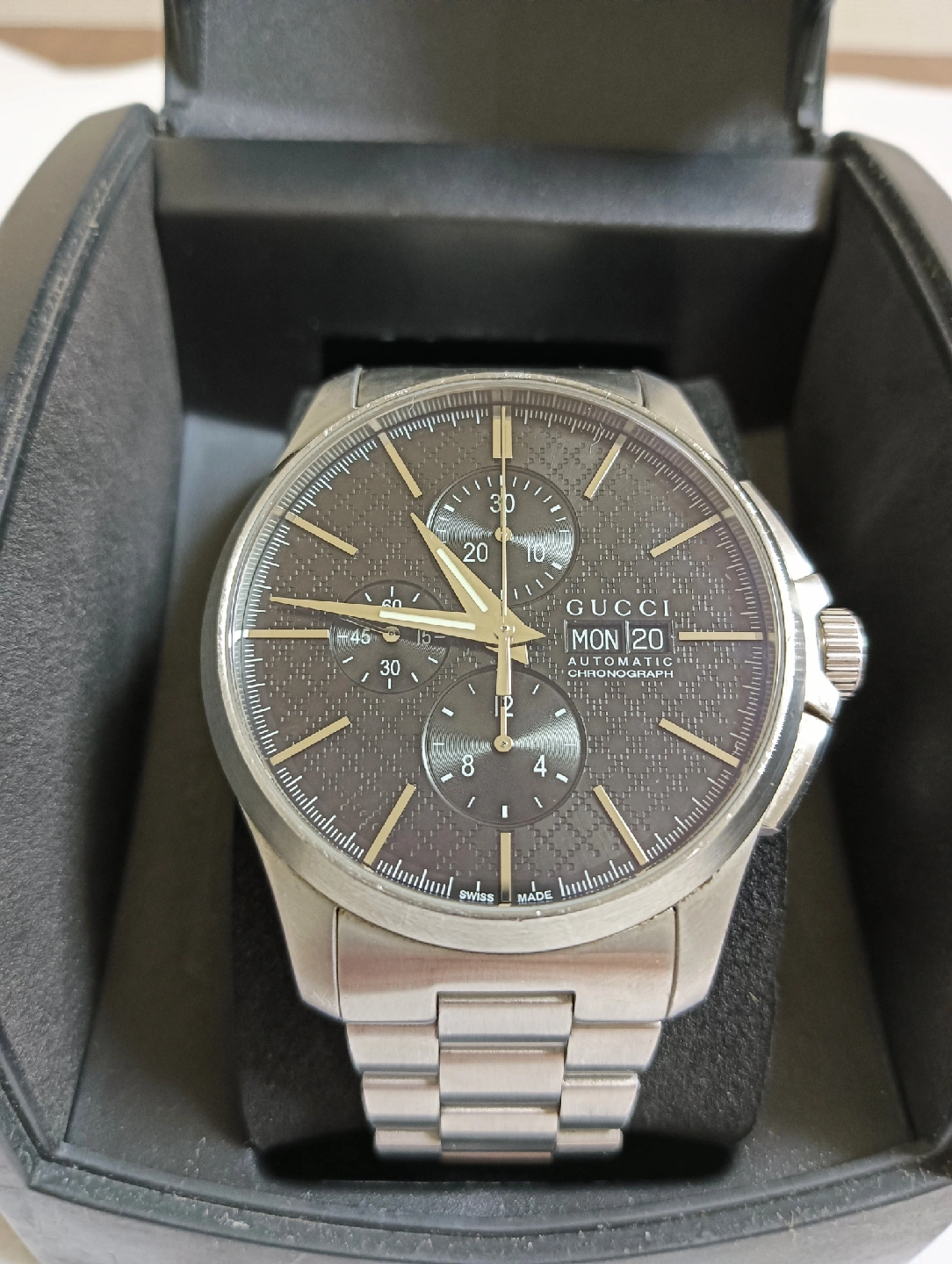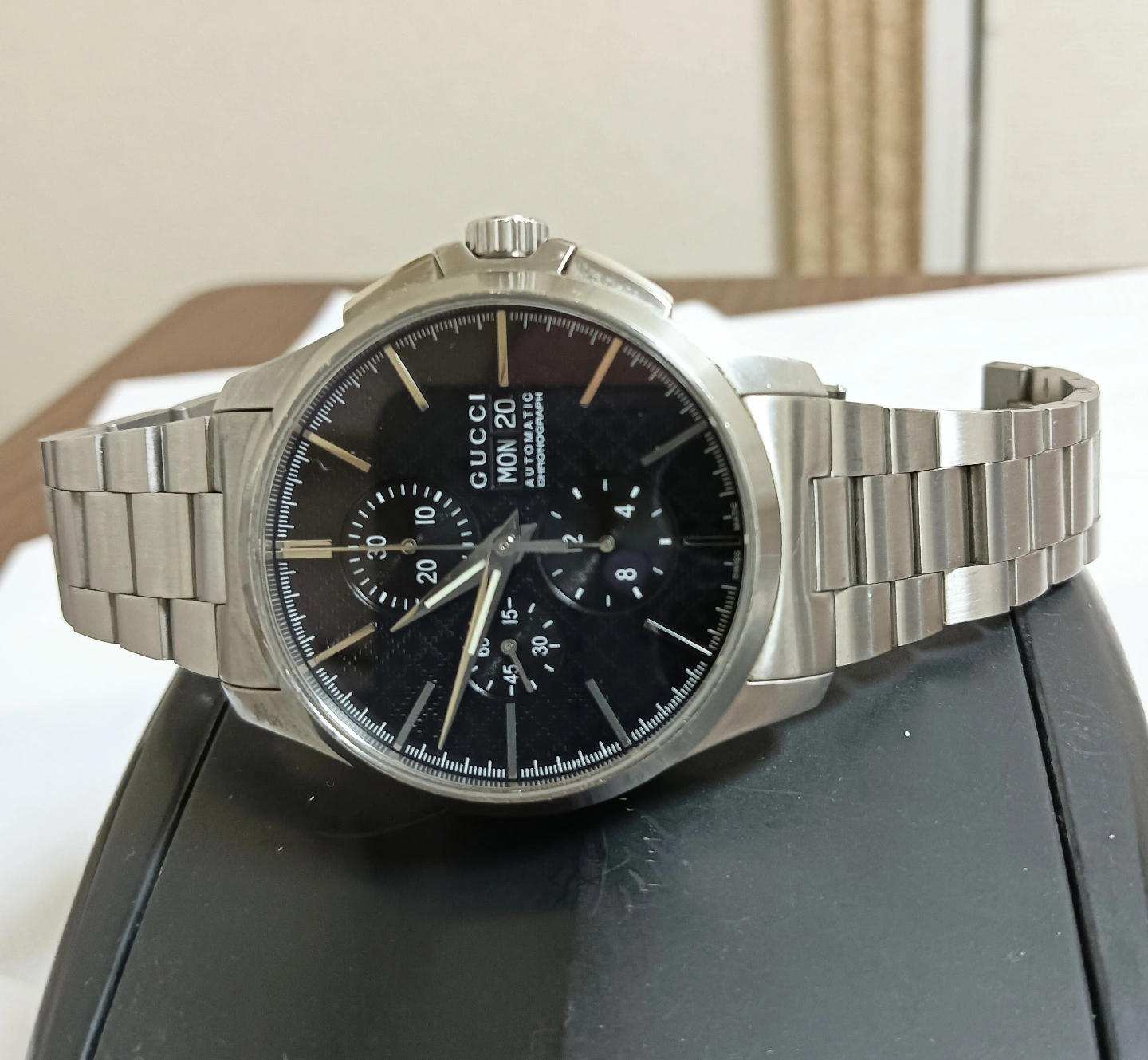 ★★ GUCCI グッチ Gタイムレス オートマチックデイデイト 自動巻き クロノグラフ 裏スケルトン 腕時計。 正確作動 日差約±10秒 型番 YA126.264 販売価格 332.000円 ★★ グッチのハイエンドモデル 自動巻きデイデイト クロノグラフ腕時計です。 ★★ 写真の通り全体的にも綺麗な状態と思いますが使用に伴う微かなスレはご容赦。 腕周り 約18.5cm color シルバー&ブラック こちらは現物のみとなります。 ★★ GUCCIのYA126264モデル、ステンレススチール製のブラックダイヤル自動巻き時計。 - ブランド: GUCCI - モデル名: YA126264 - カラー: ブラック - 素材: ステンレススチール - バックケース: スケルトンバック - 販売価格: ¥330,000(税込)