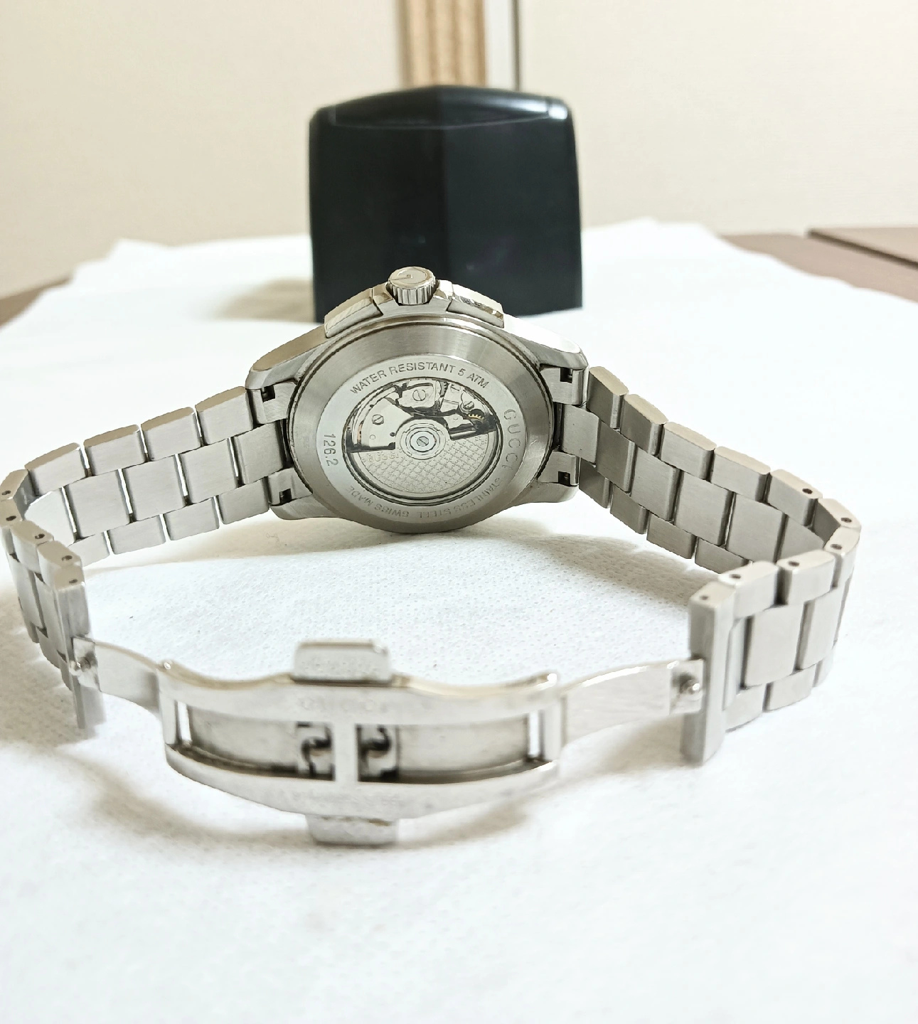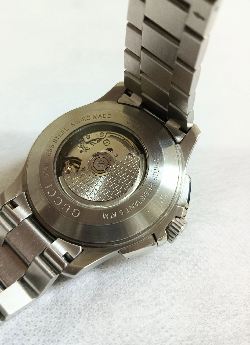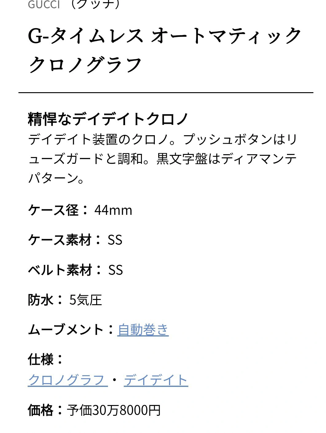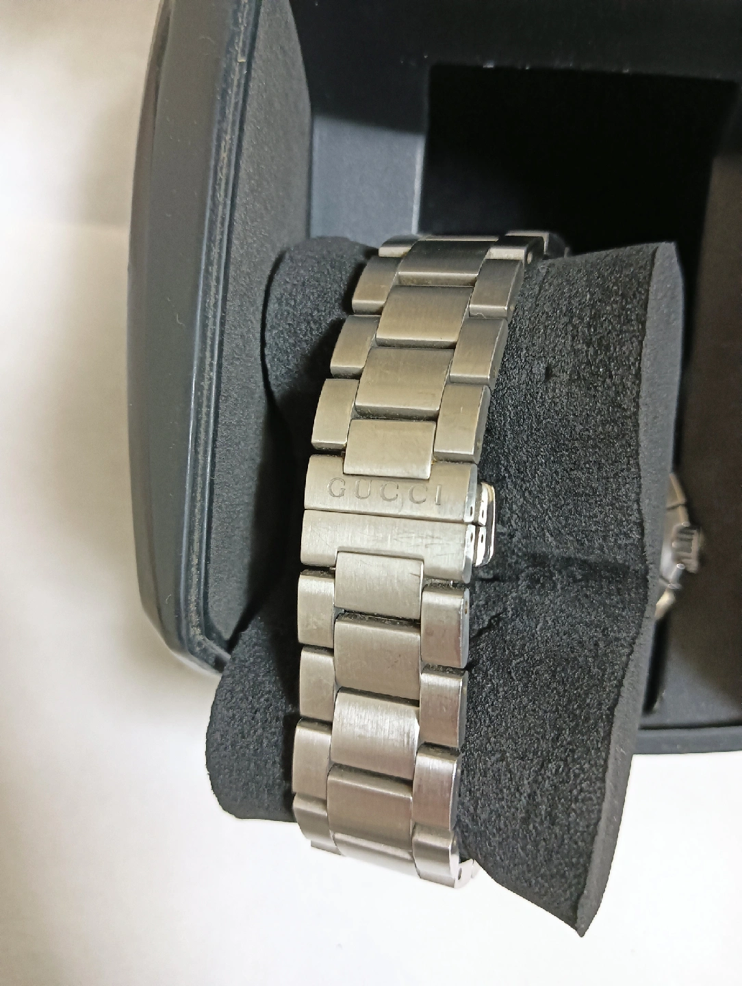 ★★ GUCCI グッチ Gタイムレス オートマチックデイデイト 自動巻き クロノグラフ 裏スケルトン 腕時計。 正確作動 日差約±10秒 型番 YA126.264 販売価格 332.000円 ★★ グッチのハイエンドモデル 自動巻きデイデイト クロノグラフ腕時計です。 ★★ 写真の通り全体的にも綺麗な状態と思いますが使用に伴う微かなスレはご容赦。 腕周り 約18.5cm color シルバー&ブラック こちらは現物のみとなります。 ★★ GUCCIのYA126264モデル、ステンレススチール製のブラックダイヤル自動巻き時計。 - ブランド: GUCCI - モデル名: YA126264 - カラー: ブラック - 素材: ステンレススチール - バックケース: スケルトンバック - 販売価格: ¥330,000(税込)