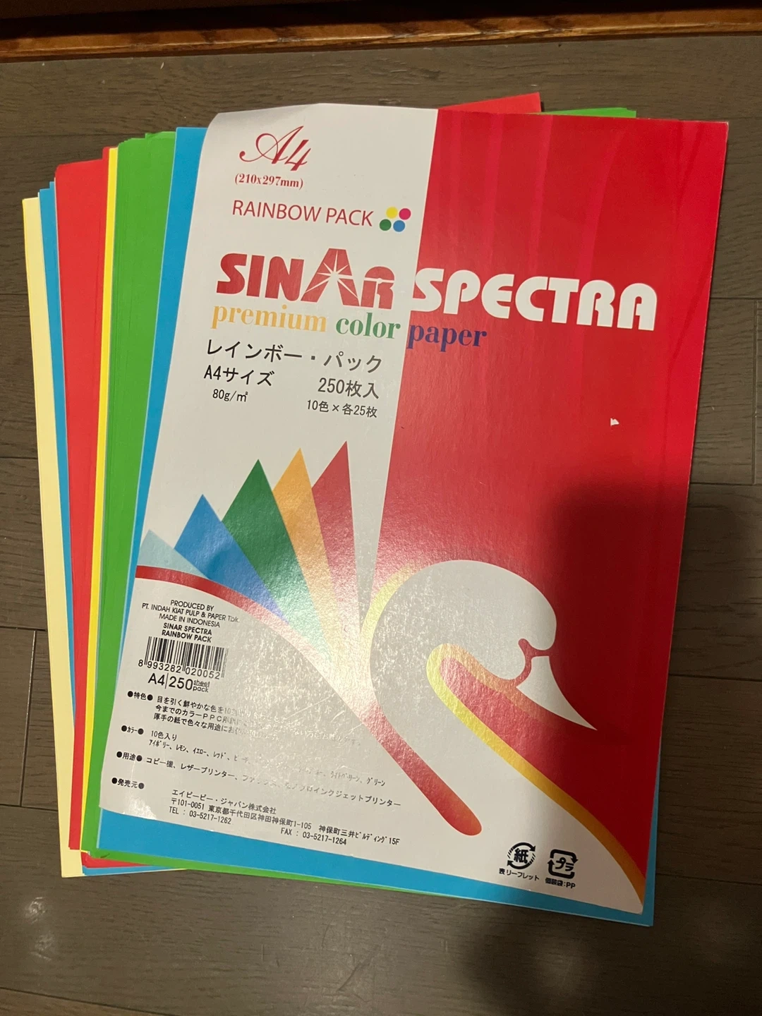 シナー スペクトラのレインボーカラーペーパー A4サイズです ・サイズ:A4(210 x 297mm) ・枚数:250枚 (10色 x 各25枚) ・重さ:80g/㎡ 子供の工作用に以前購入しましたが、もう使わないので、どなたかにお譲りしたいです 色画用紙のつもりで購入しましたが、コピー用紙として使えるということが記載してあります 中古品であることご了承ください