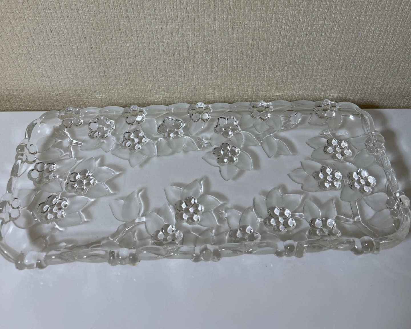 ドイツ ワルターグラス社 花のレリーフガラスプレート Carmen Satiniert ドイツで130年以上の歴史を持つ ガラスメーカーWALTHER GLAS社 (ワルターグラス1865年〜) Carmen(カルメン)シリーズの 美しいガラス皿です。 ヨーロッパらしいとても美しい花柄が 立体的に施されており、芸術的です。 かなりの美品です! くもりガラス部分もあり、丁寧な作りです。 果物やデザート、ケーキ、お菓子、ナッツ、おつまみ、サラダなどもいいかも知れません。 横33.5 縦15 高さ3cm 箱はないです。 🇩🇪のシールも剥がしてしまいました。 でも未使用です。 食器棚に長年置いていたので 洗浄消毒済です✨ 購入時期や定価は不明です。 神経質な方はご遠慮ください✨ 受け渡し場所は指定場所に限らず わかりやすく車が停められる場所であれば 応相談可能です。