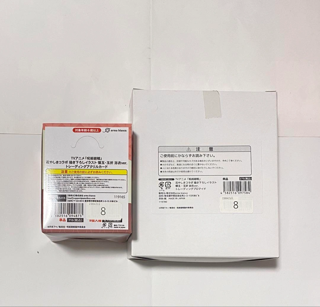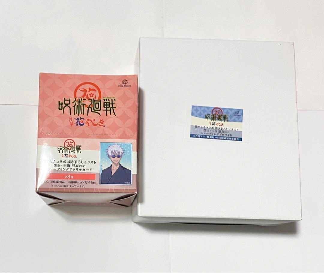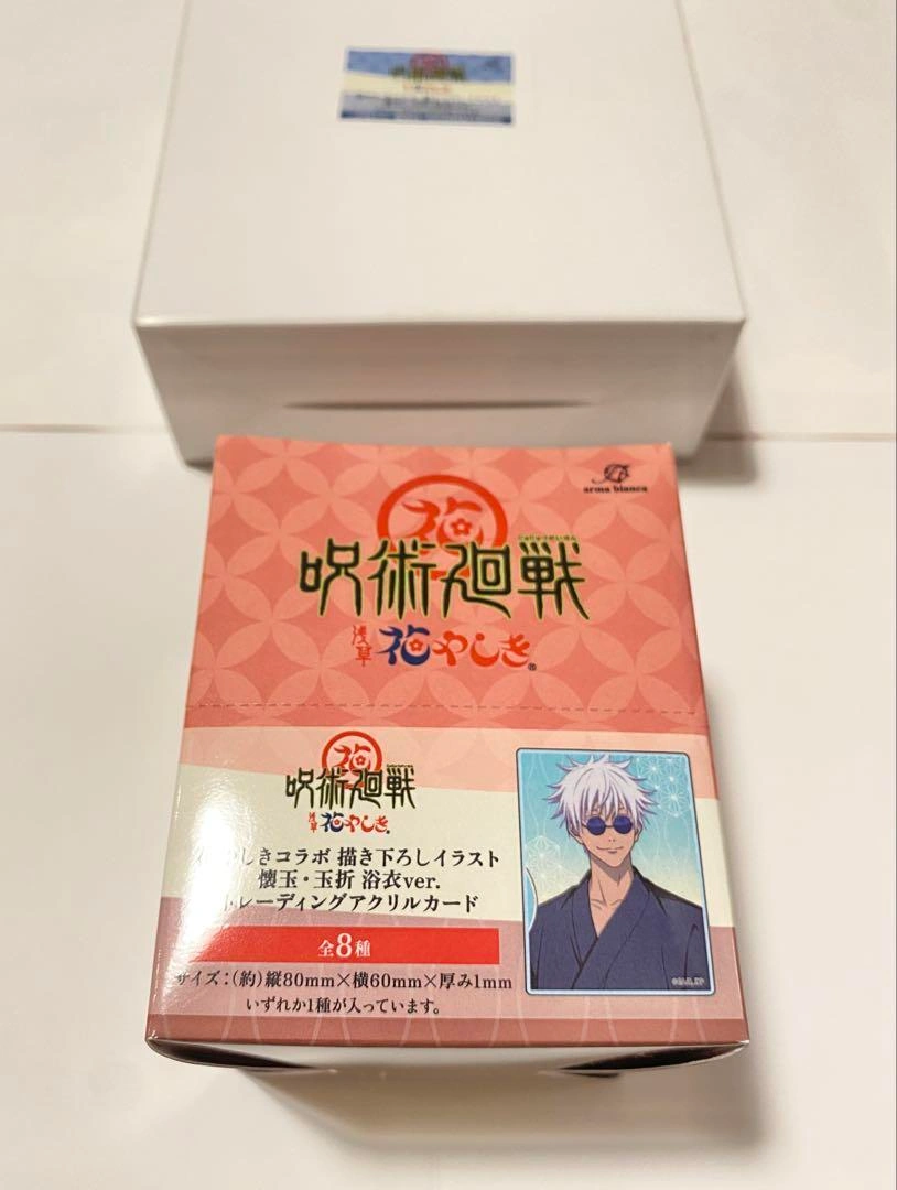 呪術廻戦 浅草花やしきコラボ 懐玉・玉折 浴衣ver. トレーディングブロマイドとトレーディングアクリルカードのBOX、各1箱ずつです。 アクリルカードは箱の寸法が大きいため、箱から出して発送させて頂きます。 未使用ではありますが、中身確認・撮影などで触れることがあります。素人保管のため神経質な方はご購入をお控えください。 ご希望の方はお気軽にご連絡ください。