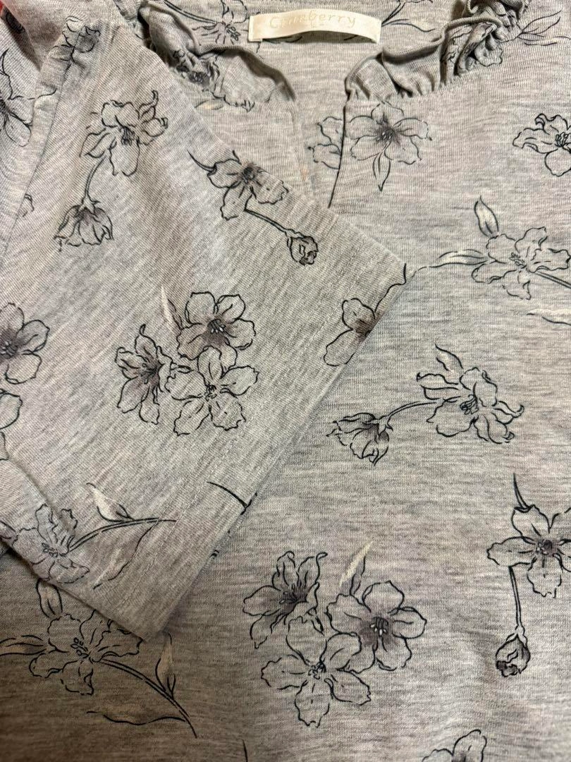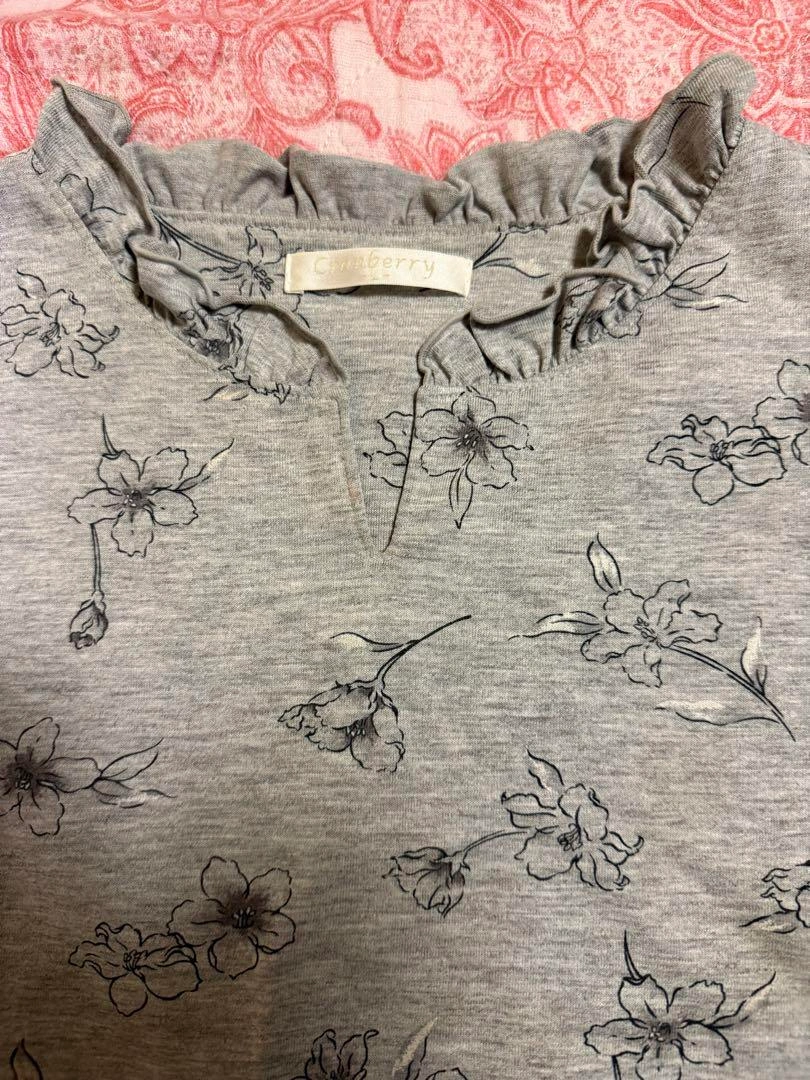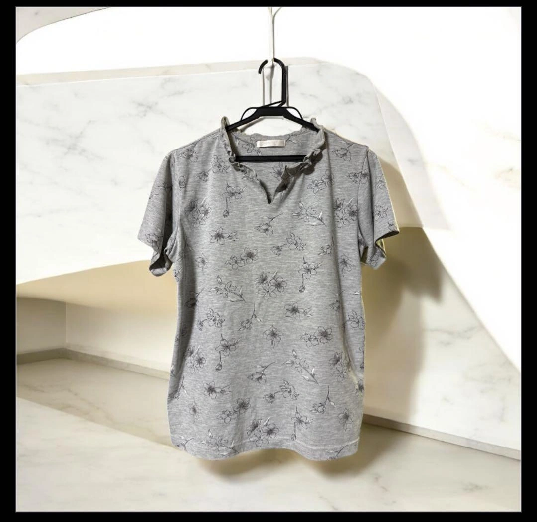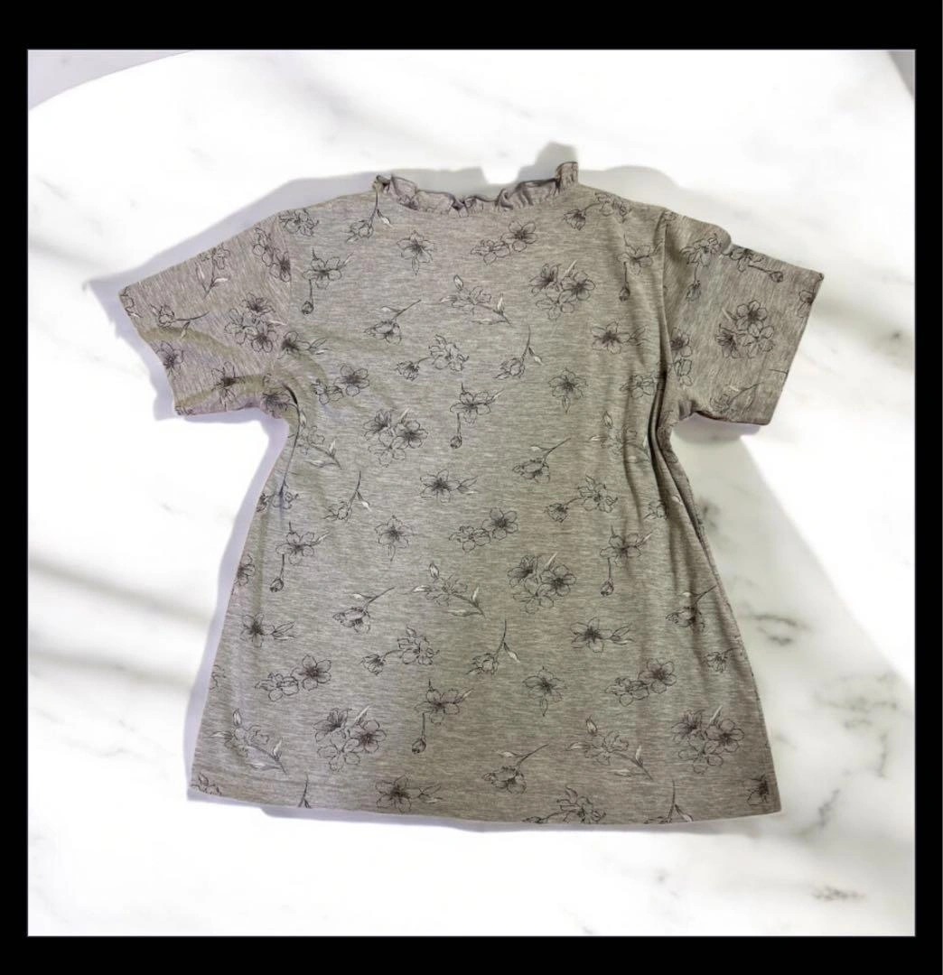 フリル付きの花柄デザインのグレーTシャツです。 パンツとセットでしたが、トップスのみの販売です。 普段使いにとても着やすいシャツです。 - デザイン: 花柄 - 襟のデザイン: フリル付き - 色: グレー - ポリエステル 綿 肩幅 40㎝ 着丈 60㎝ 身幅 51㎝ 袖丈 18.5㎝ 裾幅 53.5㎝ 素人計測のため、多少の誤差はお許しください。 ご希望の方はお気軽にご連絡ください。