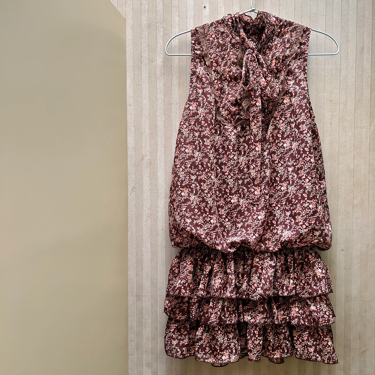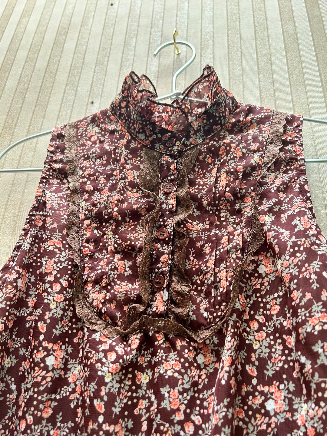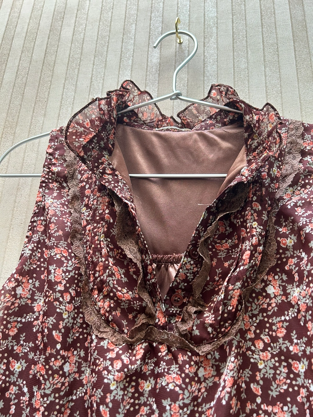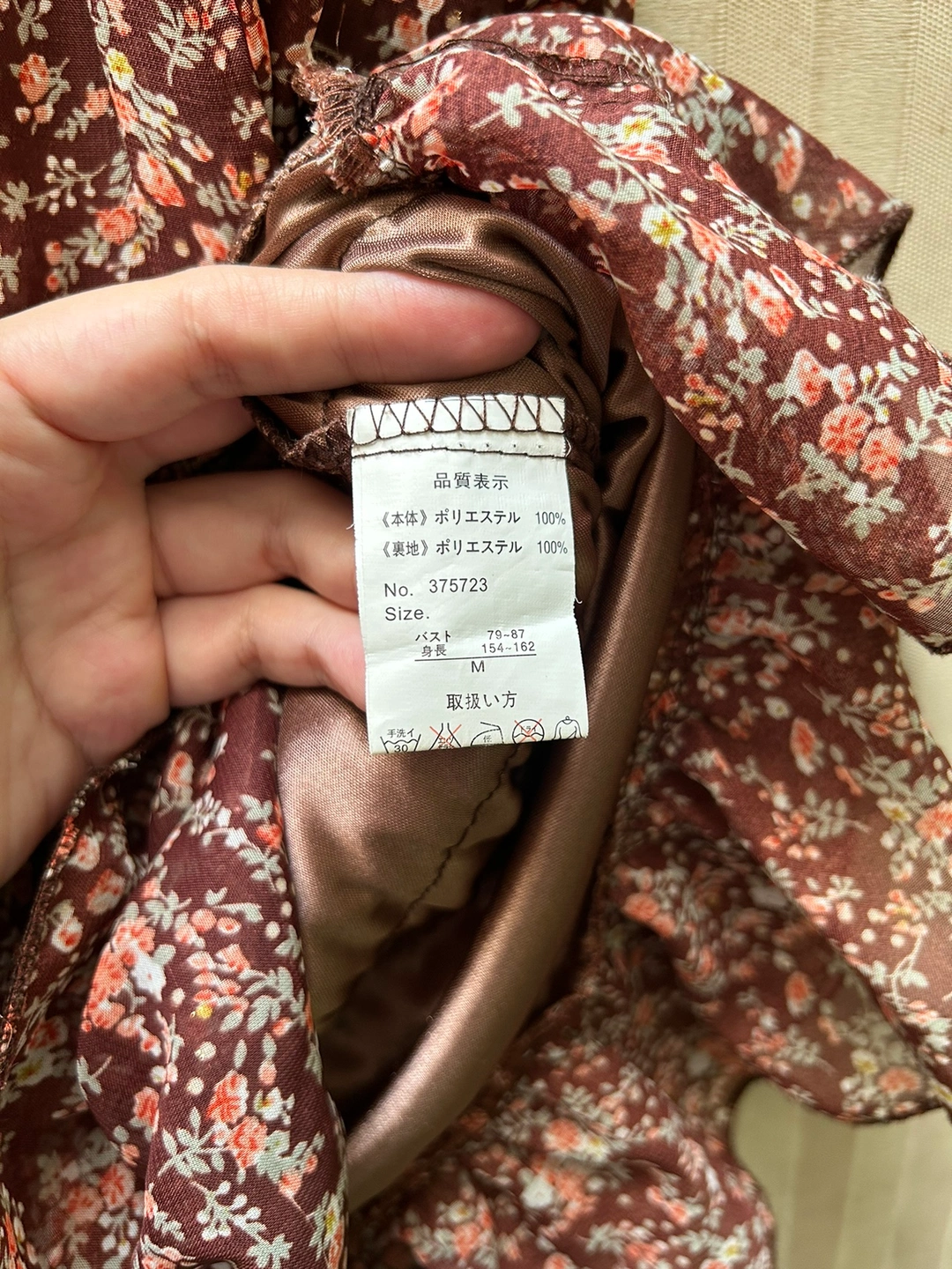 銀座伊勢由のワンピースです。 サイズ:M バスト:79-87cm 身長:154-162cm 数回着用し、体型が合わなくなったため仕舞ってありました。 ふんわり透ける花柄の表地と、ブラウンの裏地の組み合わせです。 胴部分の表地と裏地は離れているので、透け感が軽やかで、なおかつ暖かいので、秋にぴったりです🍁 裾は三段のフリルになっています。 首元に表地と共布のリボンが付いています。 花柄の所々に、金糸が入っているので、控えめにちらりと光ります。 お気に入りのワンピースなのですが、体型に合わなくなってしまったため、どなたか大切に着てくださる方にお譲りできればと思います。 どうぞ宜しくお願いいたします。 《猫あり、喫煙者なし》 -------------- 秋冬物 秋ファッション ブラウス