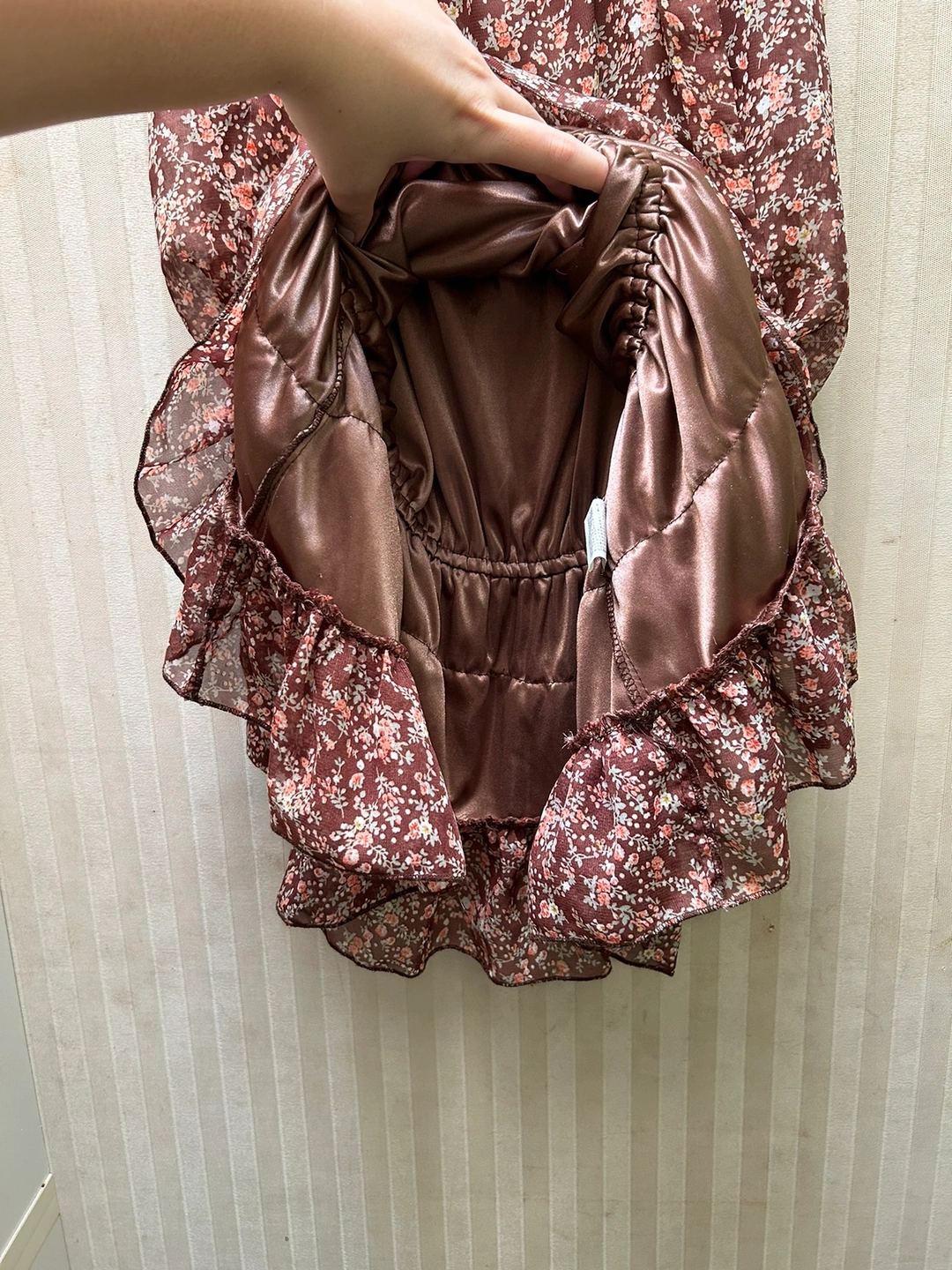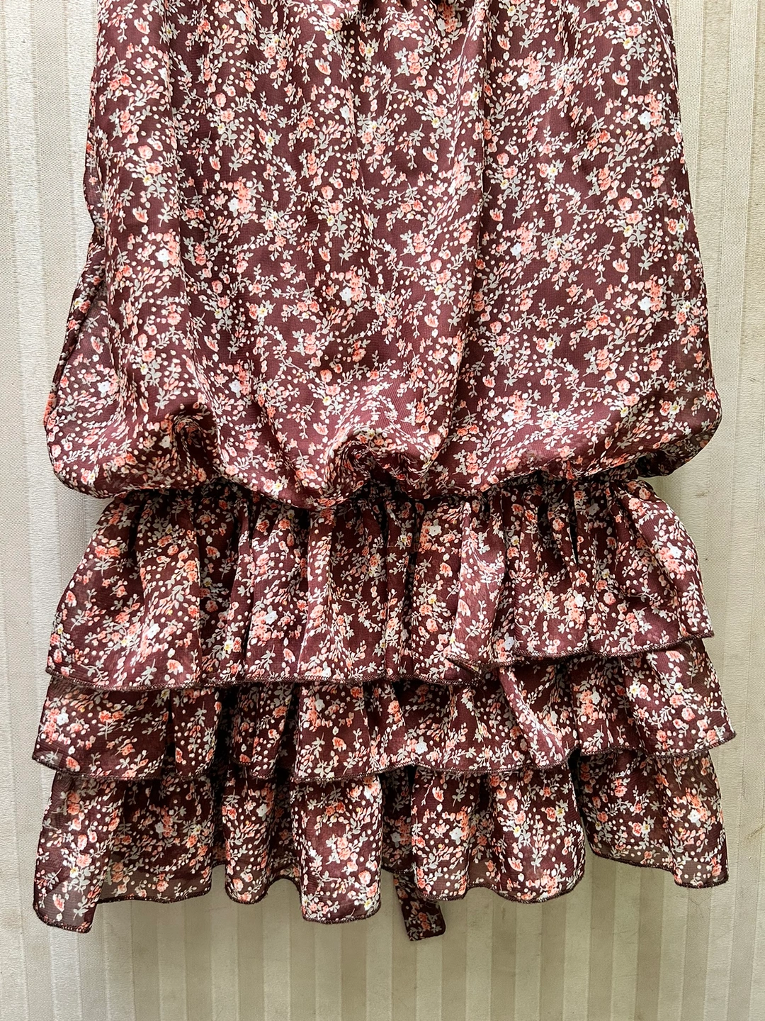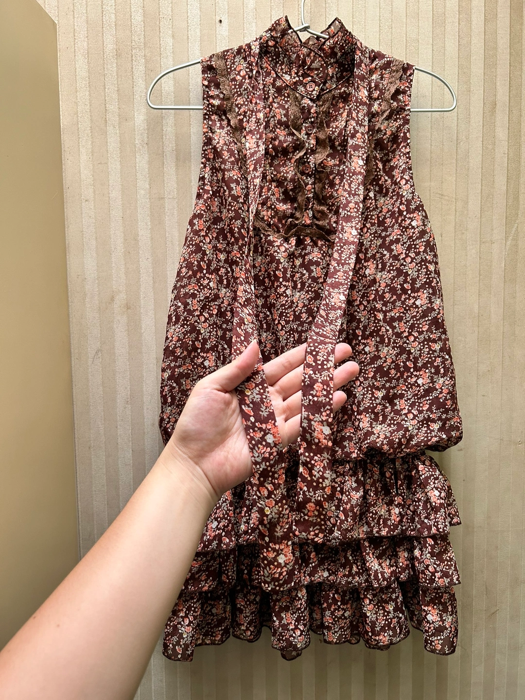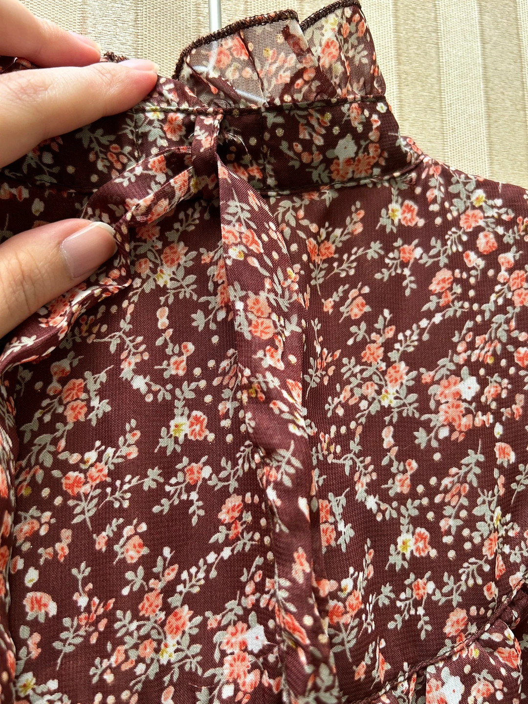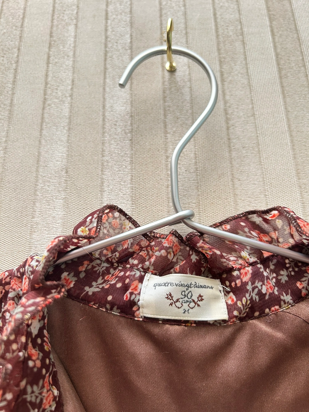 銀座伊勢由のワンピースです。 サイズ:M バスト:79-87cm 身長:154-162cm 数回着用し、体型が合わなくなったため仕舞ってありました。 ふんわり透ける花柄の表地と、ブラウンの裏地の組み合わせです。 胴部分の表地と裏地は離れているので、透け感が軽やかで、なおかつ暖かいので、秋にぴったりです🍁 裾は三段のフリルになっています。 首元に表地と共布のリボンが付いています。 花柄の所々に、金糸が入っているので、控えめにちらりと光ります。 お気に入りのワンピースなのですが、体型に合わなくなってしまったため、どなたか大切に着てくださる方にお譲りできればと思います。 どうぞ宜しくお願いいたします。 《猫あり、喫煙者なし》 -------------- 秋冬物 秋ファッション ブラウス