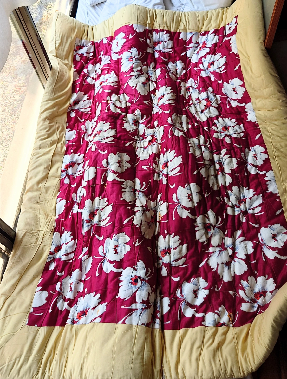 花柄のキルトです ・色:赤、白、黄色 ・花柄デザイン ・使用感あり 来客用に保管していた布団です。 泊まって行く来客がいなくなりましたので、使っていただければ幸いです。 10回位は使っていると思います。 経年で綿のふっくり感は少しなくなっていますが暖かいですよ。 打ち直しをすればフカフカになります! 綿100%です。真綿も入った手作りです。