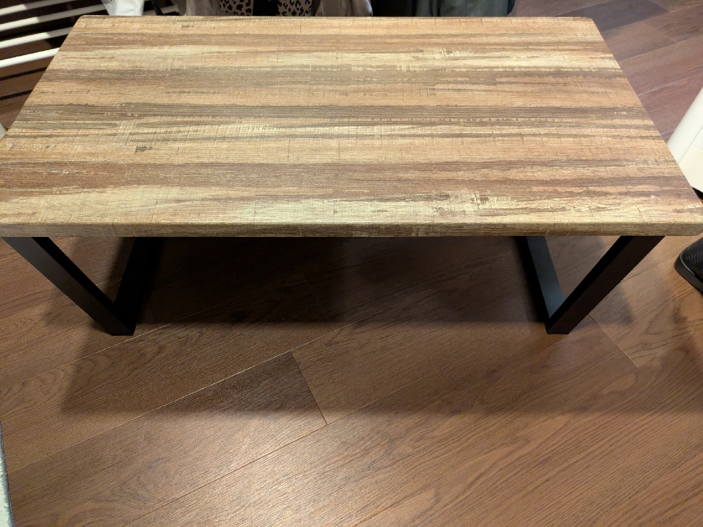 【商品詳細】 本体サイズ︰(約)幅90×奥行50×高さ37cm 商品の重量︰約7kg フレームの素材︰金属 カラー︰ブラウンのヴィンテージ調 トップの素材︰タイプポリ塩化ビニル (PVC) ※超美品です※ 異素材の組み合わせでデザイン性UP! リアルで本物に近い木目調シート張りの天板と耐久性に優れたスチール脚がインテリアとしての存在感を発揮。 丈夫さへのこだわりとして、天板裏にはスチールの補強材を施し、より長くご使用いただけるように仕上げました。