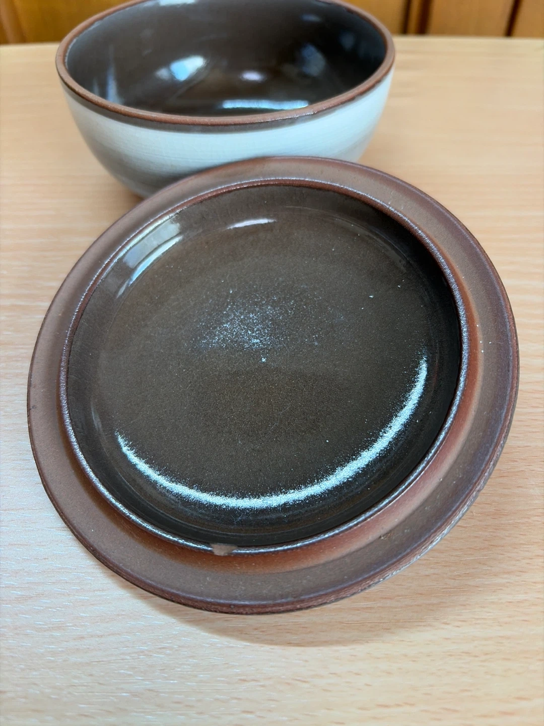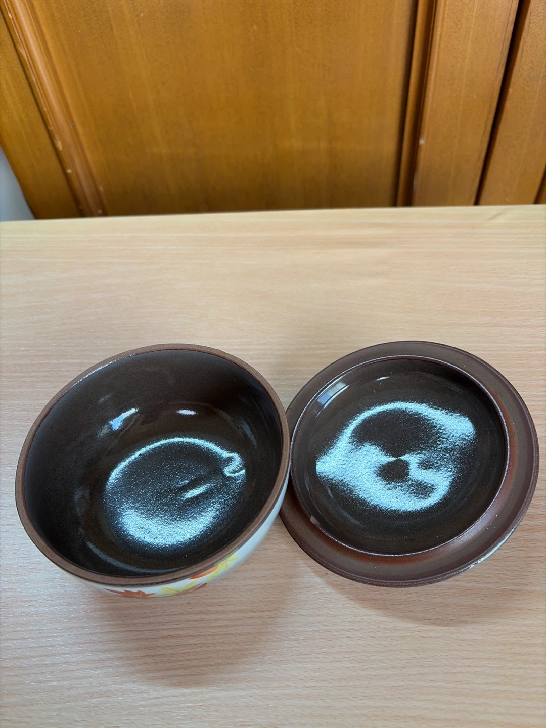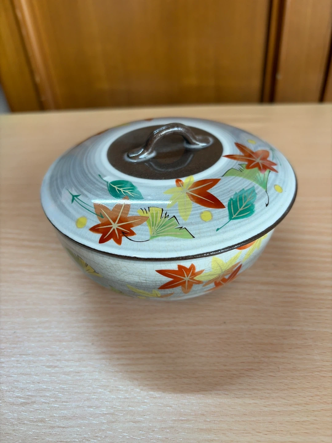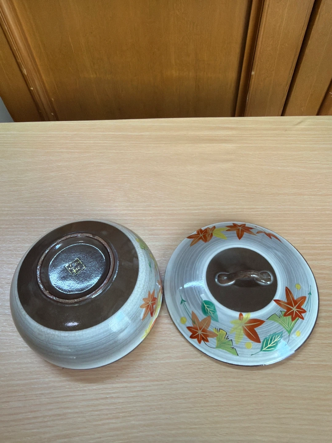 蓋付きの陶器の器です ・紅葉柄 ・ブラウンと白のカラー ・使用感は少なめです こちらは、 自宅保管していたので、見えない細かなキズがあるかもしれません。 蓋の裏にカケがあります。写真4枚目にてご確認ください。 4枚の写真でご確認いただき こちらが気にならない方 よろしくお願いします。 中古品であることご了承ください