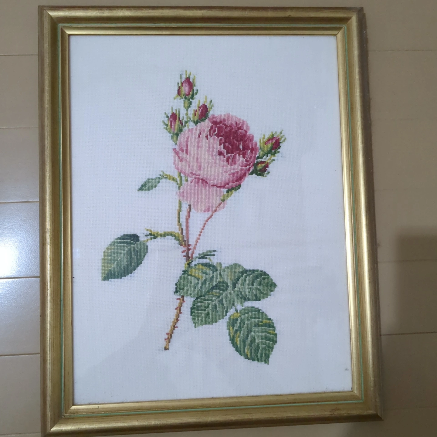 ピンクの薔薇のクロスステッチ。 ゴールドの額縁付きです。 お部屋のアクセントにいかがですか。