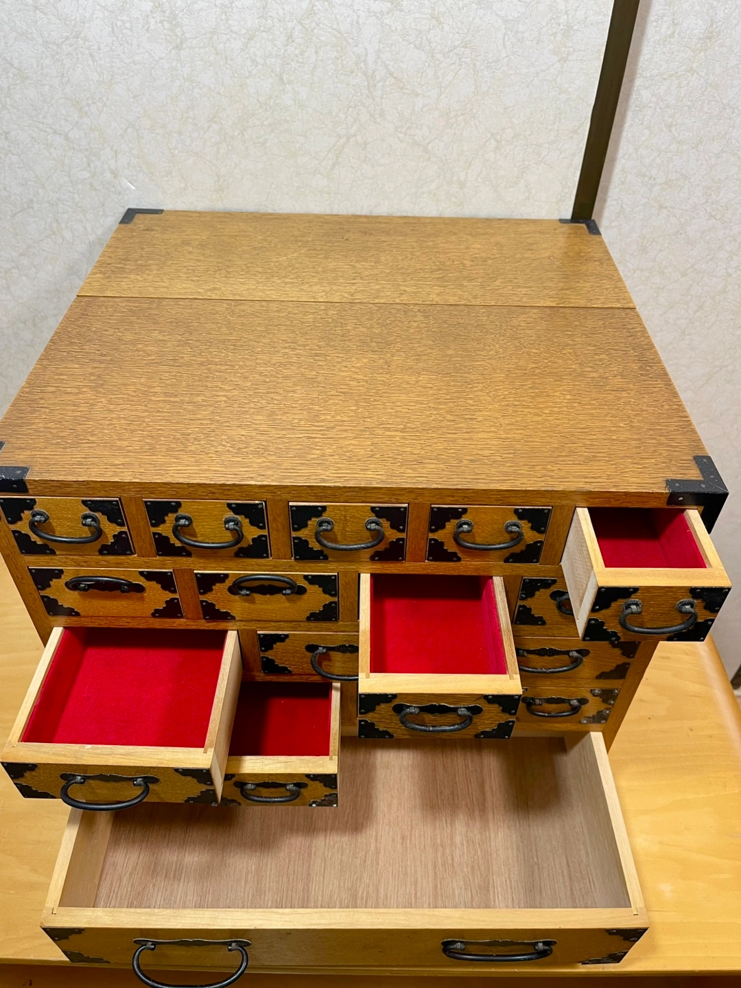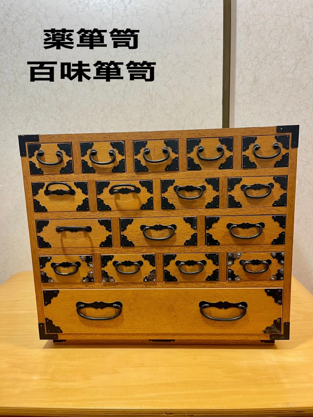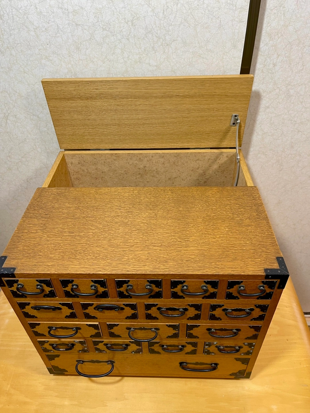 実家の処分に伴いこちらに出品致しました。 後側は約16cmの奥行きで縦に入れる収納になっています。 その残りが引き出しの奥行きになります。 殆ど使用して無かったので、内部はかなり綺麗です。 外観は多少の傷や金具の塗装の剥がれた箇所がございますので、写真を拡大してご確認をお願い致します。 使用されている木材の種類は近所方に楢(ナラ)では無いかと言われました。 以下参考 楢木について https://www.google.com/gasearch?q=%E6%A5%A2%E6%9C%A8&source=sh/x/gs/m2/5 お取引は夜でも可能です。 お取引場所は基本取りに来て頂きますので、駅での受け渡しもしておりません。 重量的には女性でも持てる重さです。しかし、嵩張るので車でお越し頂く事がベストだと思います。 プラス千円でお届けも可能ですが、 距離次第です。