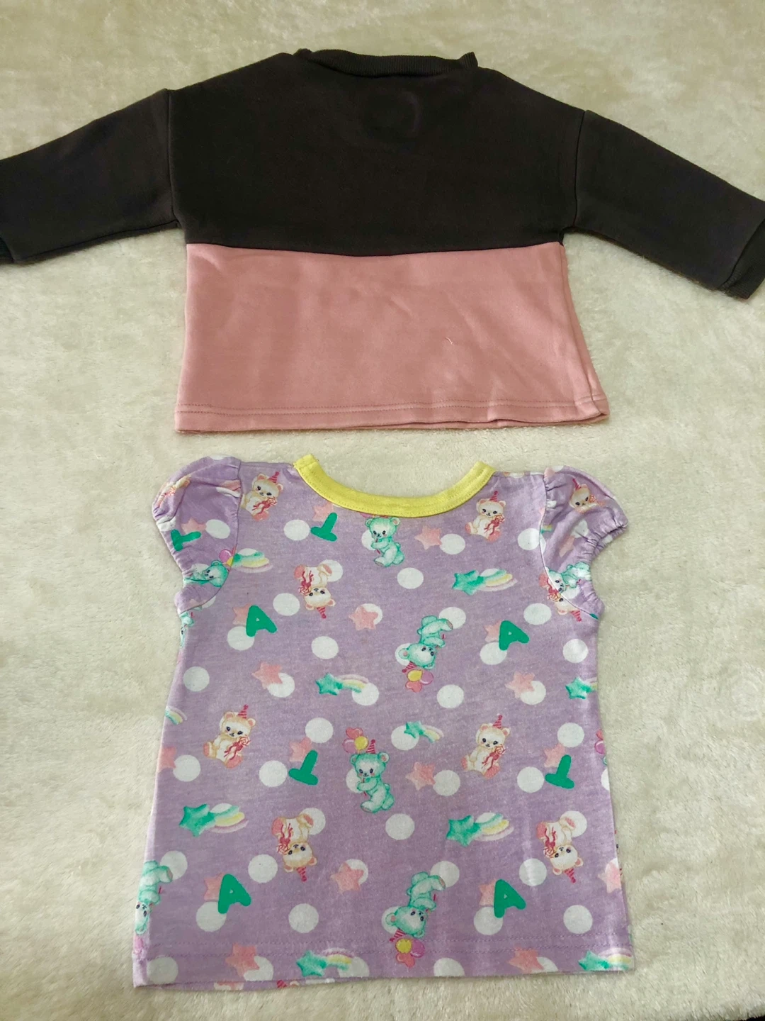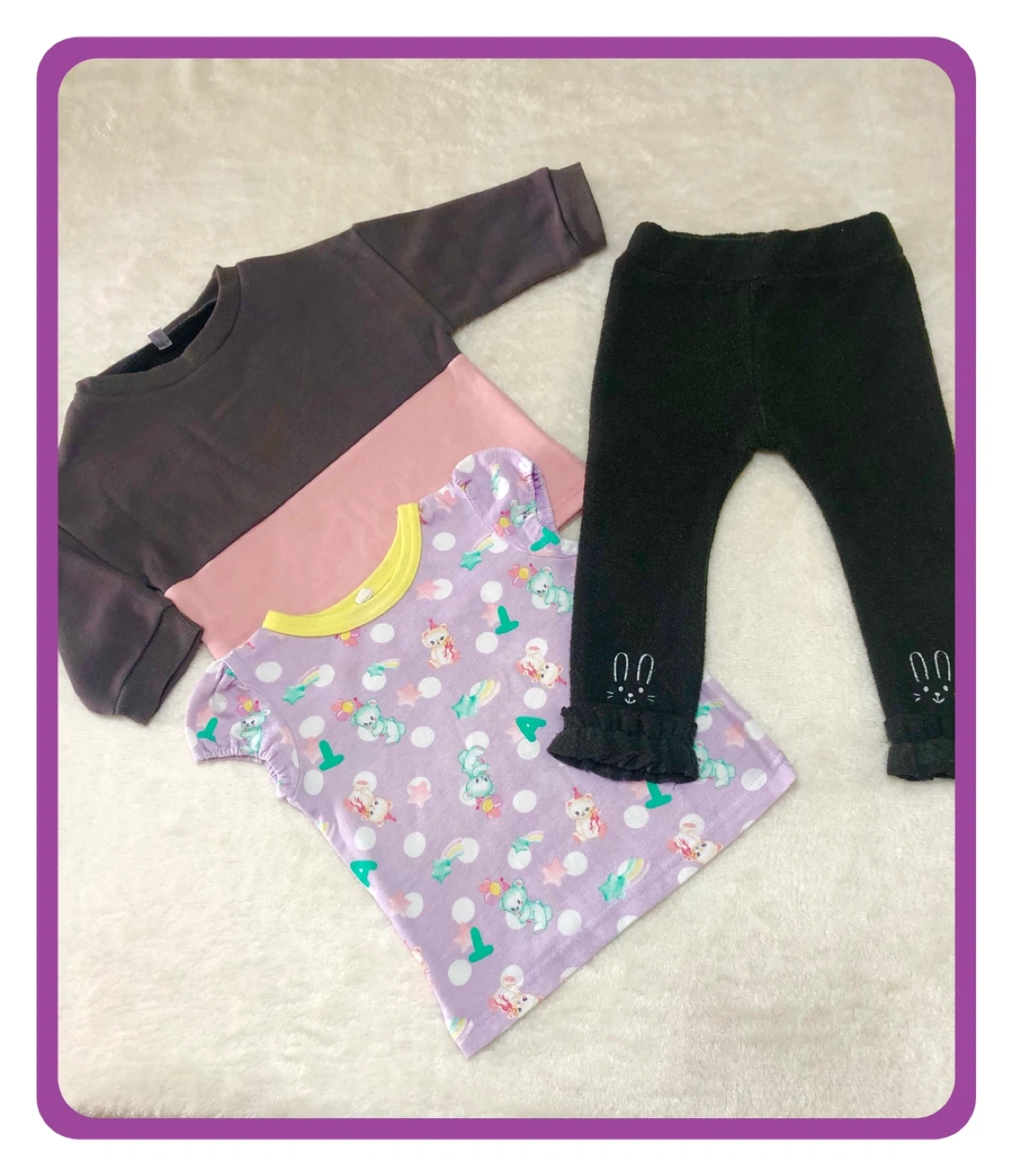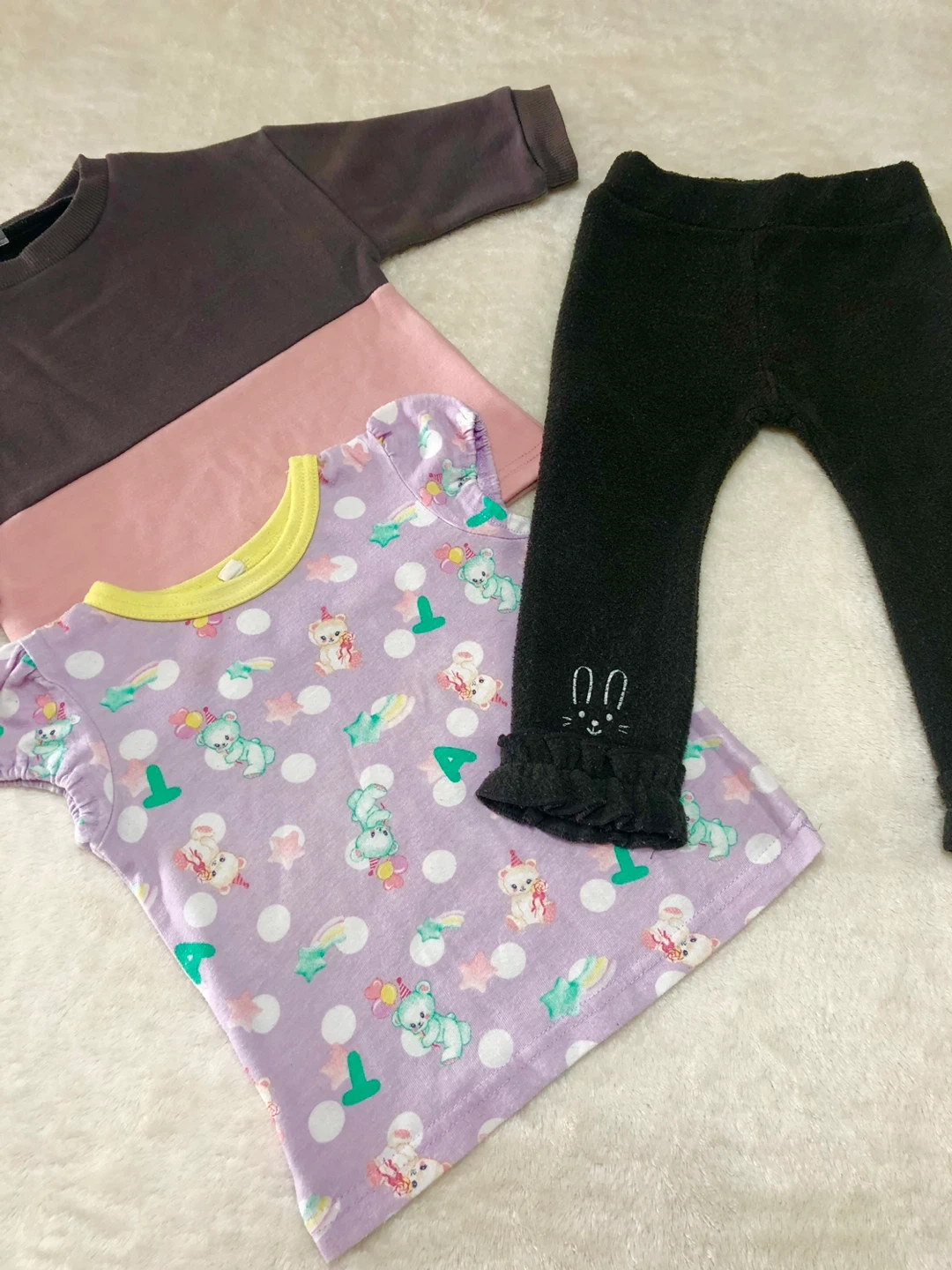 子供服3点セットです ・サイズ:80 ・色:トップス(茶色、ピンク、紫)、パンツ(黒) ・パンツにウサギの刺繍あり