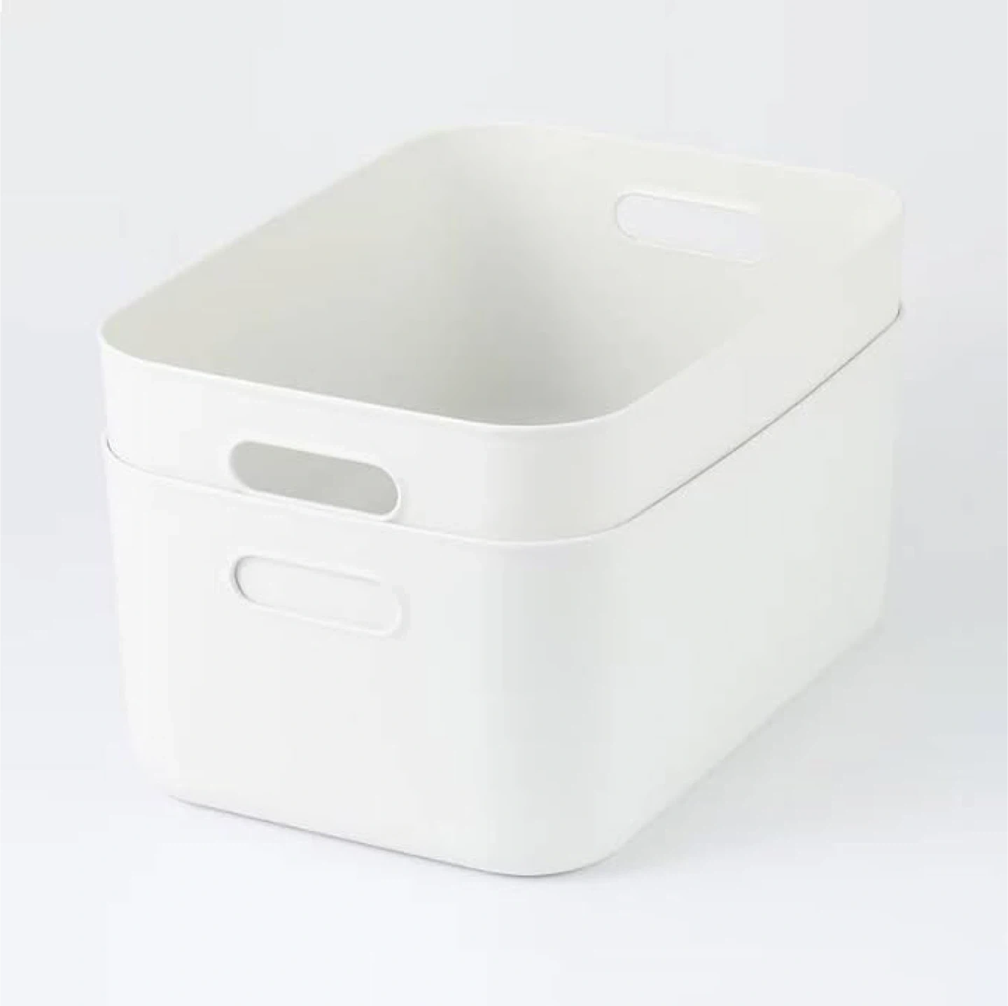 現行販売品です。 画像3.4がお渡しする現品です。 ⚠❣蓋は付きません 蓋をご希望の時は別途1枚につき200円で、2枚までご用意出来ます。 ブランド:無印良品 サイズ:約25.5cm×36cm×高さ16cm 【状態】 使用感少なめ 大きな傷や汚れは見当たりませんが、あくまで中古品であることご了承ください 多摩地域、杉並区、所沢市はお近くのスーパーやドラッグストアの駐車場までお届け&お取引可能です。 チャットでお気軽にご相談ください
