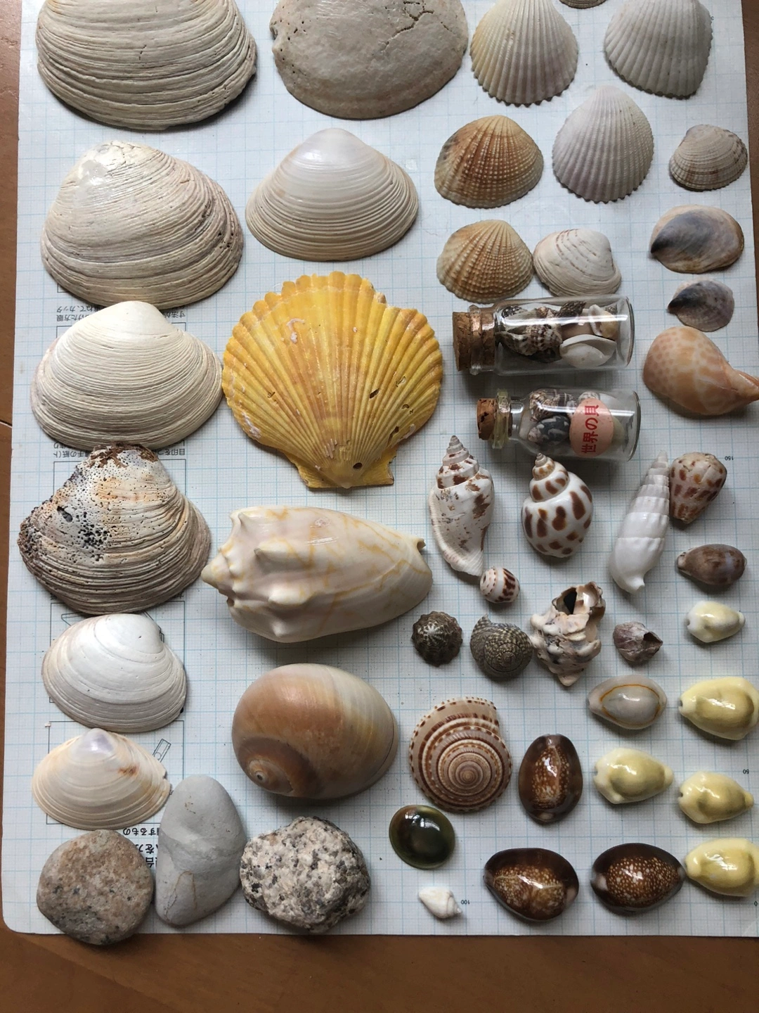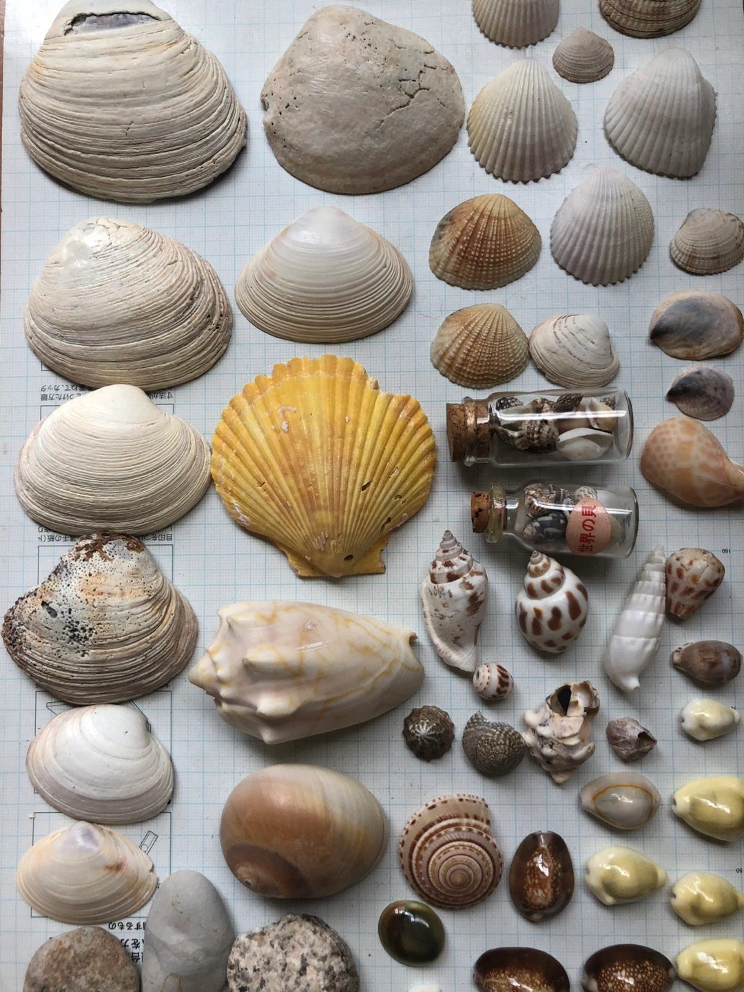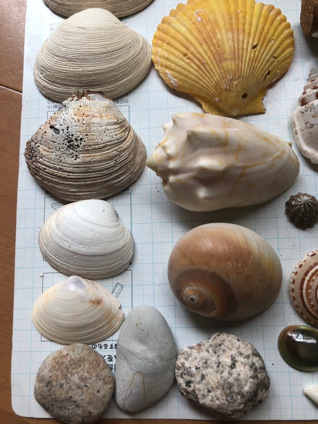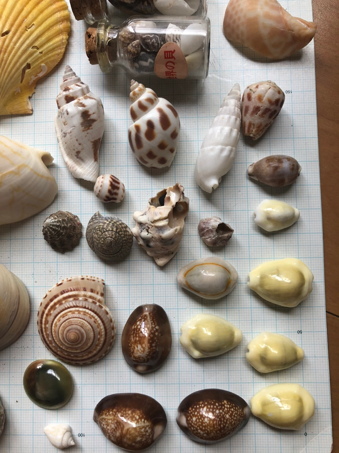 あたたかさ貝 貝殻 石3個 最初の写真が全てが写る写真です 1センチますの方眼紙の上で撮ってます 左下に小石3個も有ります 何個かは欠けてるの有ります 宜しくお願います 自宅3階