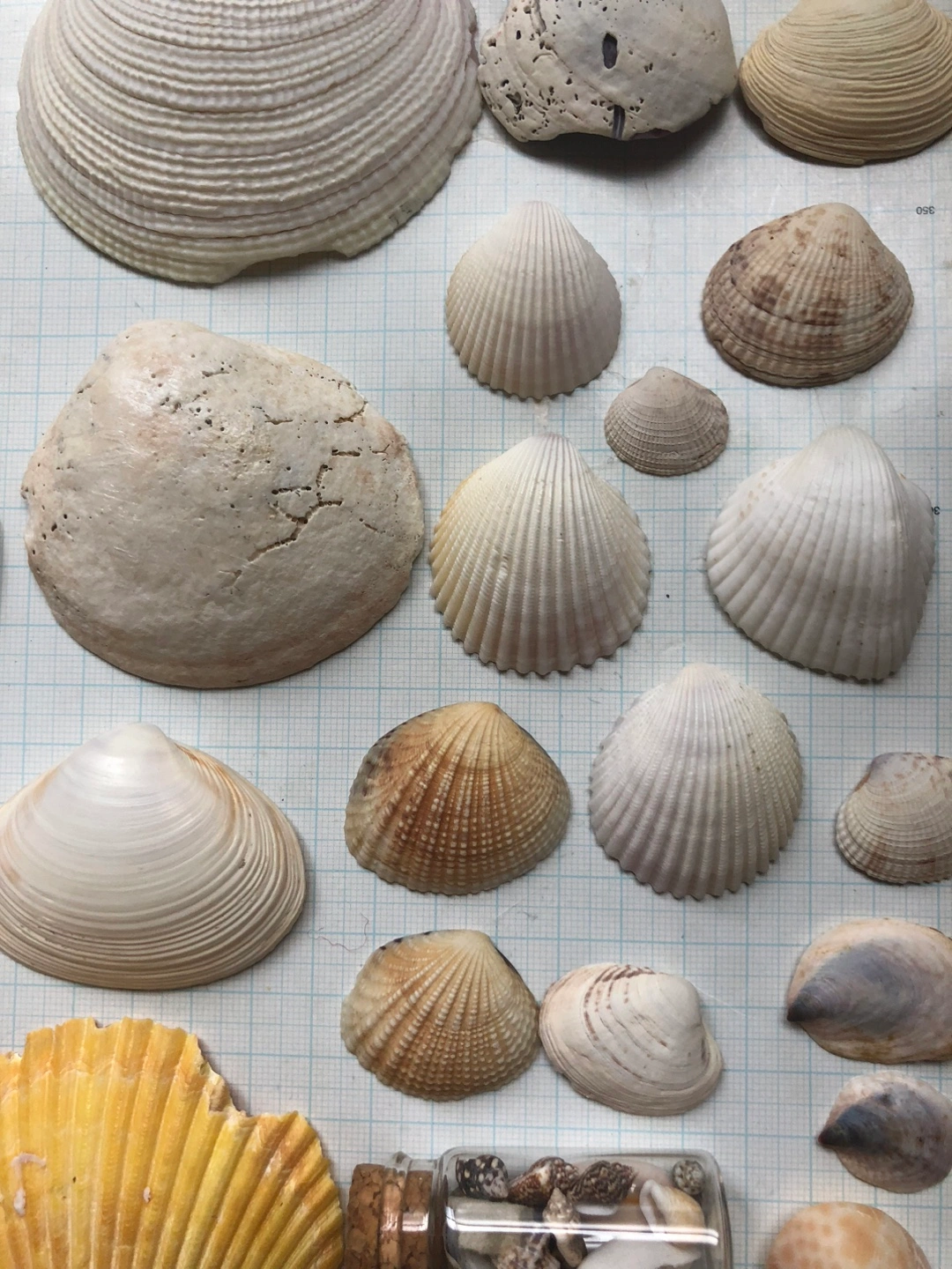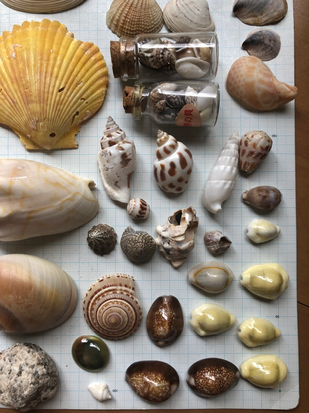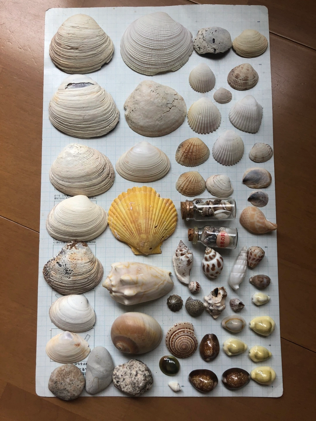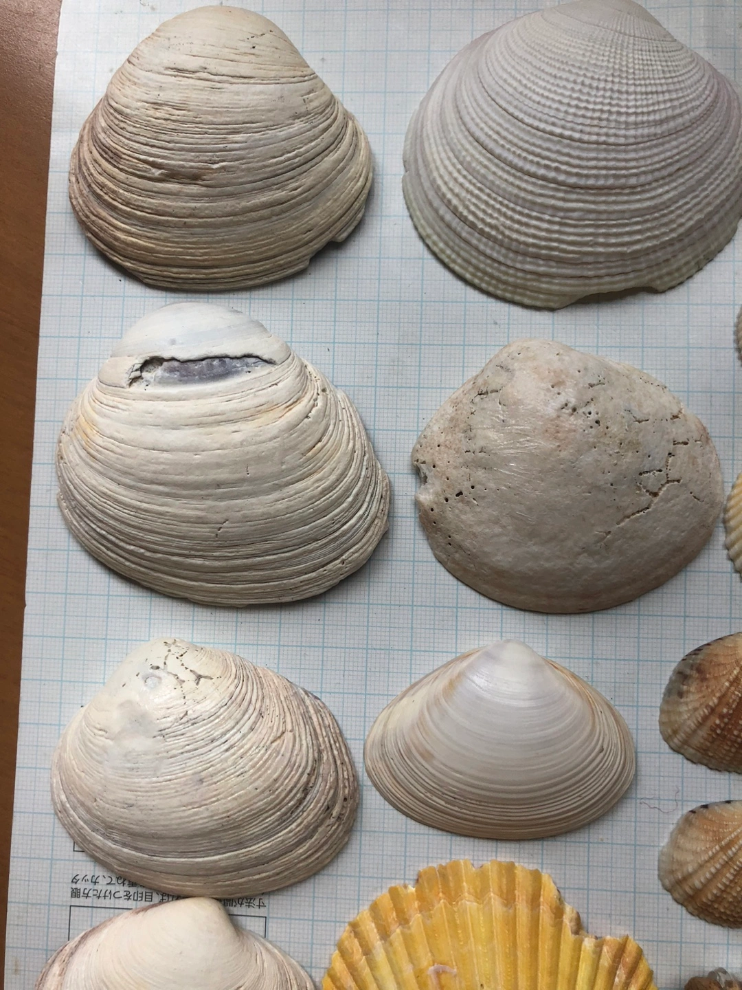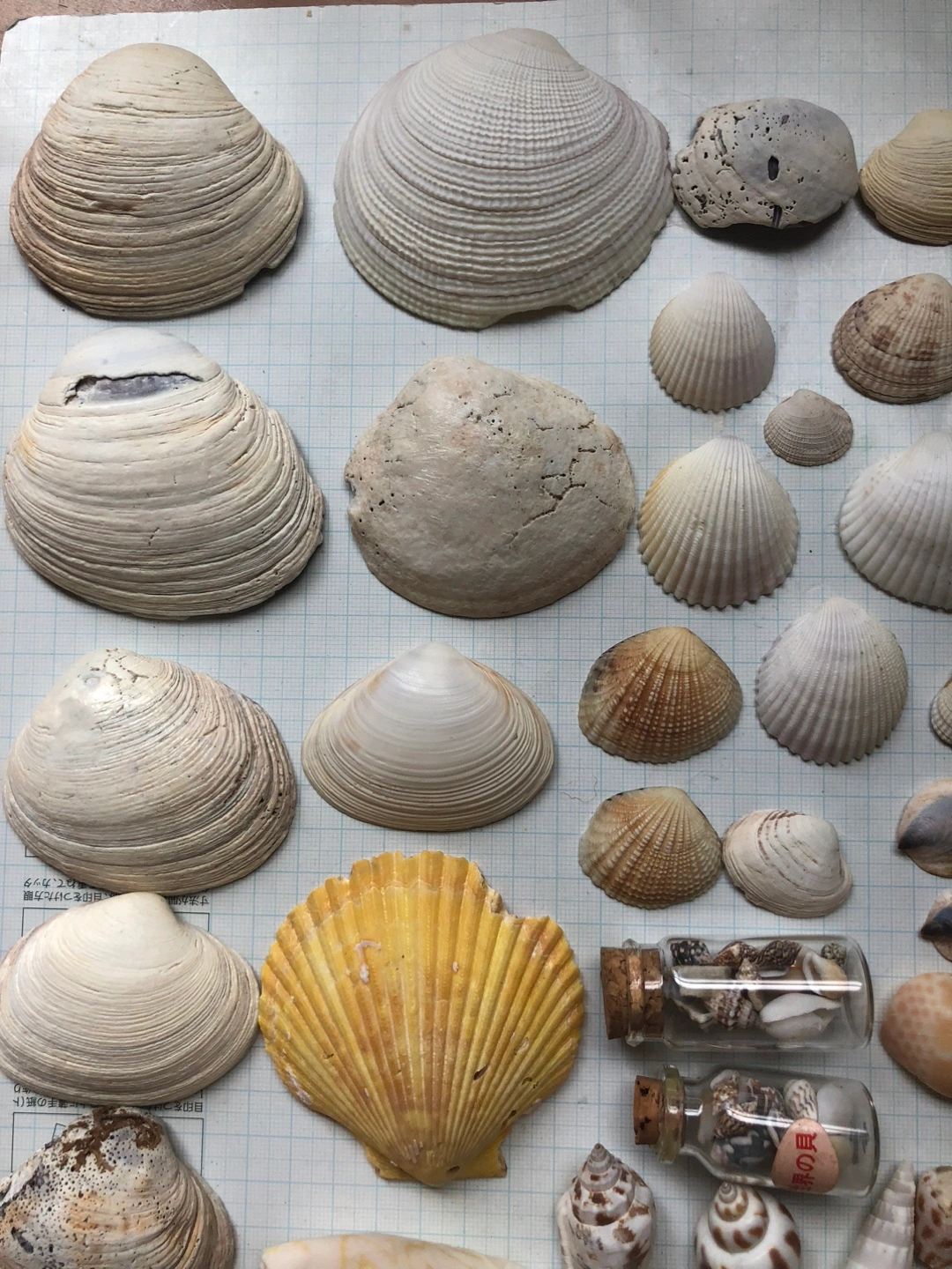 あたたかさ貝 貝殻 石3個 最初の写真が全てが写る写真です 1センチますの方眼紙の上で撮ってます 左下に小石3個も有ります 何個かは欠けてるの有ります 宜しくお願います 自宅3階