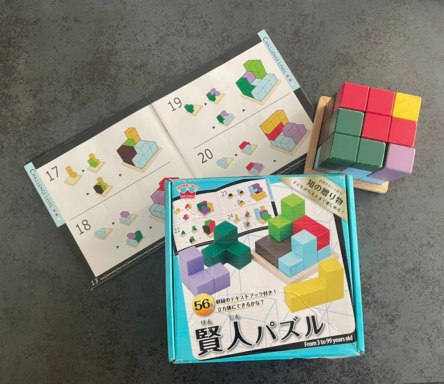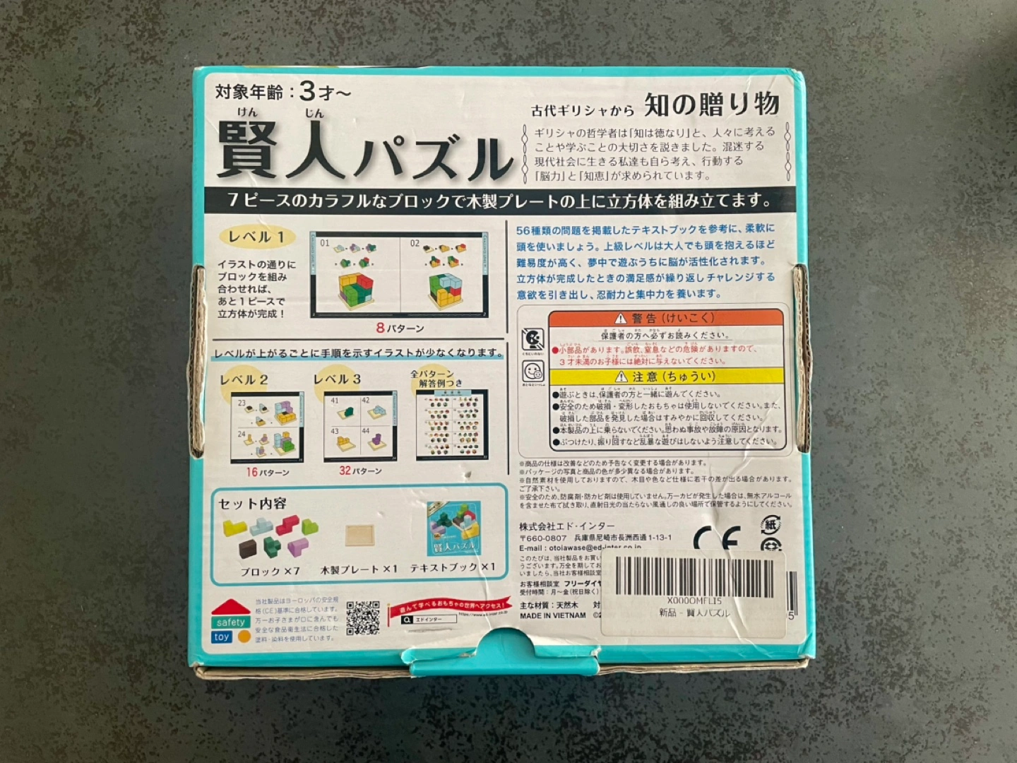 「 賢人パズル 」 知育玩具 参考価格 : 2750円 ・ブロック ×7 ・木製プレート ×1 ・テキストブック 子供の使用したものですので使用感は否めませんが まだまだ使っていただけると思います。 お箱の潰れ部分はテープで修正しています。