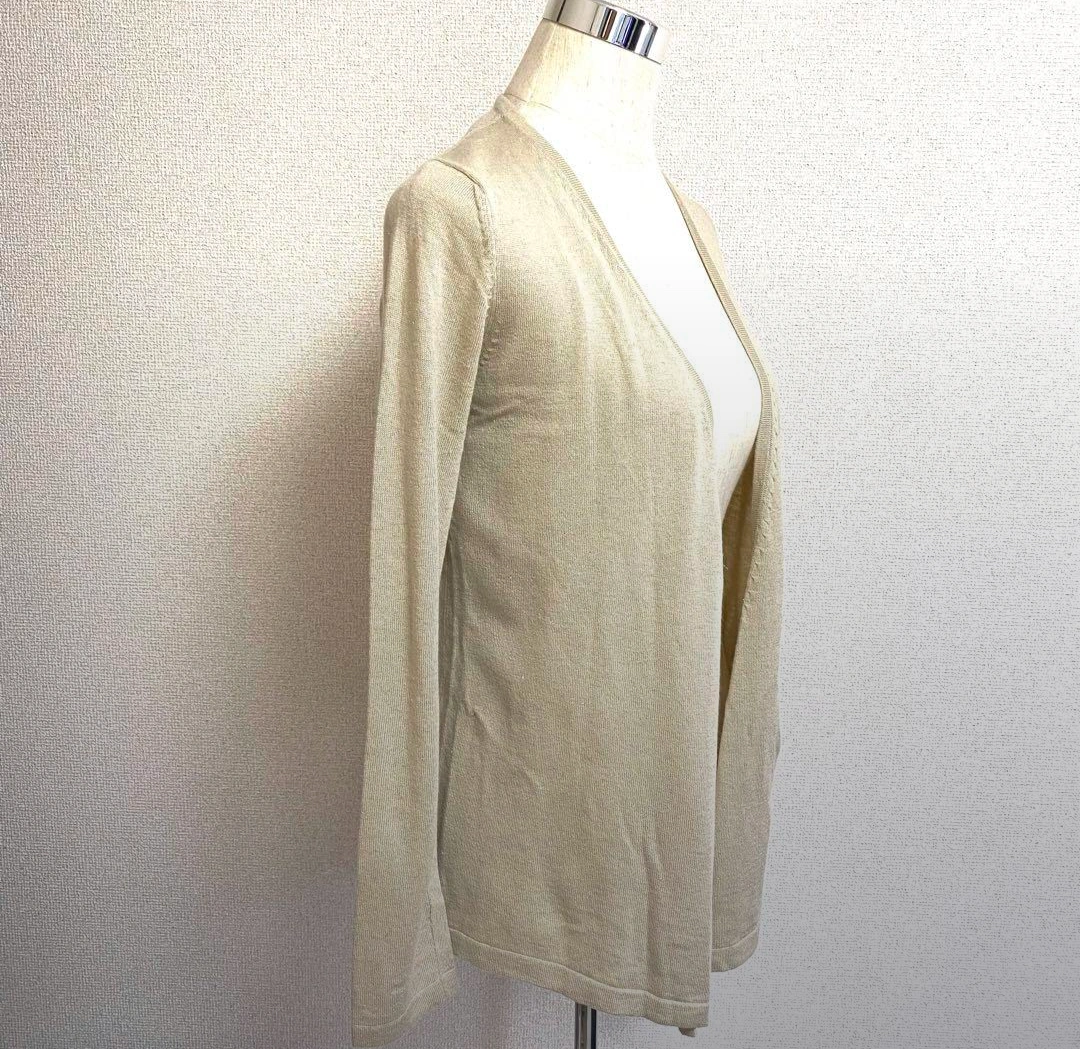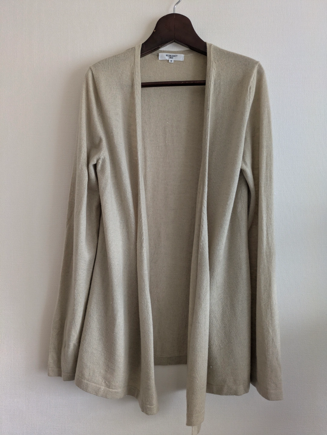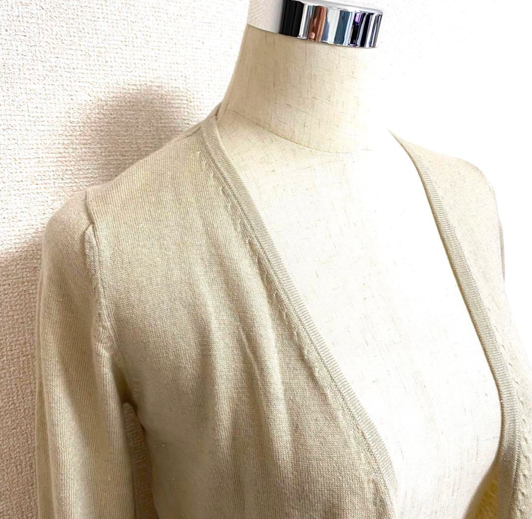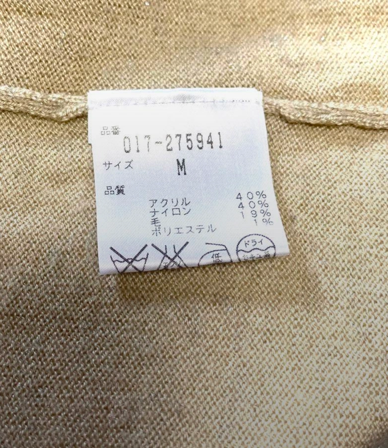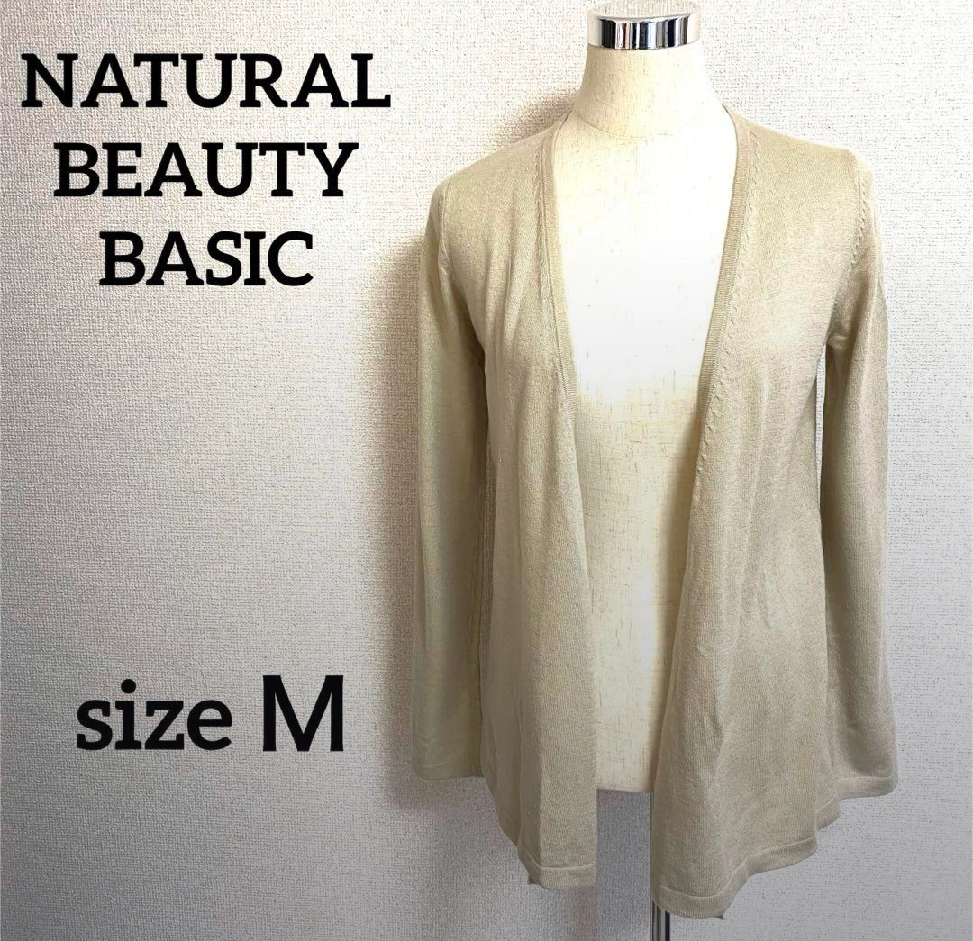 Natural Beauty Basic ナチュラルビューティーベーシック/ニット カーディガン 長袖 薄手 ベージュ M オープンフロント タグは外しましたが、試着程度の新品です。 今の季節の羽織りにいかがでしょうか。 ボタン無し、前方がすこし長くなっていて、 ひらりと素敵です。 控えめラメのカーディガンで、お上品な華やかさがあって素敵です。 (写真ではうまく映しきらないのですが、実際はもう少し全体に細かいラメ感があって、光が当たると控えめにきらきらします) ブランド:NATURAL BEAUTY BASIC サイズ:M カラー:ベージュラメ 素材…アクリル40%、ナイロン40%、 毛19%、ポリエステル1% ◉平置き実寸サイズ(cm) 肩幅:33 身幅:43 着丈:67 カラー···ベージュ 袖丈···長袖 季節感···春、秋 着丈···ミドル