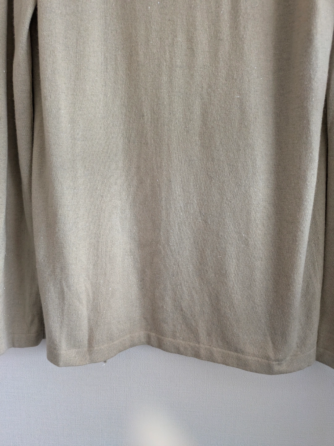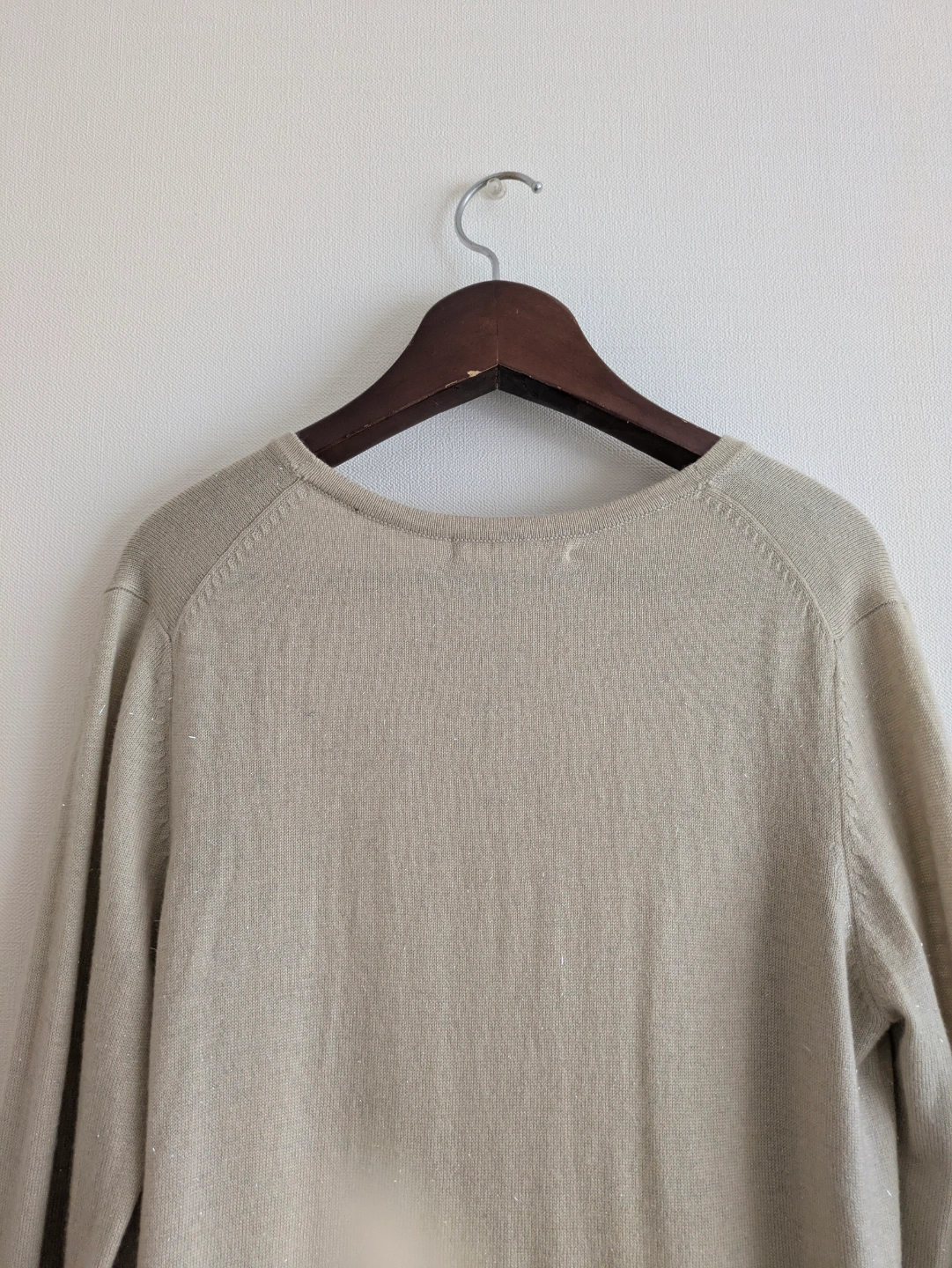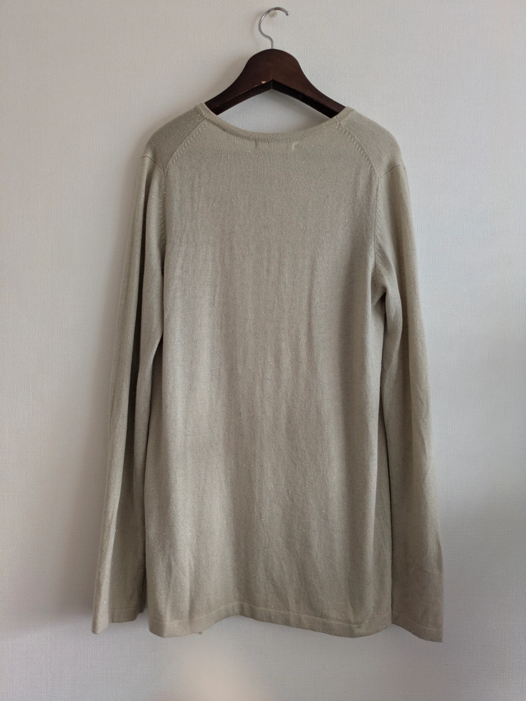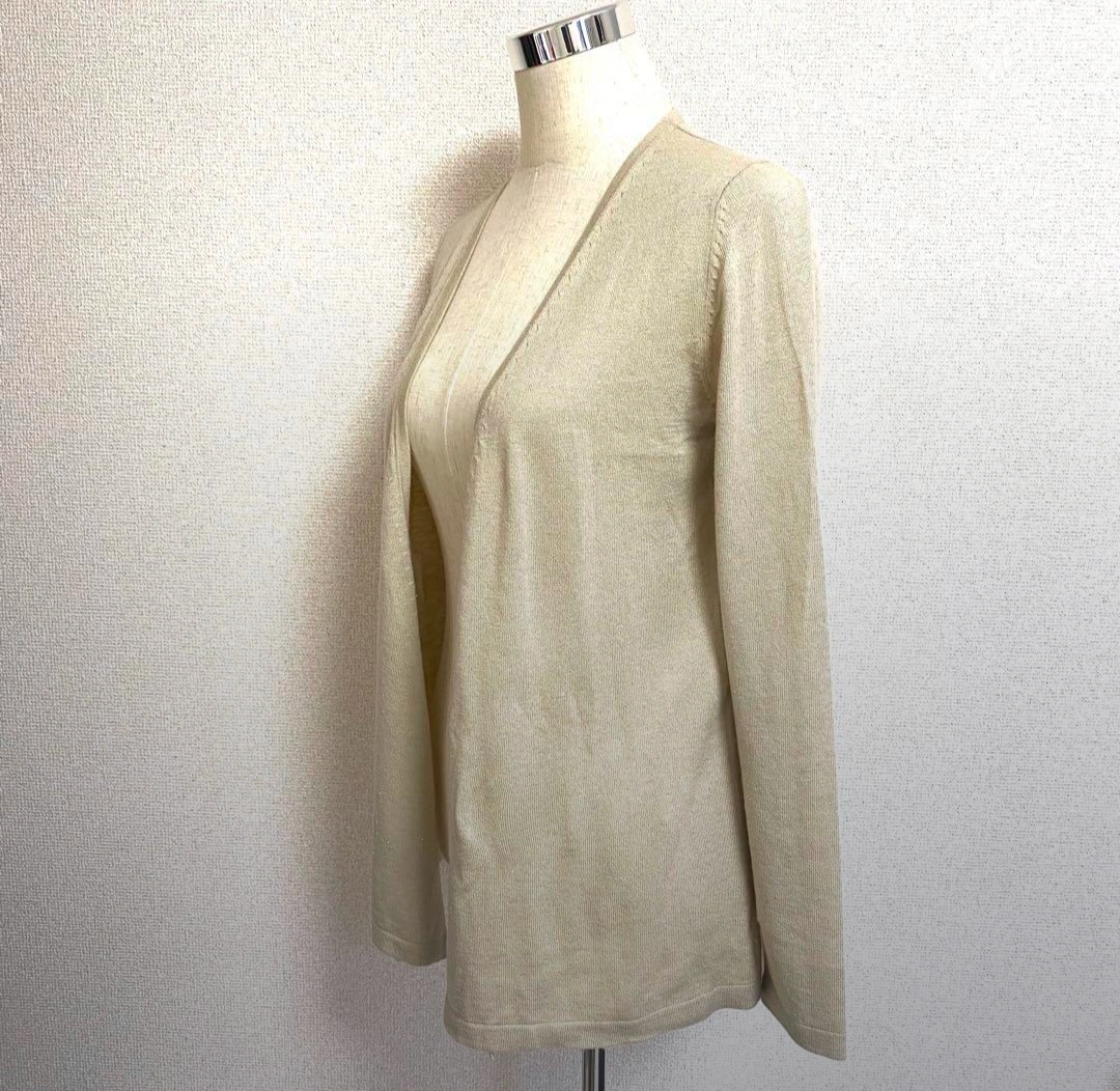 Natural Beauty Basic ナチュラルビューティーベーシック/ニット カーディガン 長袖 薄手 ベージュ M オープンフロント タグは外しましたが、試着程度の新品です。 今の季節の羽織りにいかがでしょうか。 ボタン無し、前方がすこし長くなっていて、 ひらりと素敵です。 控えめラメのカーディガンで、お上品な華やかさがあって素敵です。 (写真ではうまく映しきらないのですが、実際はもう少し全体に細かいラメ感があって、光が当たると控えめにきらきらします) ブランド:NATURAL BEAUTY BASIC サイズ:M カラー:ベージュラメ 素材…アクリル40%、ナイロン40%、 毛19%、ポリエステル1% ◉平置き実寸サイズ(cm) 肩幅:33 身幅:43 着丈:67 カラー···ベージュ 袖丈···長袖 季節感···春、秋 着丈···ミドル