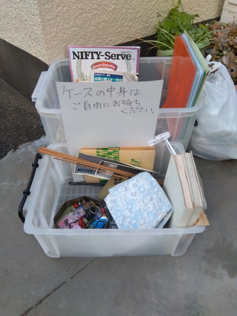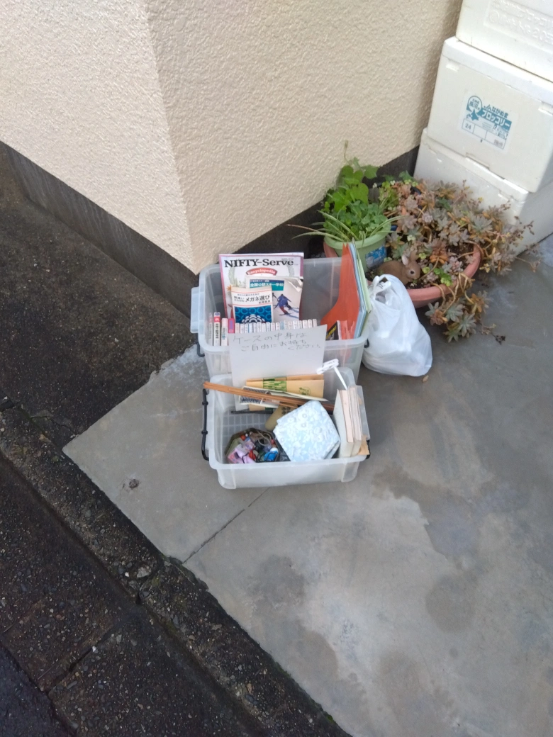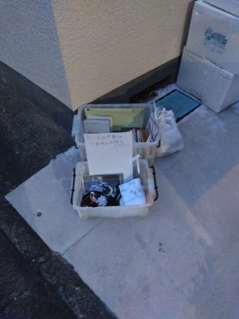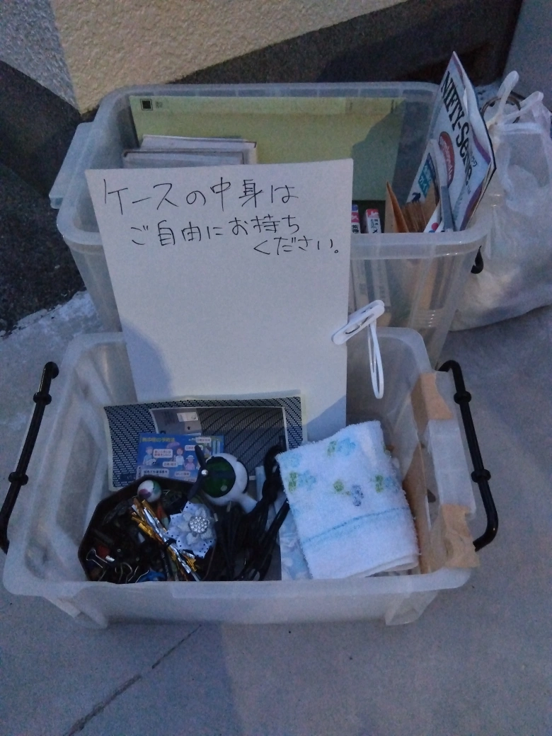 ここは跡地です。 記事上げには15回の制限があるため、 この出品記事は役目を終えました。 お気に入り登録などは最新の出品記事へどうぞ! ↓大まかな履歴ですが、記載なく追加している物もあります↓ (6/16 おもちゃや小物を中心にいろいろ追加) (6/7 クリアファイルやイヤホンなどいろいろ追加) (6/4 枕カバーやゲームコントローラーなどいろいろ追加) (5/28 防音テープや髪留めなどいろいろ追加) (5/15 キャロットの売れ残りなどいろいろ追加) (5/3 キャロットの売れ残りなどいろいろ追加) (4/29 プルバックカーなど小物をいろいろ追加) (3/20 書籍や雑貨などいろいろ追加) (●冬の間、寒かったので公開を一時停止していました●) (11/27 書籍を大量と小物などいろいろ追加) (11/26 キャロットでの売れ残りや小物などいろいろ追加) (11/9 キャロットでの売れ残りや書籍などいろいろ追加) (11/4 書籍などいろいろ追加) (10/26 下敷きとノートPCのソフトケースなどいろいろ追加) (10/20 おもちゃと小物をいろいろ追加) (10/16~4/29 中略) (4/26 大量にチョロQ/プルバックカーを追加。シリーズでまとめたりはしていないのでよく見てください) (4/25 キーホルダーや小プラモを中心にいろいろ追加) (4/20 細かな物をいろいろ追加して画像更新) ボックスの中身はご自由にお持ちください。 (入っているものであれば、傘でもケースでも全部含みます) 早い者勝ちなので、画像の物が残っている保証はありません。 中身は随時追加しているので、画像に映ってない物が増えている可能性もあります。 横に付いている袋は「持ち帰り用に限り」使用してかまいません。 設置場所:江古田4丁目6番地 沼袋地域センターから新青梅街道を挟んで目の前の路地入ってそのまま進み、向かって左手側。 (家の前のスペースの都合で、近所に協力いただいてます。散らかしたり騒いだりなどの迷惑をかけないようにお願いします) 常時は設置していません。 雨の予定のない日のみで、夜は一時的に片付けている場合もあります。 基本的にはエコバッグなどの入れ物は各自で用意をお願いします。
