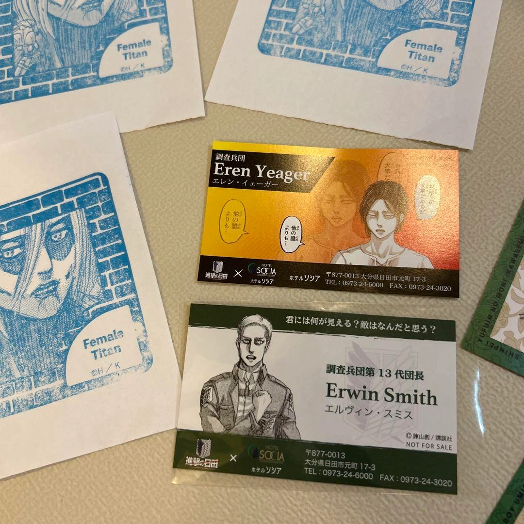 進撃の巨人 進撃の日田 Hotelソシア 非売品 ★エレン リヴァイ ★エルヴィン スミス 名刺カード2枚 ゆふいんの森 ポストカード4枚 進撃の巨人スタンプおまけ 未使用品 ご希望の方はお気軽にご連絡ください。