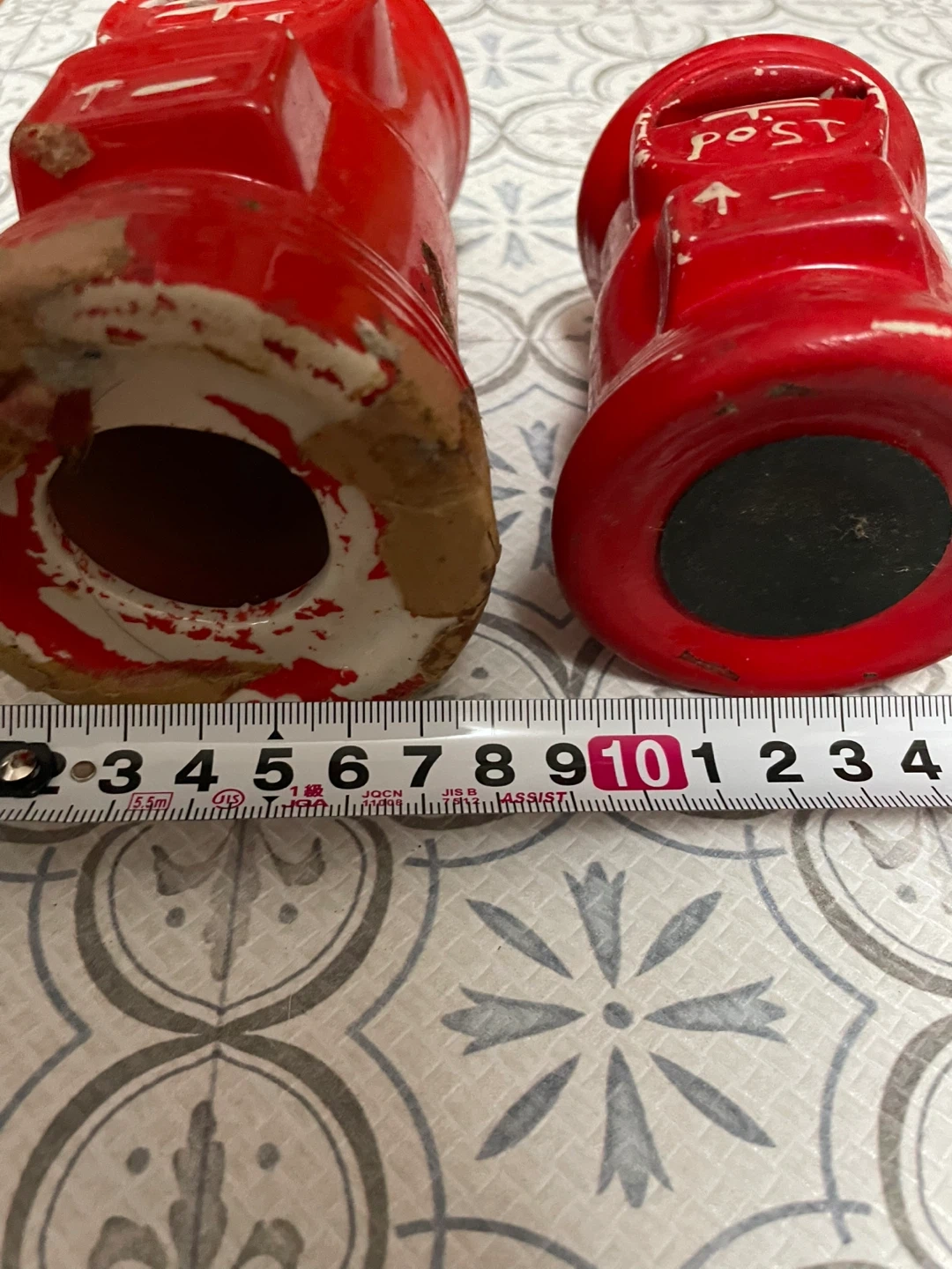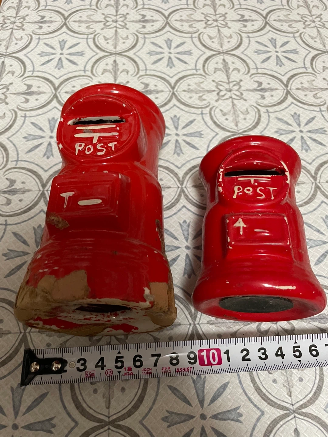 郵便ポストの貯金箱2個セットです ・色:赤 ・サイズ:大(高さ約12cm)、小(高さ約9cm) ・「POST」と記載 ・使用感、傷あり 中古品であることご了承ください