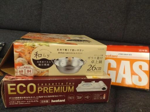鍋、カセットコンロ、ガスボンベのセットです。 ガスは3本入りですが、1本は残りわずかです! 受け渡しについてプロフに記載していますのでご確認ください。 ※猫を飼っています。お渡し時に猫の毛がついていることがあるのでご了承ください。 鍋のみ、またはカセットコンロのみもOKです。その場合、半額でお願いします。 ご希望の方はお気軽にご連絡ください。