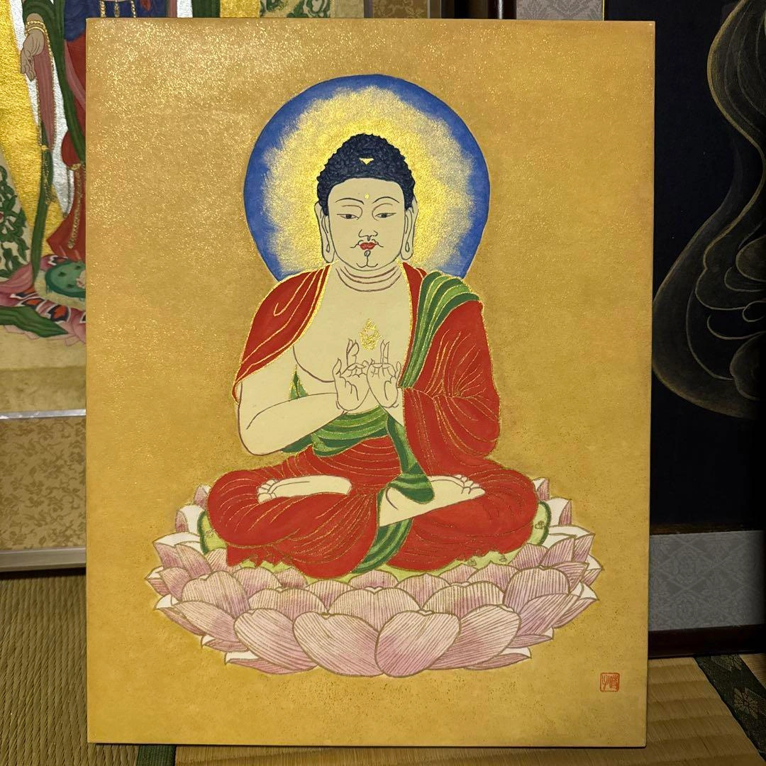 阿弥陀如来を描いた仏画、絵画です。 女流仏画師 安達原玄の弟子の作品です。 絵の先生をしていましたが、あくまで素人作品のため雰囲気を楽しみたい人向けです。 - サイズ:縦41cm×横32cm×厚さ2cm - 主題: 阿弥陀如来 - 素材: 木製フレーム ご覧いただきありがとうございます。 ジモティもやってます。 ご希望の方はお気軽にご連絡ください。