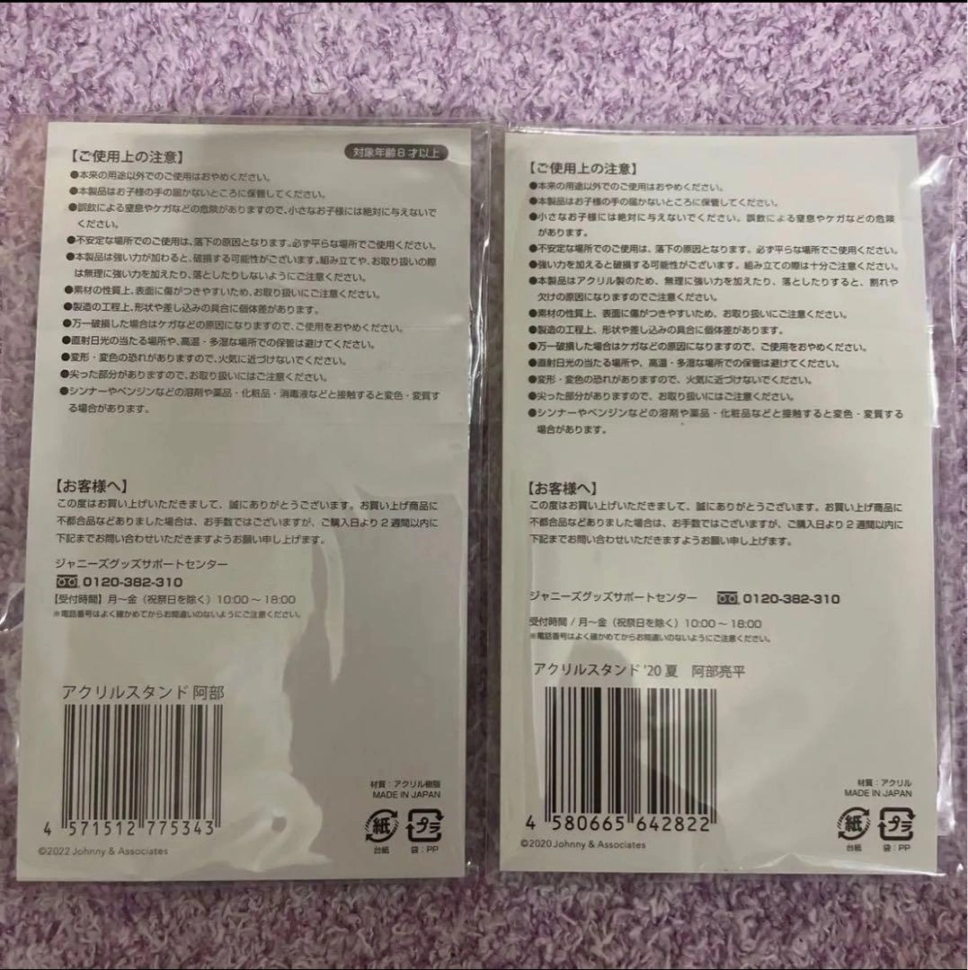 ご覧いただきありがとうございます! SnowMan 阿部亮平さんの2020年と滝沢歌舞伎のアクスタ2点セットです。 両方とも初期不良の確認のために開封しましたが新品です(^ ^) どちらも目立った傷や汚れ等はなく綺麗な状態です。購入後、暗所にて保管しておりました。 よろしくお願いいたします。