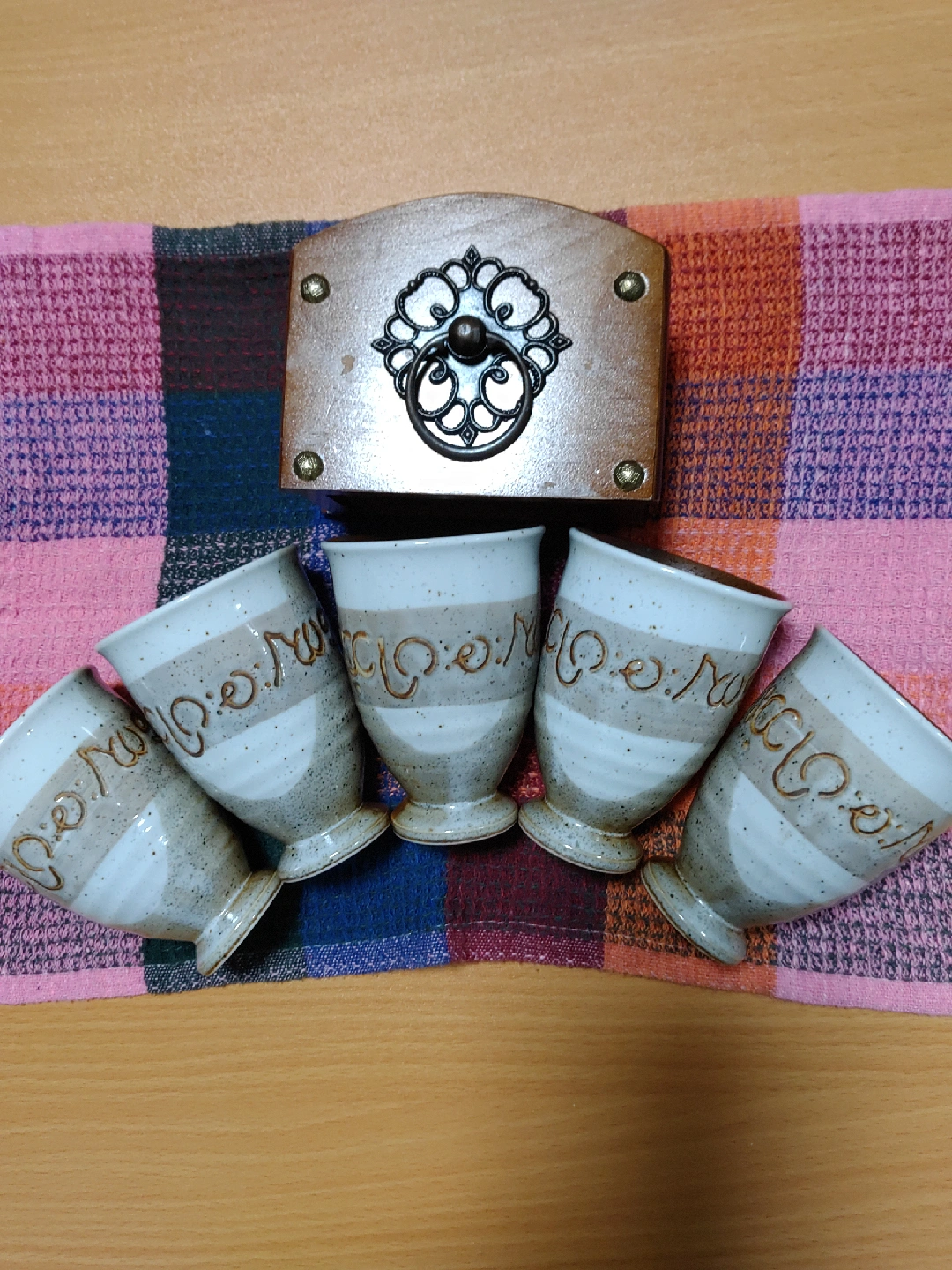 ご覧いただきありがとう御座います💫 内容 :焼き物風の個性的なコップ5点セット+コースター収納BOX付きです。🌟 😂BOXの表面には色ハゲやスレ がありますので、その点をご 理解頂ける方のみお願い致し ます。🙏 💡コップ:茶色・グレー・白の 絶妙な色合いで、手作りの温 かみと味わいがあります。 さらに、アラビア語風の文字が描かれており、とてもユニークでおしゃれなデザインです。 普段使いはもちろん、ちょっとしたティータイムにも雰囲気を楽しめます。 ⚡ご了承の上ご検討をお願い致 します。🙏 💌ご不明な点が御座いましたら お気軽にお問い合わせくださ い。